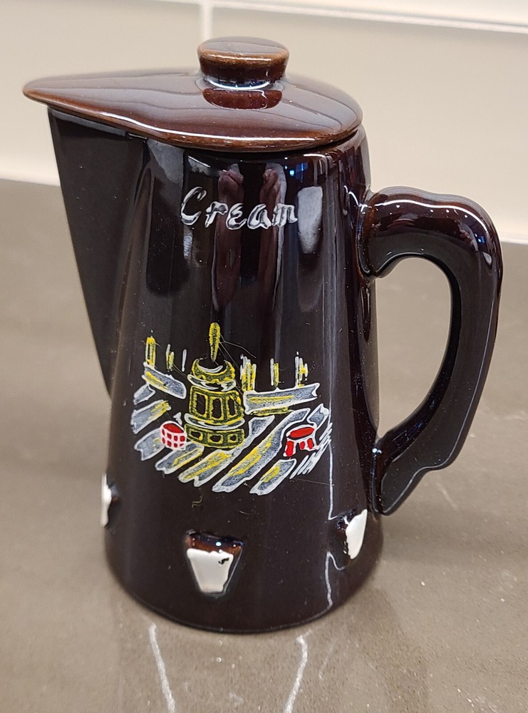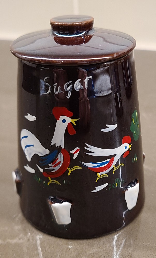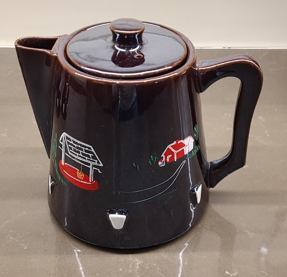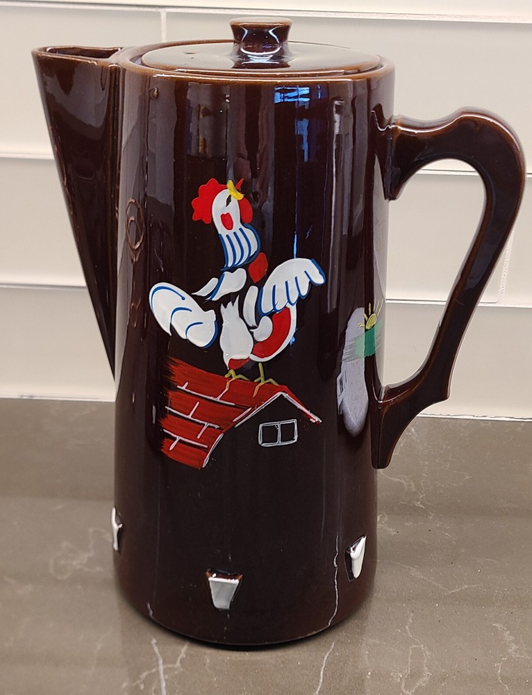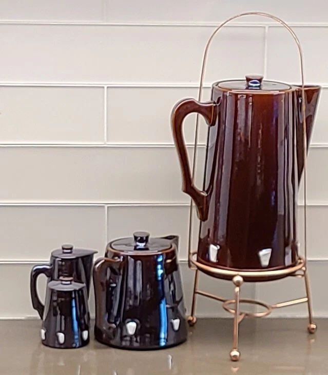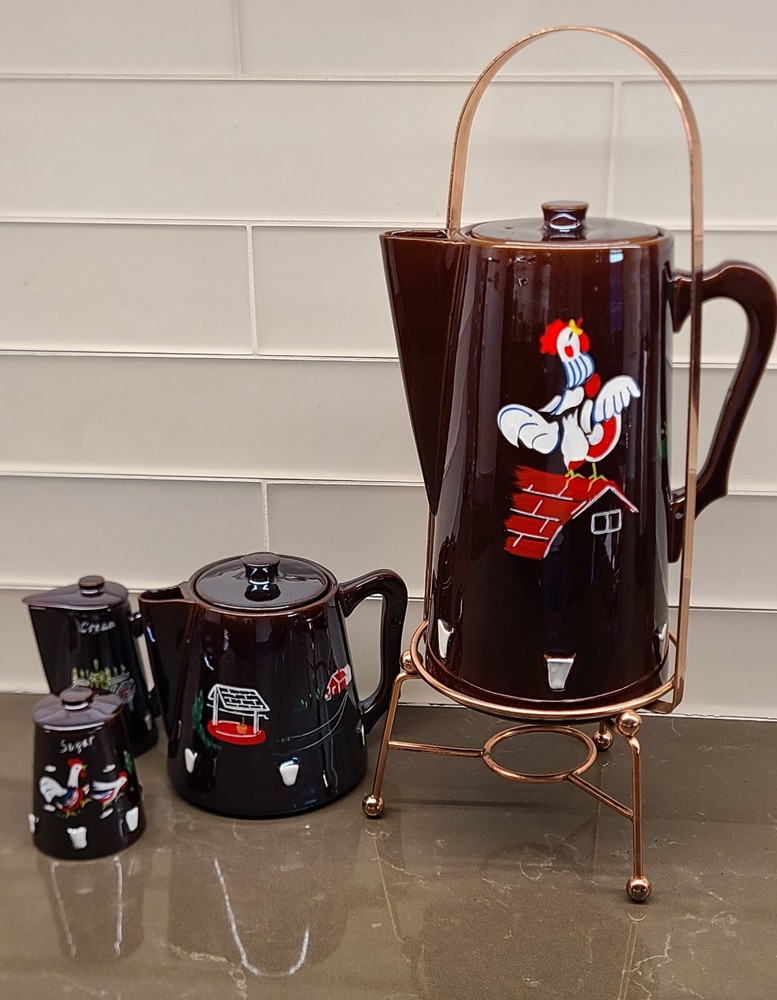 This Cal-Pacific Imports Rooster Farm Coffee Pot & Tea Set is a unique with it's mid-century design. This set has been boxed in storage since 1959 and was used only once prior to storing. The set includes a coffee pot, tea pot, sugar, creamer (all with lids), copper tone coffee pot holder with matching votive candle holder (not shown). No chips, scratches or marring. The brown color and angular style makes this truly vintage. The material used is ceramic and porcelain, all made in Japan with Original Design branding, copyrighted 1955. Sold as is, no warranty, no returns.