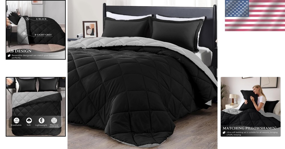 This comforter set is incredibly soft and cozy, making bedtime feel luxurious. The reversible black and grey design is elegant and versatile, matching any bedroom decor. The plush material keeps you warm without being too heavy, perfect for year-round comfort. The included pillow shams add a polished finish to the bed. Washing is easy, and it holds up well after multiple washes. The size fits a California king perfectly without slipping or bunching. Definitely worth the investment for a stylish, comfortable upgrade!