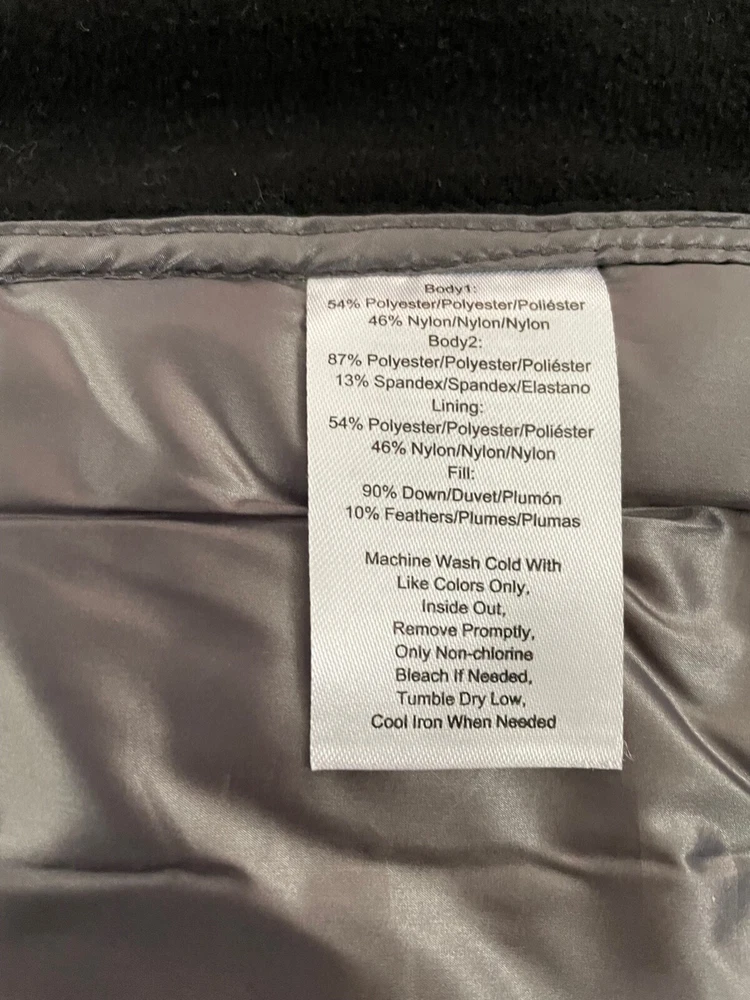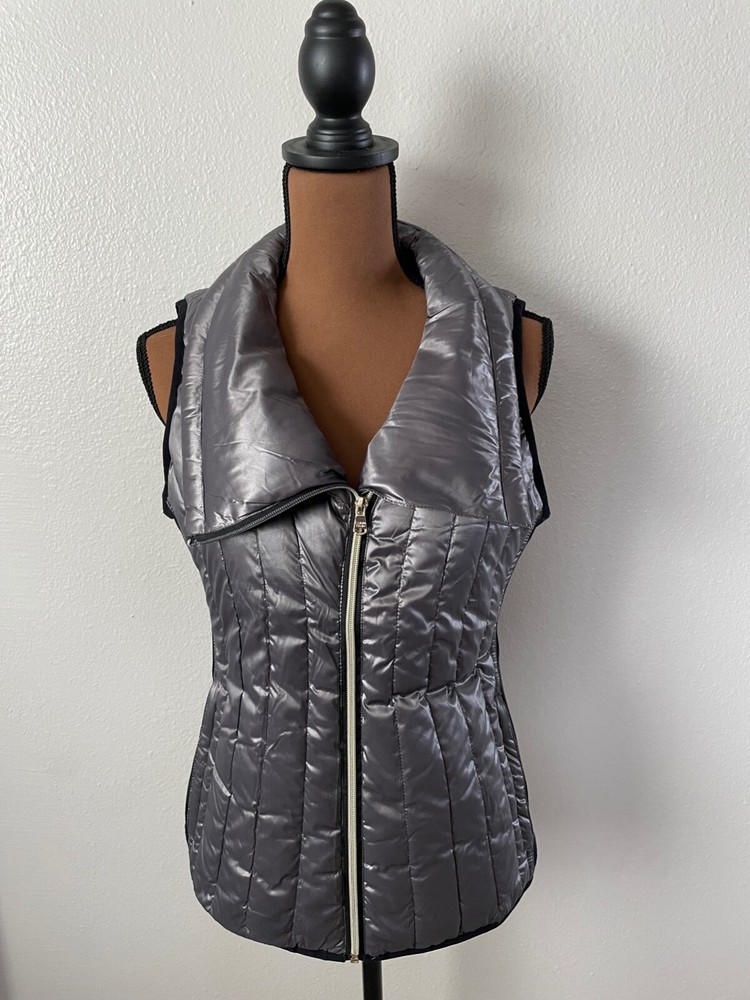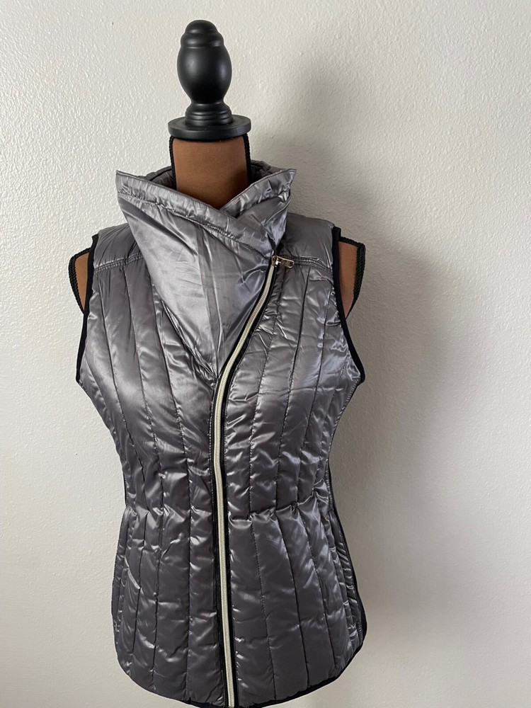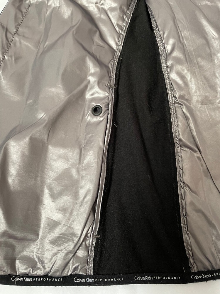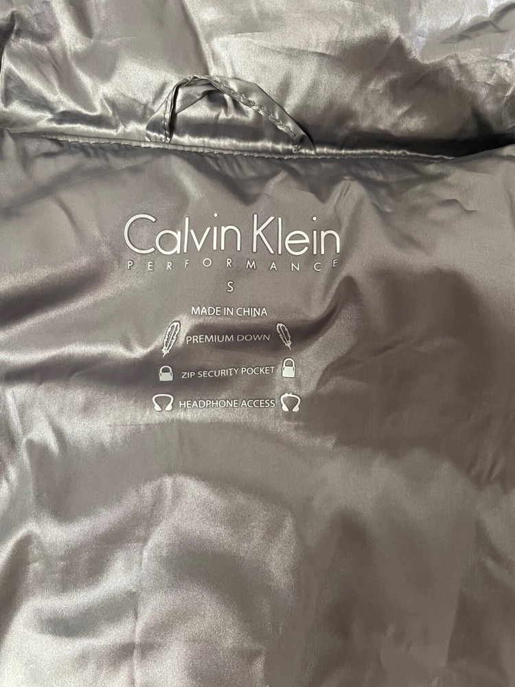 Calvin Klein size small performance puffer vest with 90% down fill. Silver gray with black stretch fabric sides. Open or funnel neckline with zip front. Side zip pockets with a headphone access on interior side of vest. Very good condition with no damage or stains.