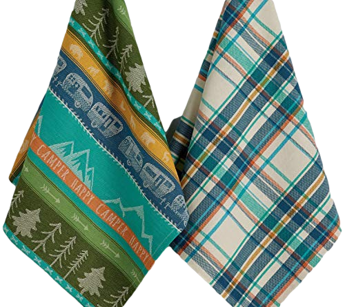 Camping/RV dish towels, 1 of each design - Happy Camper Jacquard weave with matching Plaid towel Common uses; camper dish towels for travel trailers, hand towel for kitchen & bath, camping kitchen decor, dish drying towel. Each towel is 100% cotton, machine wash cold. Sewn in loop for hanging when not in use; each towel measures 18 x 28 inches.