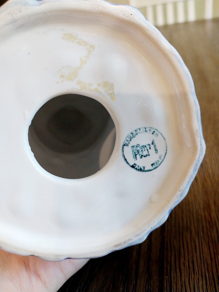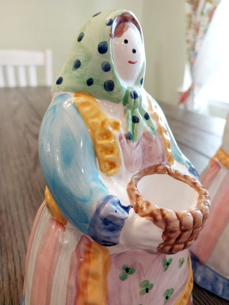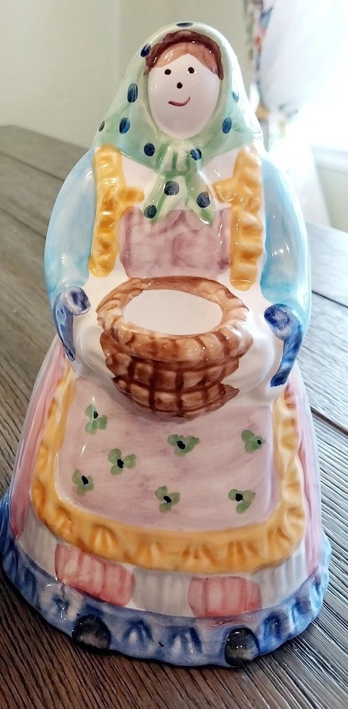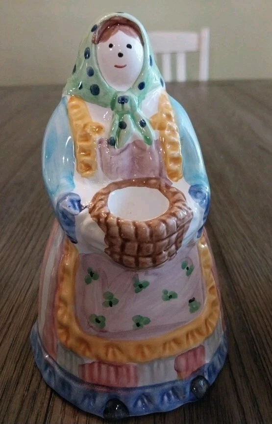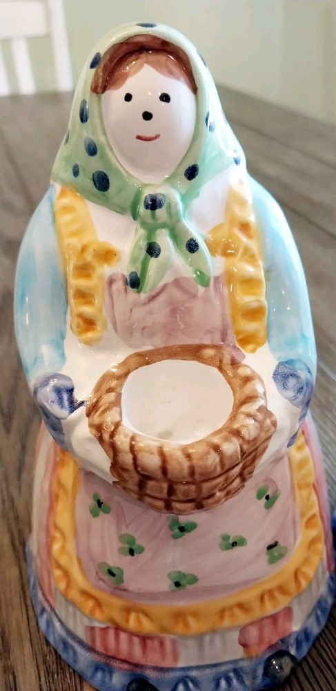 This beautiful candle holder from Pier 1 Imports is a perfect addition to any home decor. With its hand-painted, multicolor design featuring a woman farmer and a basket, this ceramic candle holder has a country style that will fit any occasion. Measuring 7 inches in length and 7 inches in height, with a width of 3 inches, this original, made-in-Italy piece is a unique and charming decorative collectible. The glazed finish adds to its elegance, making it a great gift for any lover of Farmer Country Woman theme.