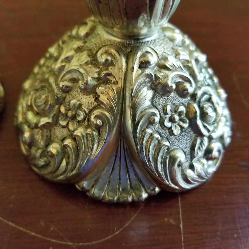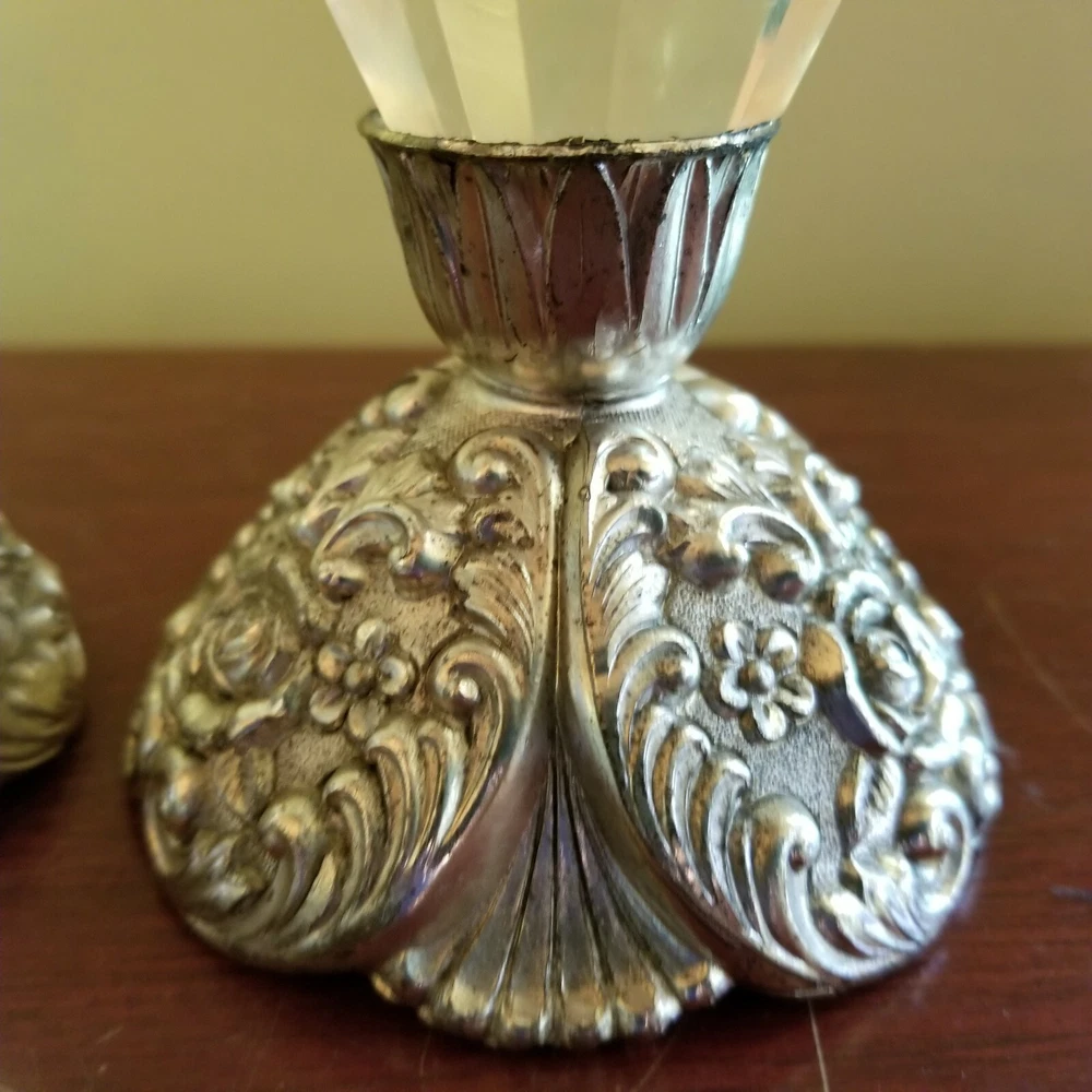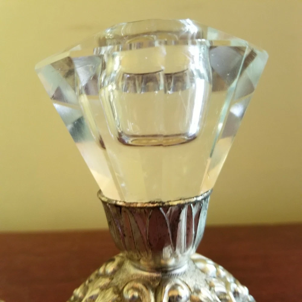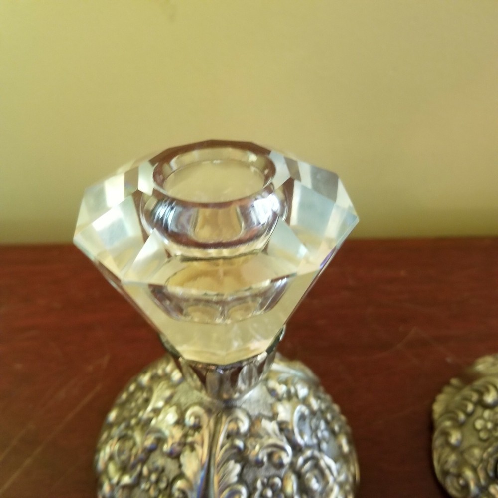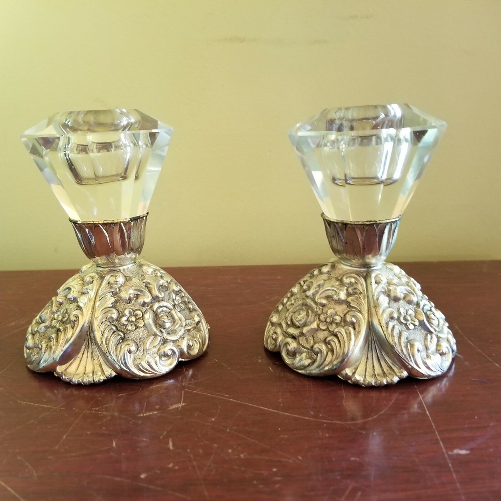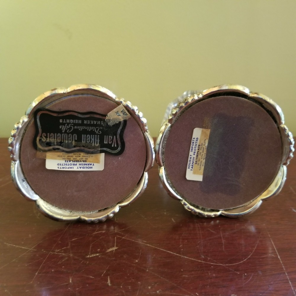 Silver plated and Glass set of 2 Holiday Imports candle holder. They measure approx 4.5'' tall and the base is approx 3 5/8'' in diameter. Purchased from an estate sale, is in pre-owned condition