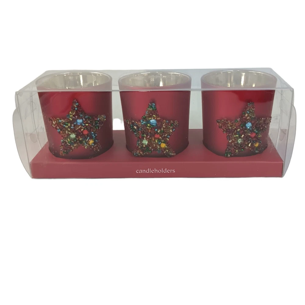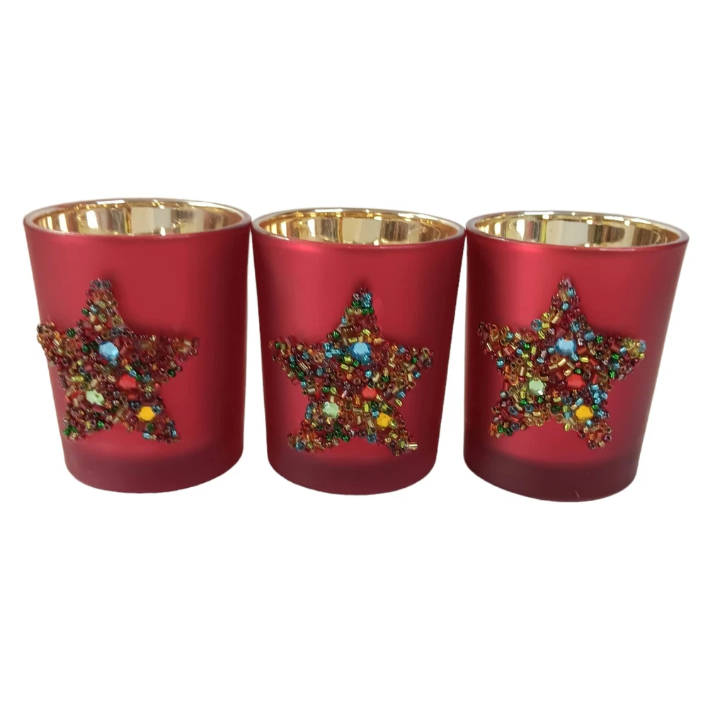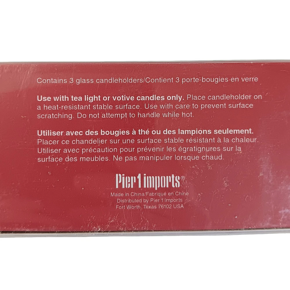 Pier One Glass Candleholders Red Frosted Star Bead Design Three in a box New in box Approximately 2.5" Tall For use with votive or tea light candles Excellent condition *Four boxes available *...