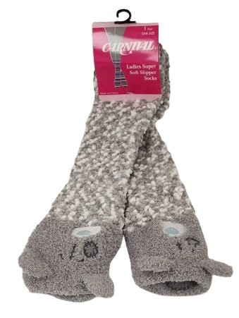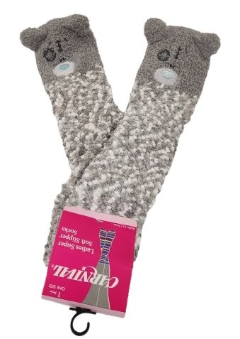 Step into adorable comfort with these Carnival Ladies Super Soft Slipper Socks featuring a fun gray bear face with 3D ears! Whether you're lounging at home or curling up with a good book, these ultra-plush socks are the perfect way to keep your feet warm and your style playful. These slipper socks are not just cute—they’re ridiculously cozy with a fuzzy popcorn-texture knit that feels like walking on clouds. One size fits most, and they make a great gift too! 🧸 Features: Brand: Carnival Style: Slipper socks Design: Gray bear face with embroidered detail and soft 3D ears Texture: Ultra-soft, fluffy popcorn knit Size: One size fits most Color: Gray & white Material: Super plush blend for warmth & comfort Condition: Brand new with packaging Great for gifting, lounging, or simply leveling up your sock game!