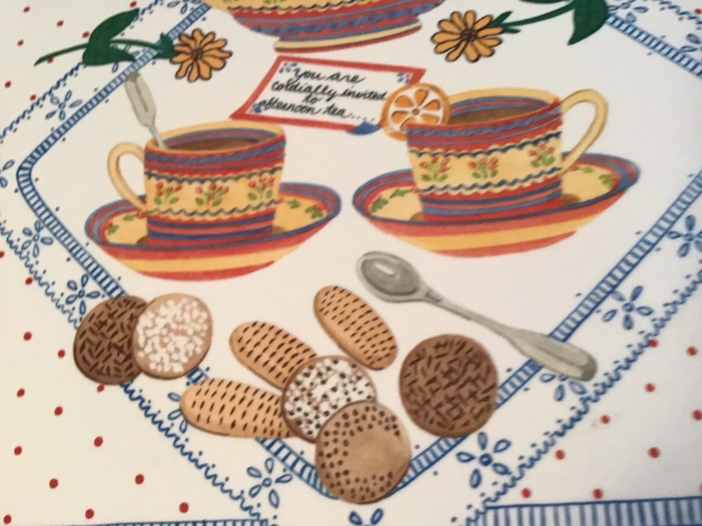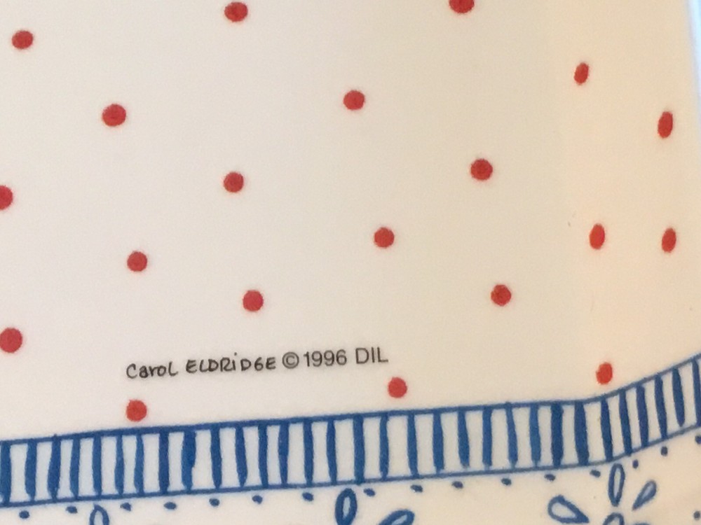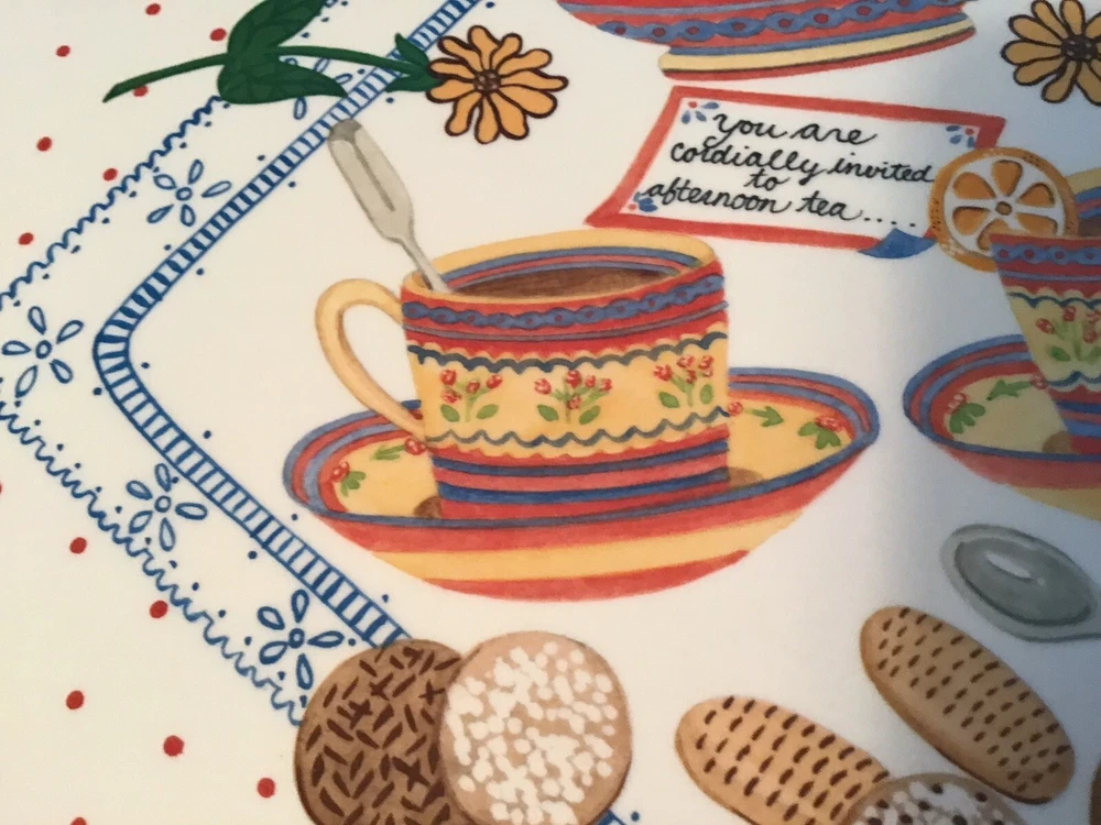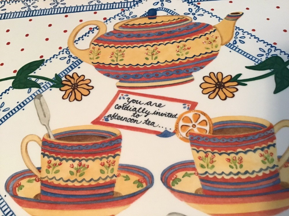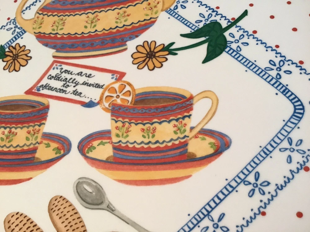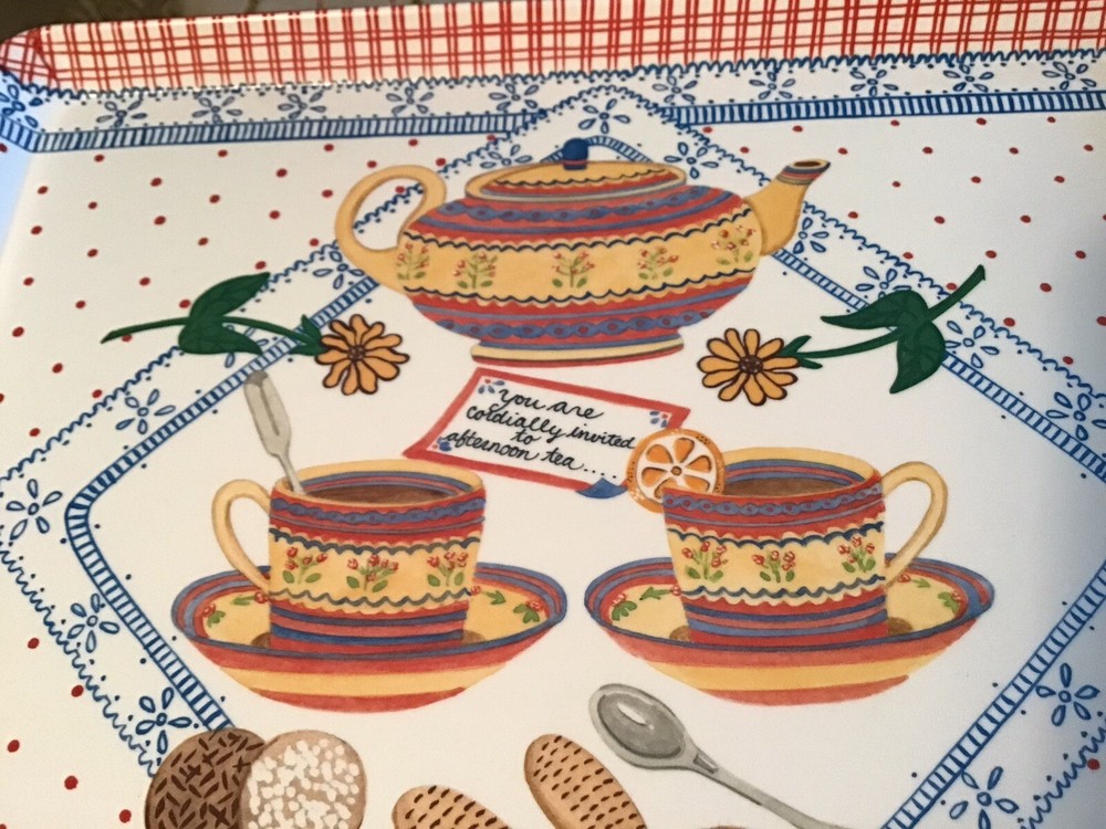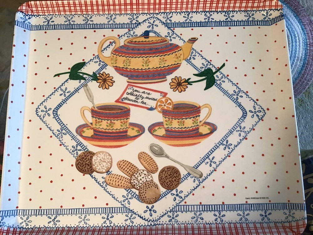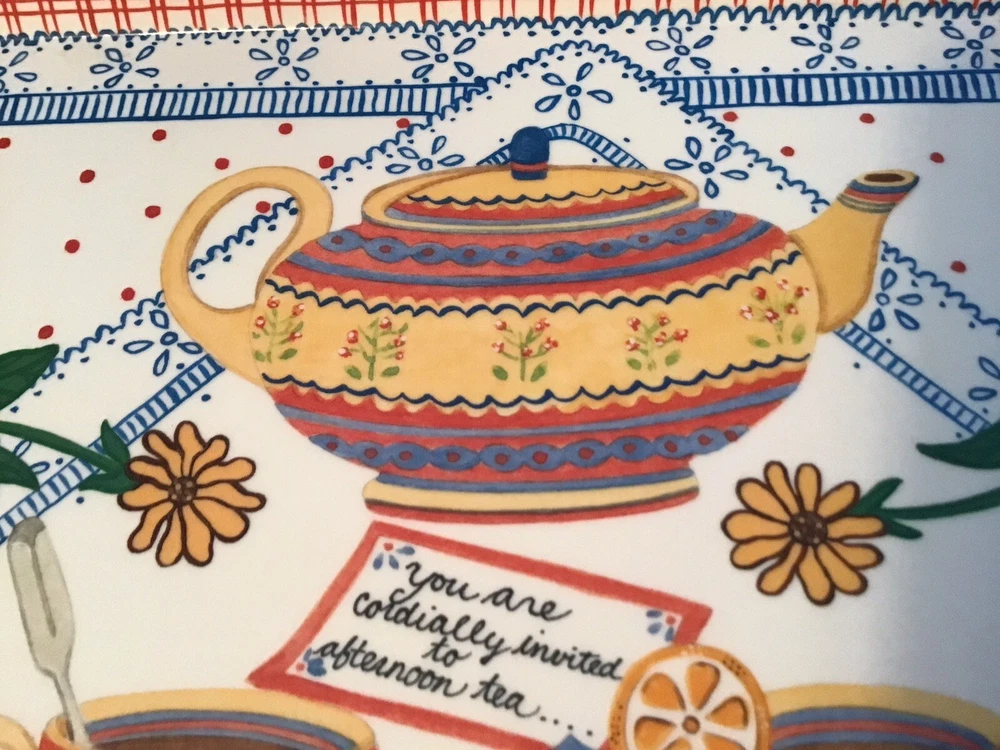 A sweet vintage tea tray. Designed by Carol Eldridge Dated 1990 Made in Italy Please note, there are light scratches and a circular light mark on the surface.. Not noticeable when the tray lays flat. Generally when the tray is tipped to the light. Hard plastic. Dated 1990. 12- 1/4” W x 10.5” L 3/4 “ H edge Cute design of Teapot, 2 cups and saucers, flowers, invitation, cookies. Quick, secure shipping.