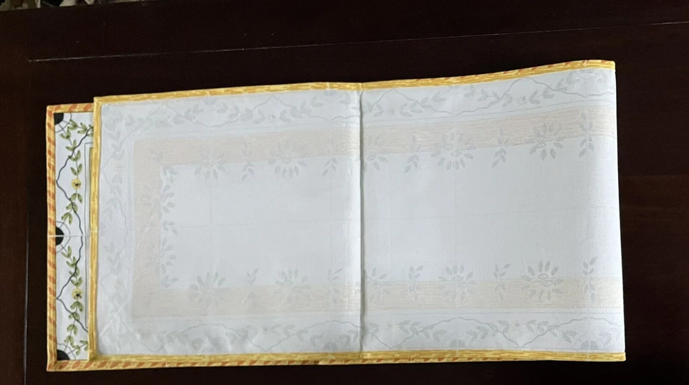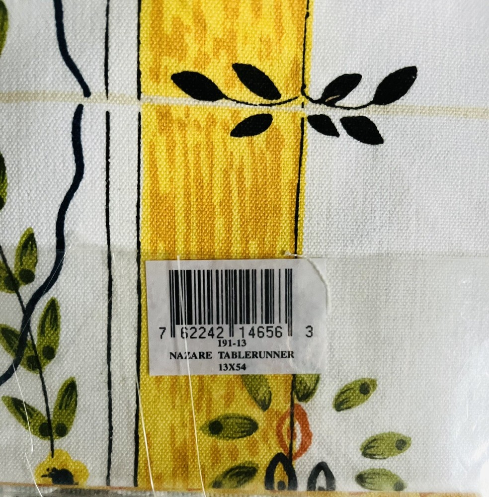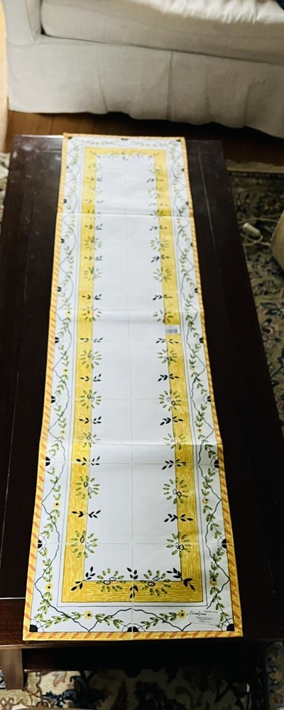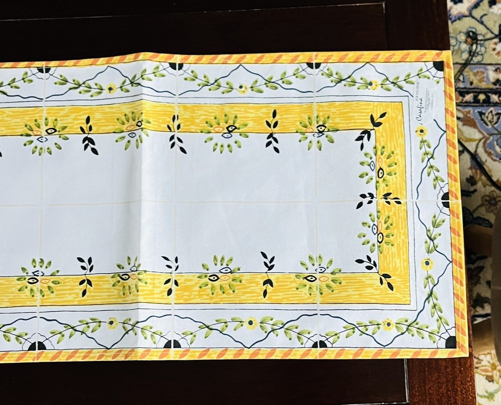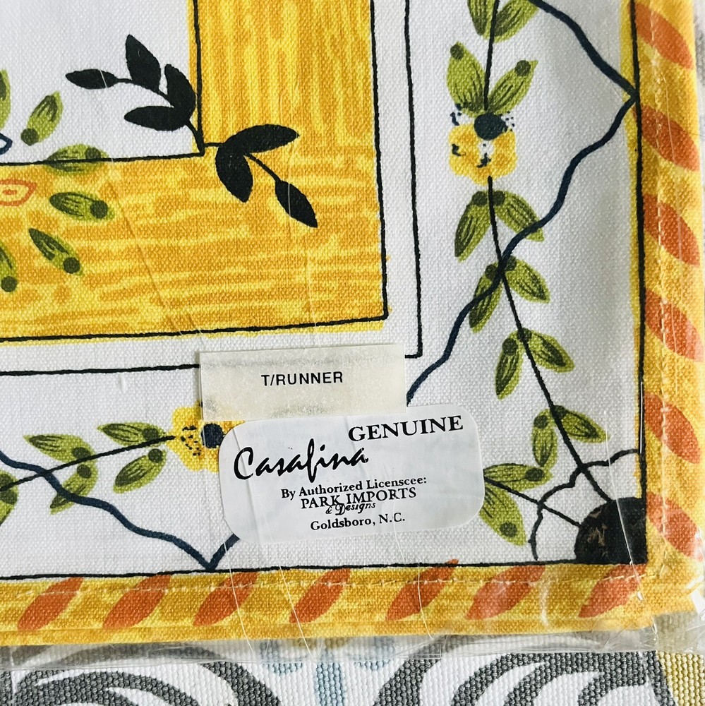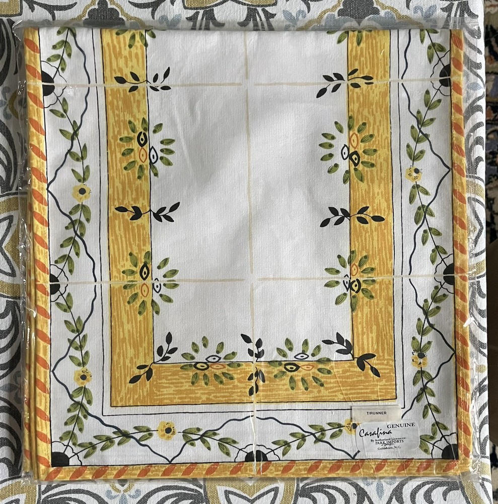 Beautiful Casafina hand printed Nazare 100% cotton 54 x 13 inch table runner. New with tags never used, in original packaging. This table runner has a nice country garden style. White background with yellow, green, orange and black print. Price is for one. Also see my listing for a set of 4 matching napkins and items in the Casafina Papillon pattern which is a classic blue on white. (J)