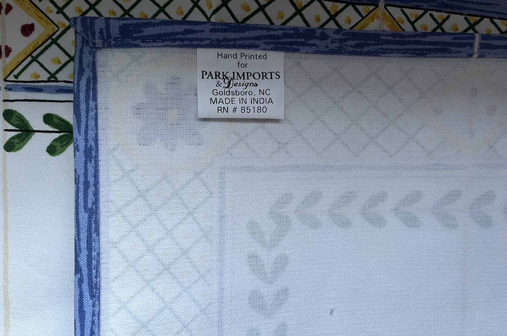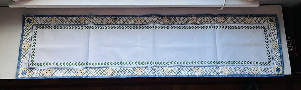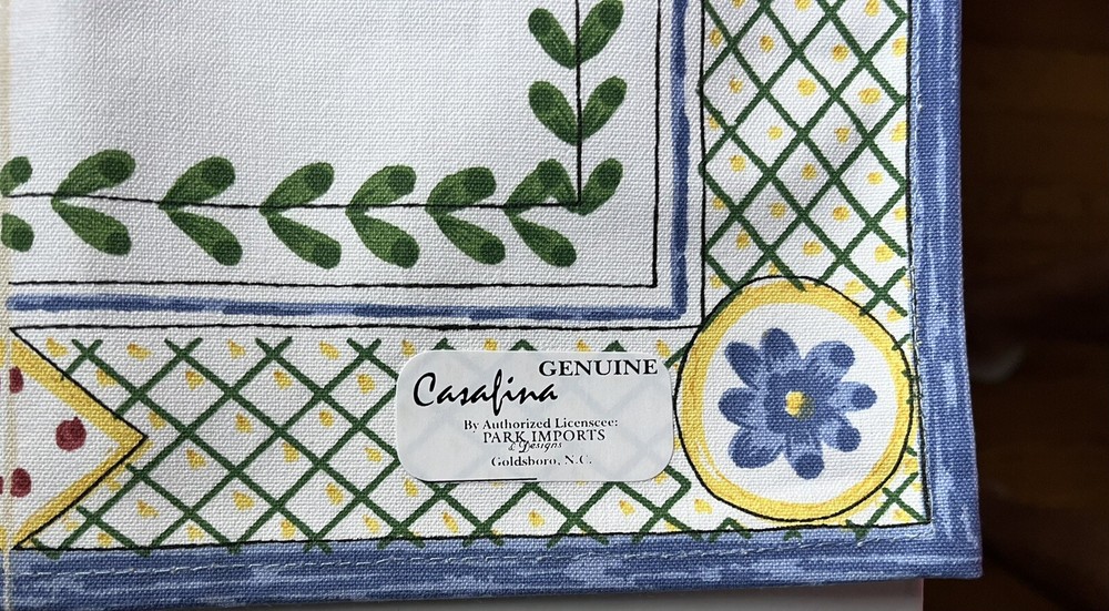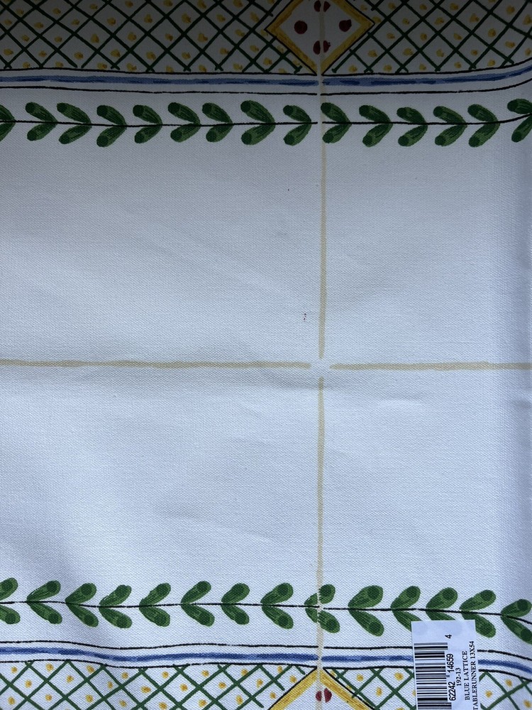 Beautiful Casafina hand printed Blue Lattice 100% cotton 54 x 13 inch table runner. New with tags never used, in original packaging. This table runner has a nice country garden style. White background with yellow, green, blue and pink geometric print. Also see my listings for additional Casafina items in the Papillon and Nazare patterns. Also note this item has a tiny dot on pink paint on the white part of the runner, see picture. (J)
