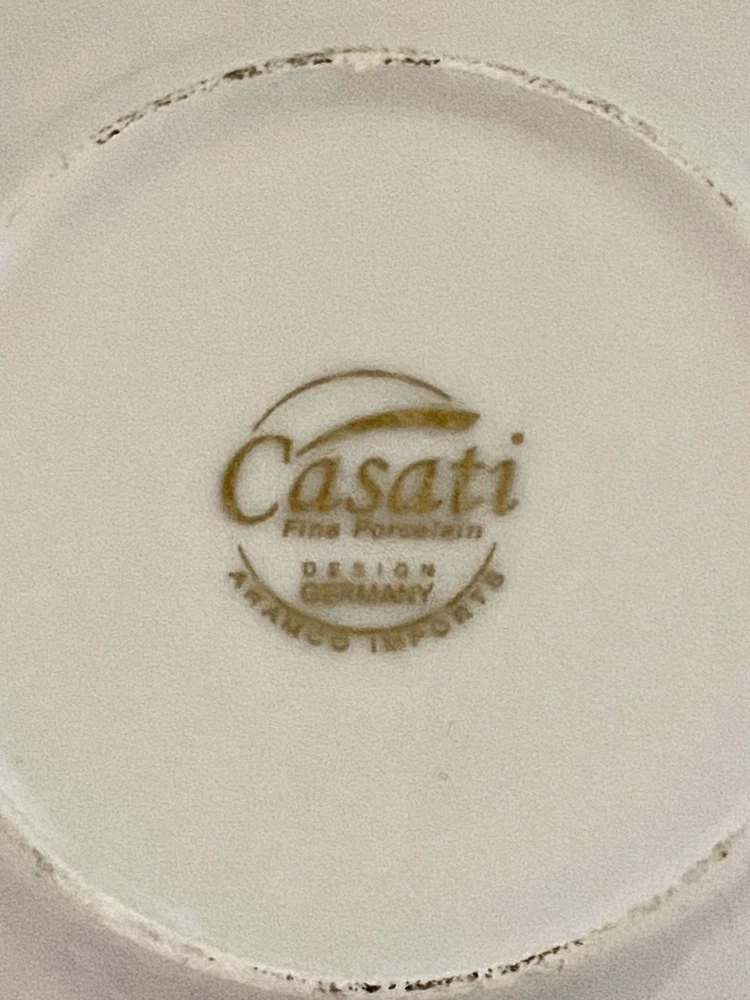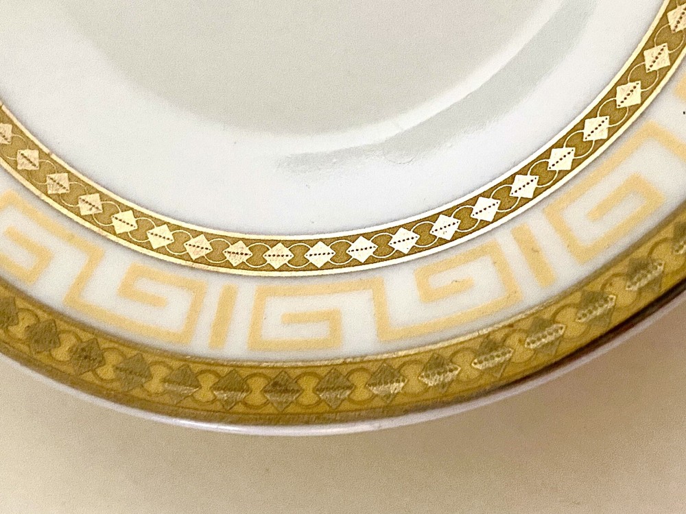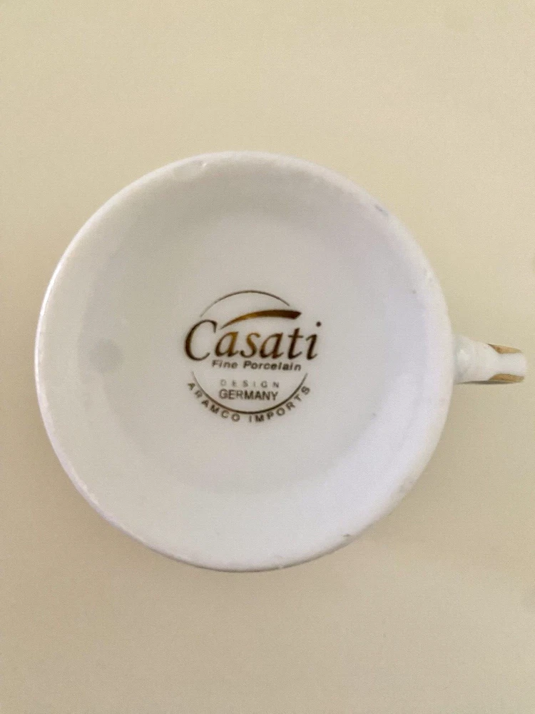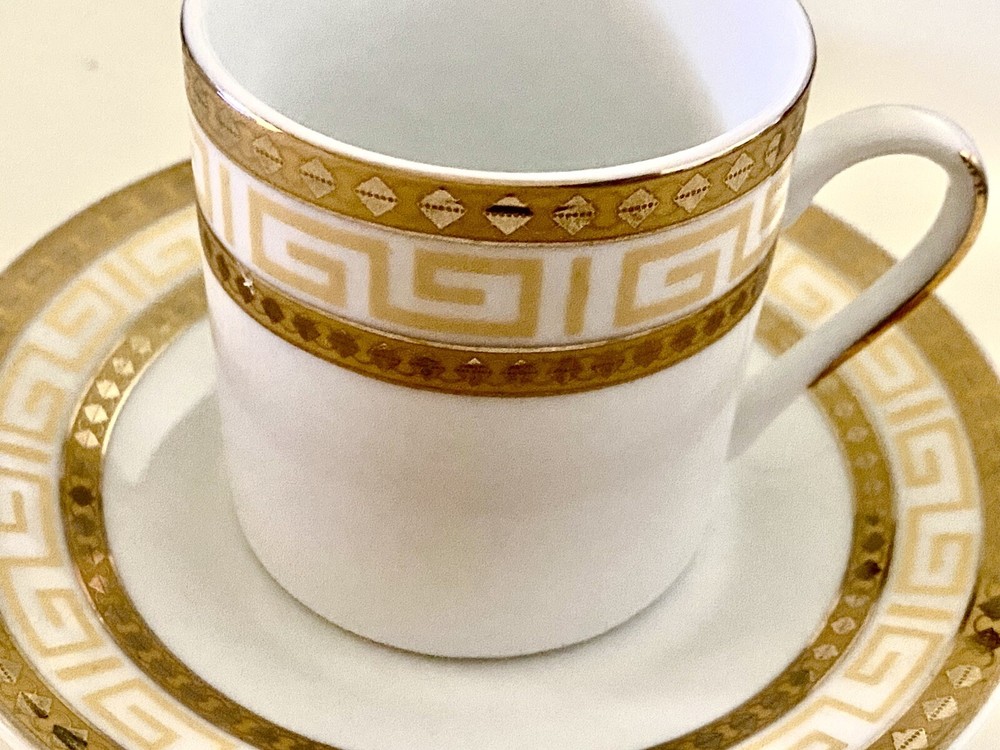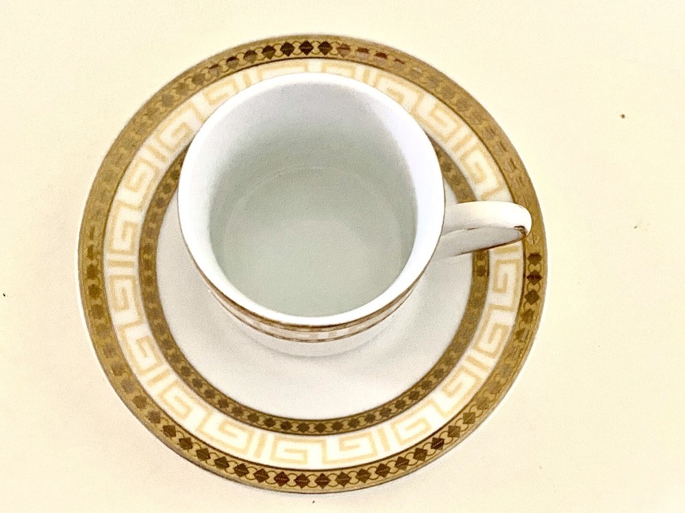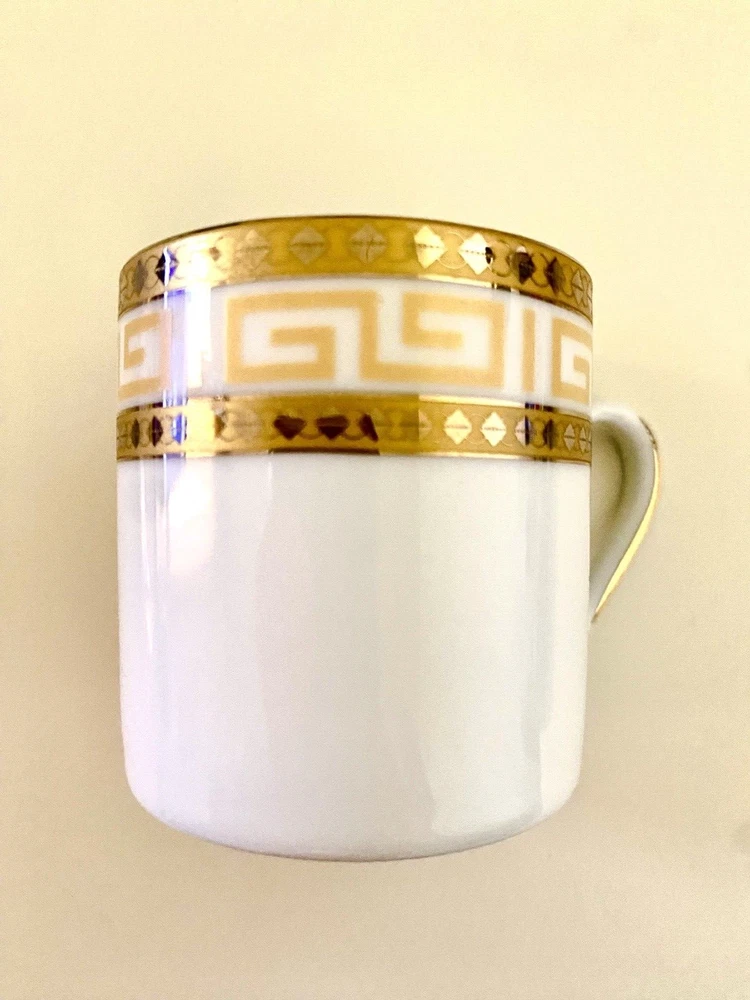 Casati Fine Porcelain Greek Key Expresso Cup & Saucer Gold/White Aramco Imports. Made in Germany. No Chips or Cracks. Excellent Gently Used Condition.