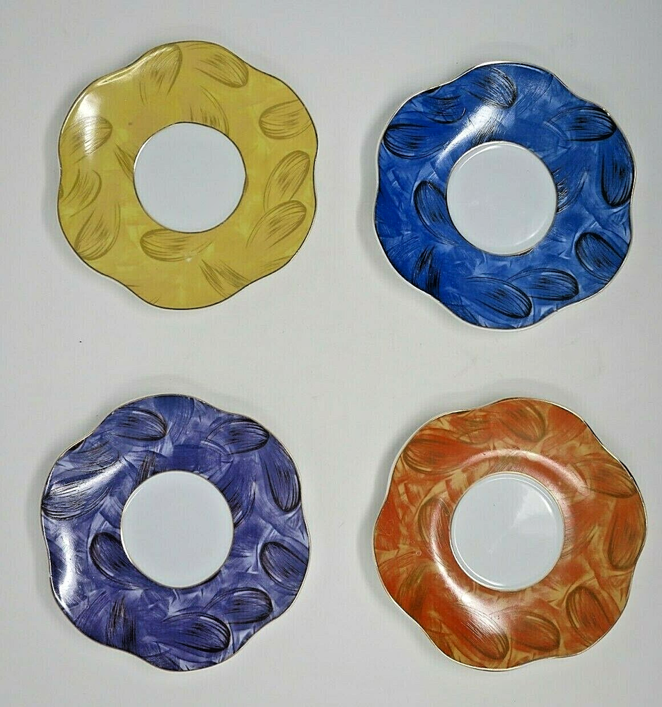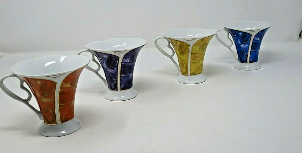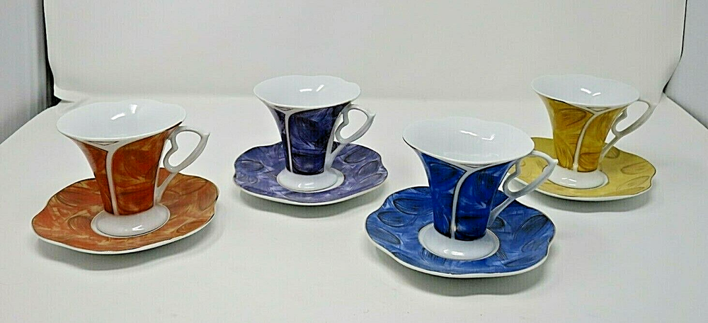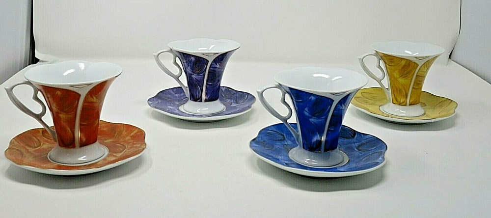 4 Casati Porcelain Aramco Imports Design Germany Cup/Saucer Multi Color - Yellow, Blue, Orange, Purple Tulip Shape Cups Gold Accent Excellent Vintage Condition Approx. Measurements: Cups 2.75" High 3"...