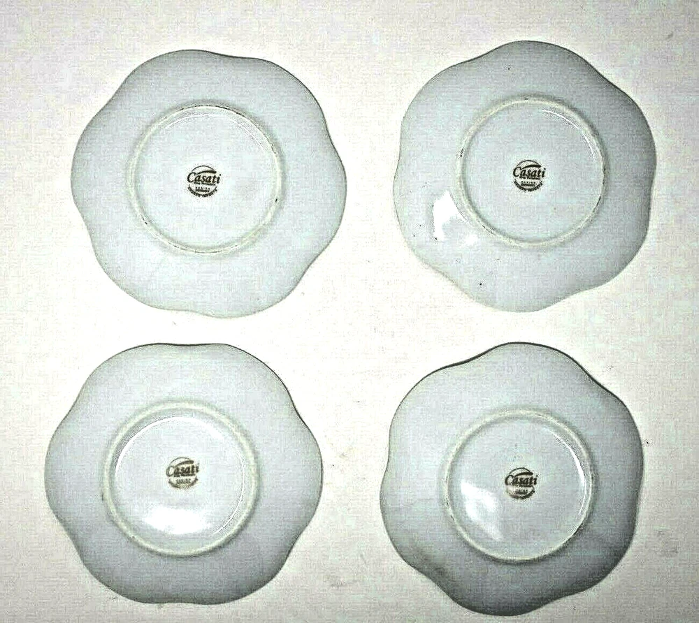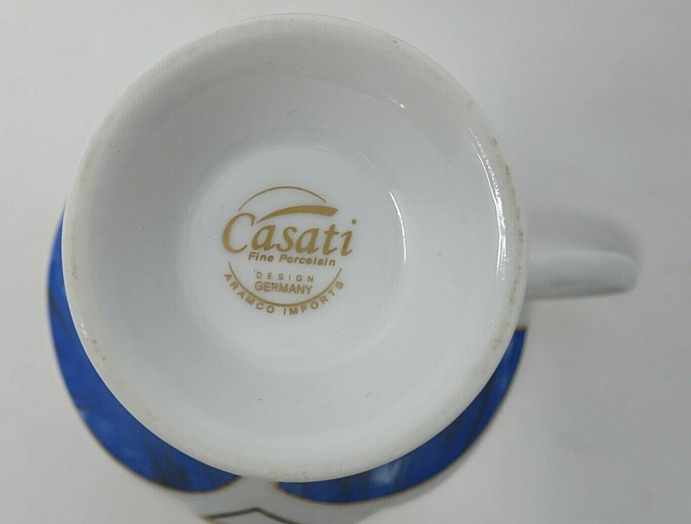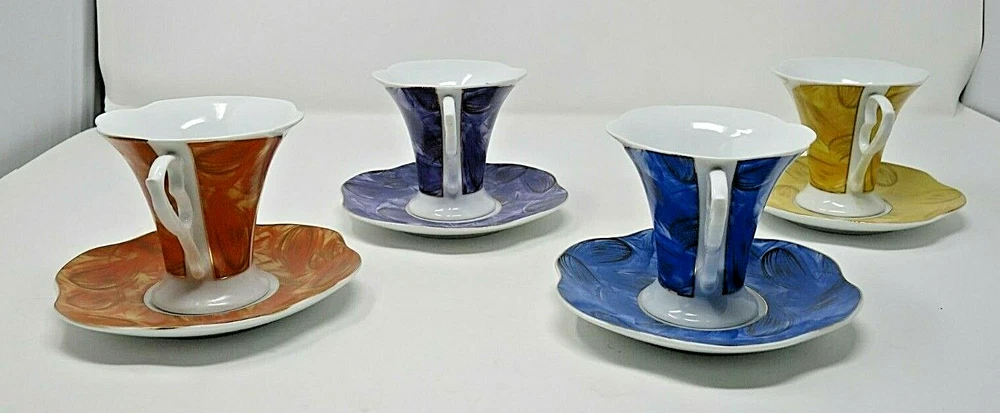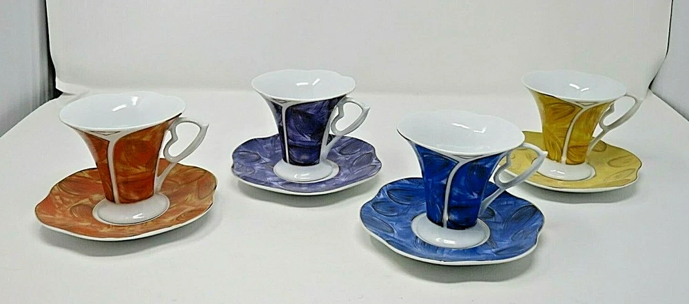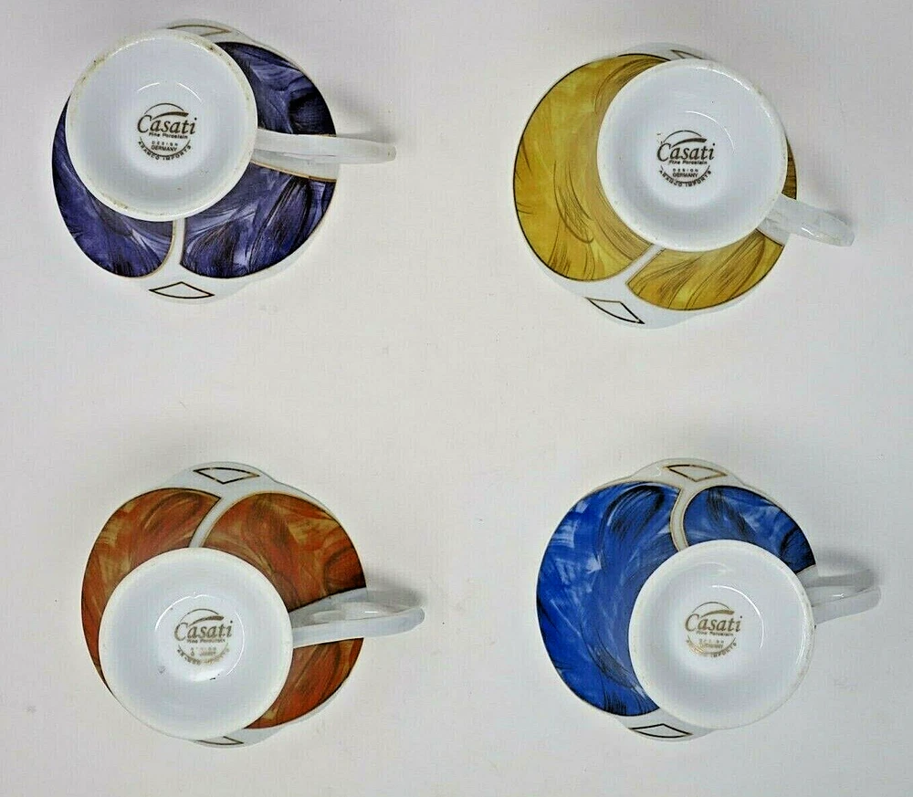 4 Casati Porcelain Aramco Imports Design Germany Cup/Saucer Multi Color - Yellow, Blue, Orange, Purple Tulip Shape Cups Gold Accent Excellent Vintage Condition Approx. Measurements: Cups 2.75" High 3" Wide Saucer: 3" Wide