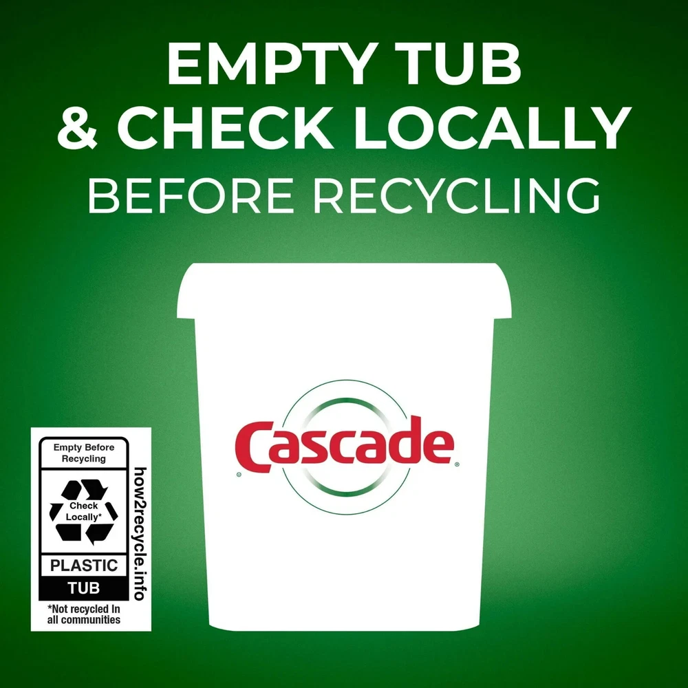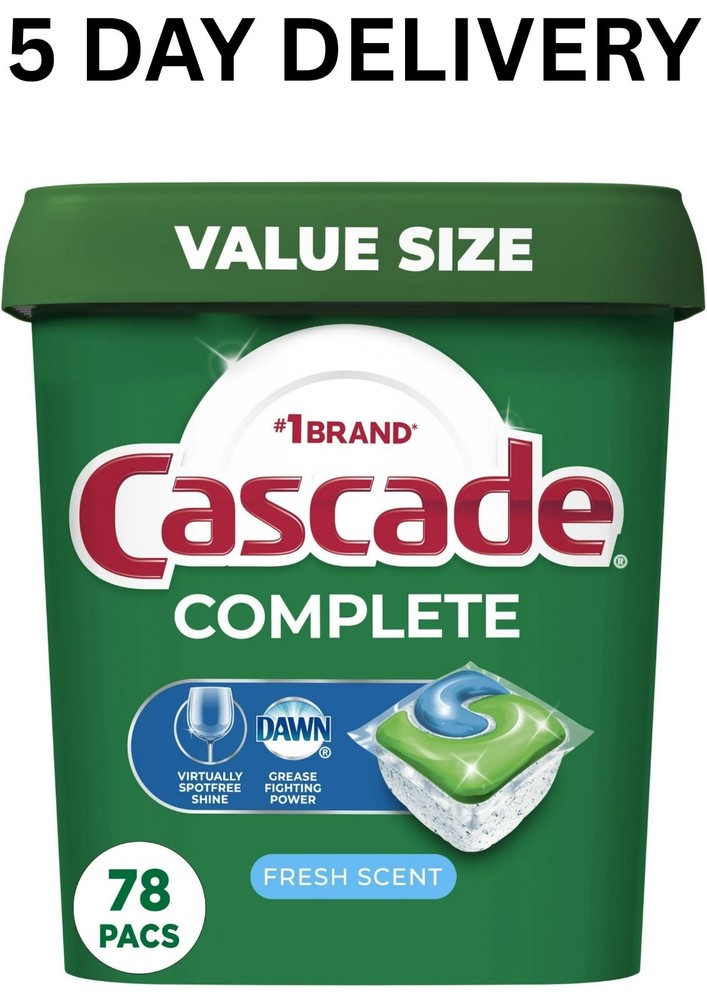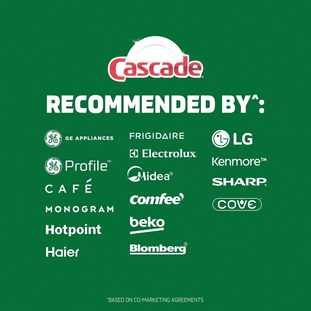 About this item Cascade Complete ActionPacs dishwasher pods have 25% more Cleaning Power* *% cleaning ingredients vs. Cascade Original Use with Cascade Power Dry Rinse Aid and Cascade Dishwasher Cleaner for our best clean Save up to 15 gallons of water per dishwasher load when you skip the pre-wash and run your dishwasher with Cascade Platinum dishwasher pods These Cascade dishwasher detergent tabs can power away even 24-hour stuck-on messes for a complete clean Convenient, premeasured Cascade ActionPac dishwasher pod with no finicky wrapping. Phosphate free Dissolves fast and releases the grease-fighting power of Dawn 78 Count, Fresh Scent Product details Cascade Complete ActionPacs dishwasher pods power away even 24-hour stuck-on messes for a comprehensive clean. That's because every ActionPac contains 25% more cleaning power* (*% cleaning ingredients vs. Cascade Original) and is formulated with the grease-fighting prowess of Dawn dishwashing liquid. These convenient dishwasher pods are premeasured, eliminating the hassle of finicky wrapping—just toss in a pod and go. Additionally, Cascade Complete ActionPacs are phosphate-free, making them an eco-friendly choice for your kitchen. These dishwasher detergent tabs dissolve quickly to unleash their cleaning power early in the cycle, ensuring that your dishes come out sparkling. For optimal results, pair Cascade Complete ActionPacs with Cascade Power Dry Rinse Aid for enhanced drying performance and Cascade Dishwasher Cleaner to keep your dishwasher machine in pristine condition. By skipping the pre-wash and utilizing these effective dishwasher detergent tabs, you can save up to 15 gallons of water per load. Cascade dishwasher detergent is the #1 recommended brand in North America* (*More dishwasher brands in North America recommend Cascade vs. any other automatic dishwashing detergent brand, recommendations as part of co-marketing agreements). Each 78 Count package of these fresh-scented dishwasher tabs delivers exceptional cleaning power and convenience for all your dishwashing needs. Enjoy the effortless clean with Cascade Complete ActionPacs dishwasher pods! Cascade Complete ActionPacs dishwasher pods have 25% more Cleaning Power* *% cleaning ingredients vs. Cascade Original Use with Cascade Power Dry Rinse Aid and Cascade Dishwasher Cleaner for our best clean Save up to 15 gallons of water per dishwasher load when you skip the pre-wash and run your dishwasher with Cascade Platinum dishwasher pods These Cascade dishwasher detergent tabs can power away even 24-hour stuck-on messes for a complete clean Convenient, premeasured Cascade ActionPac dishwasher pod with no finicky wrapping. Phosphate free Dissolves fast and releases the grease-fighting power of Dawn 78 Count, Fresh Scent