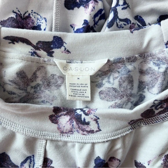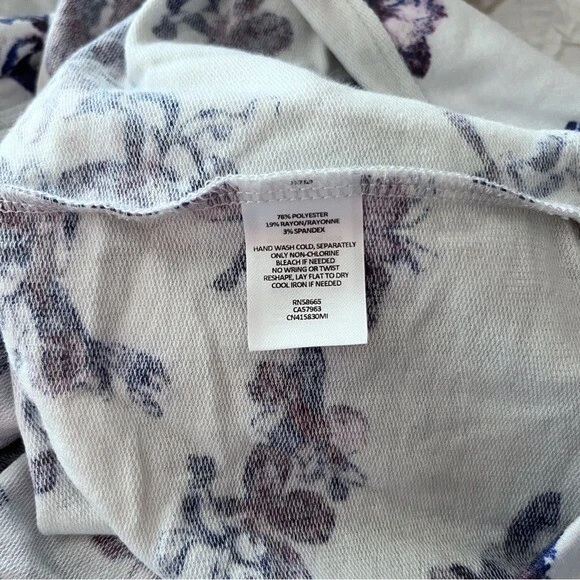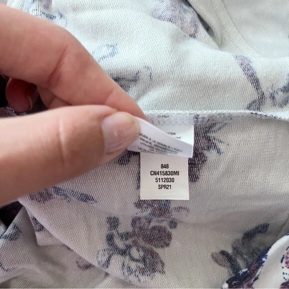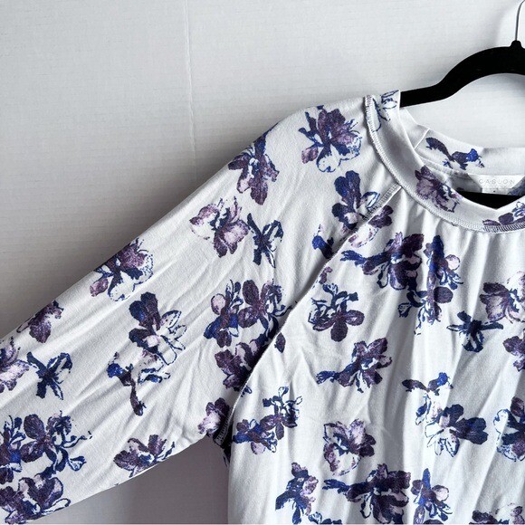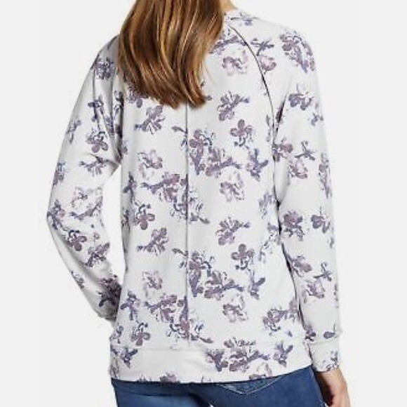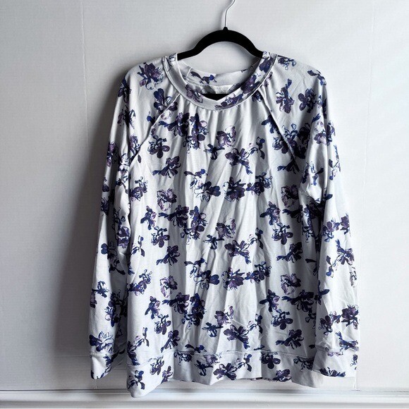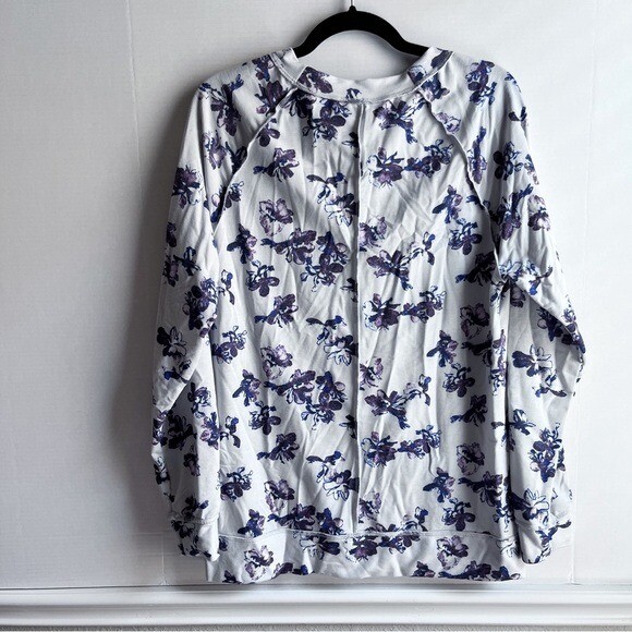 Details: Lightweight sweatshirt Round crew neck Long sleeves Raglan shoulder Inside-out seaming detail Floral print Relaxed oversized fit Excellent preowned condition, no flaws Size: medium 20.5” flat across chest 26” length shoulder to hem Fabric: polyester rayon spandex blend Color: light gray purple black MSRP: $49 Tags: printed pattern cozy casual cute flower pullover knit top lounge loungewear Nordstrom Caslon Floral Print Cozy Crew Sweatshirt Lightweight Raglan Knit Women Medium
