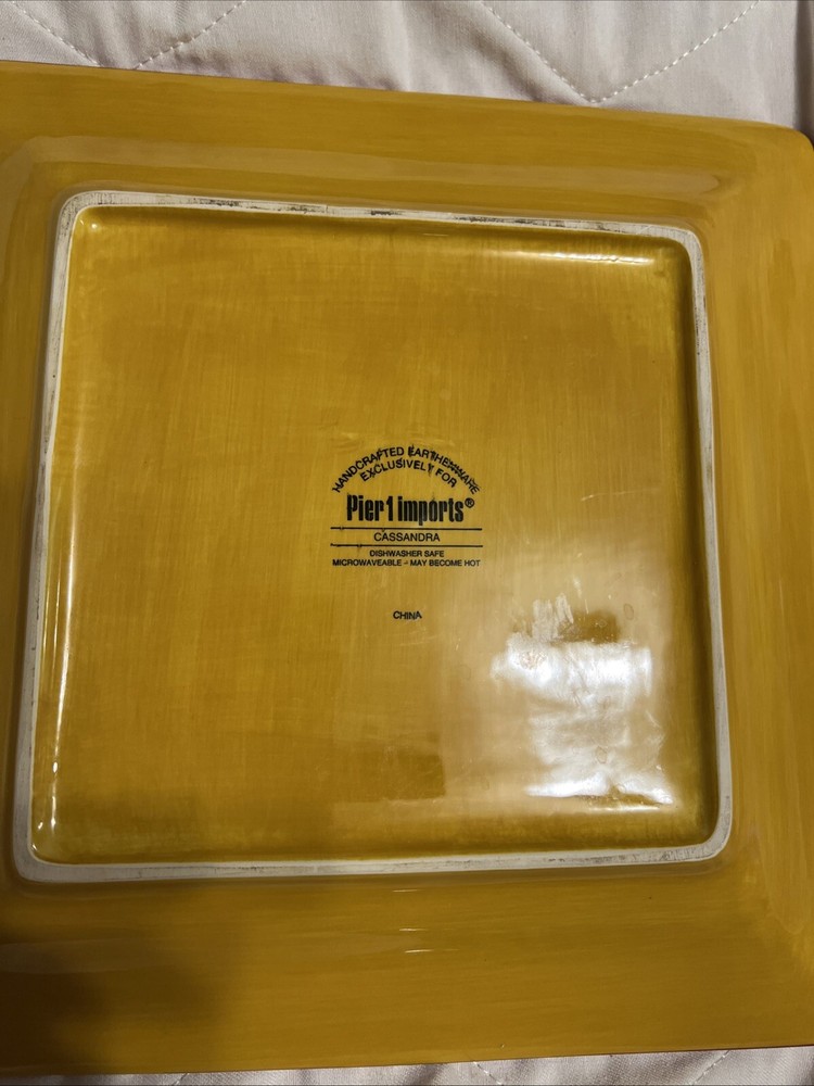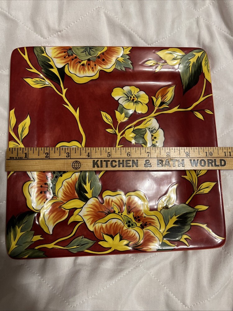 This is a red square earthenware dinner plate from the Cassandra collection by Pier 1 Imports. It features a floral design in an art deco style, hand-painted with a printed backstamp. The plate is microwave and dishwasher safe, measures 10-3/4 inches in length and width, and has a height of 3/4 inches. It was manufactured in 2011 , beautiful beautiful πΊπΈπΊ