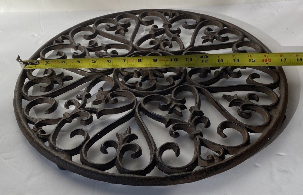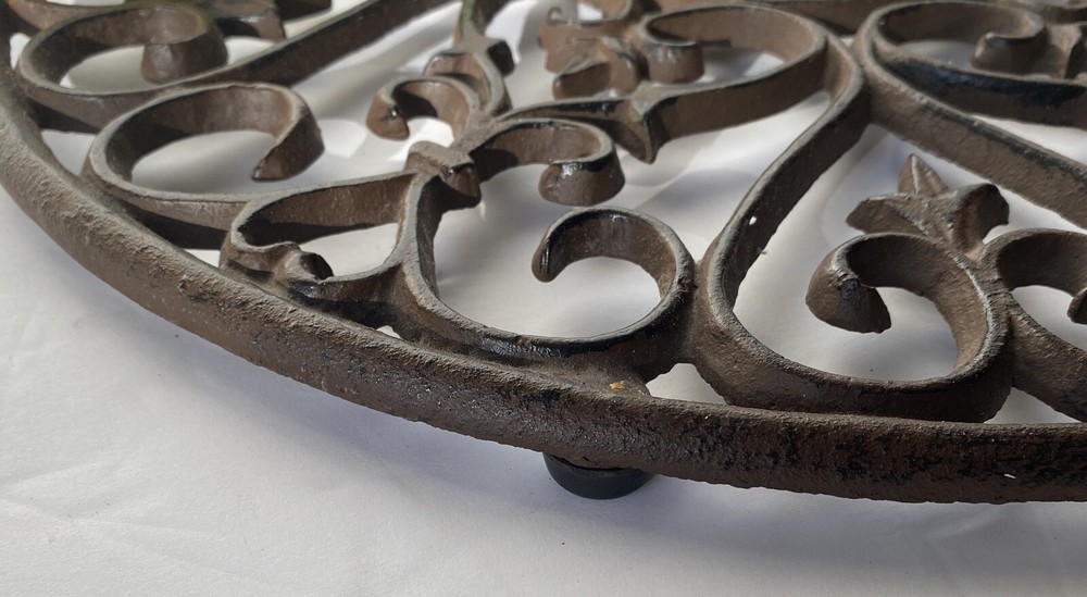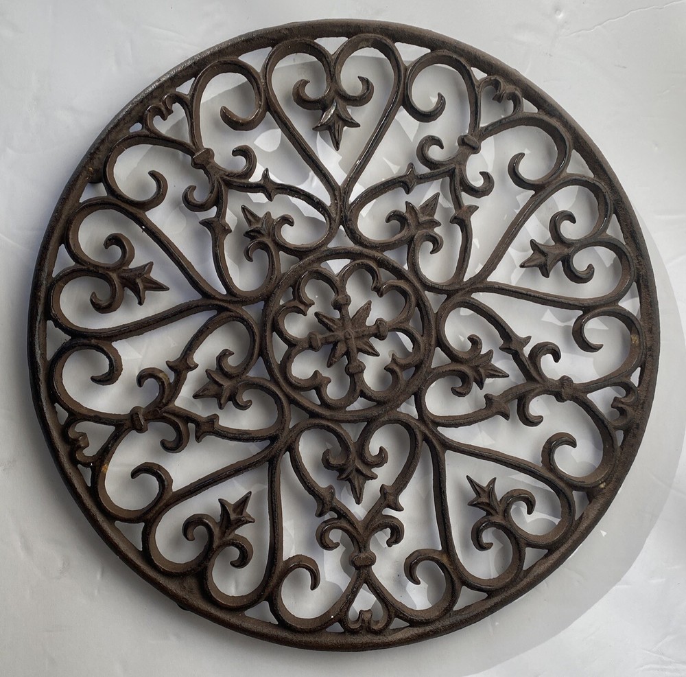 Round cast-iron window, These kinds of pieces were mounted on the inside of a window so that this window was protected. Also often in doors so that one could see who was at the door. Diameter of 17 and a thickness of 3/4th of an inch. Garden Ornament, Decor, Wall Hanging, Scroll Work, Applied Leaves, Heavy, Wonderful Piece, A Solid Piece That Will Last, 8.5 lbs Wonderful Vintage Condition