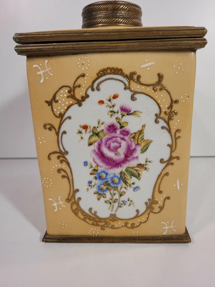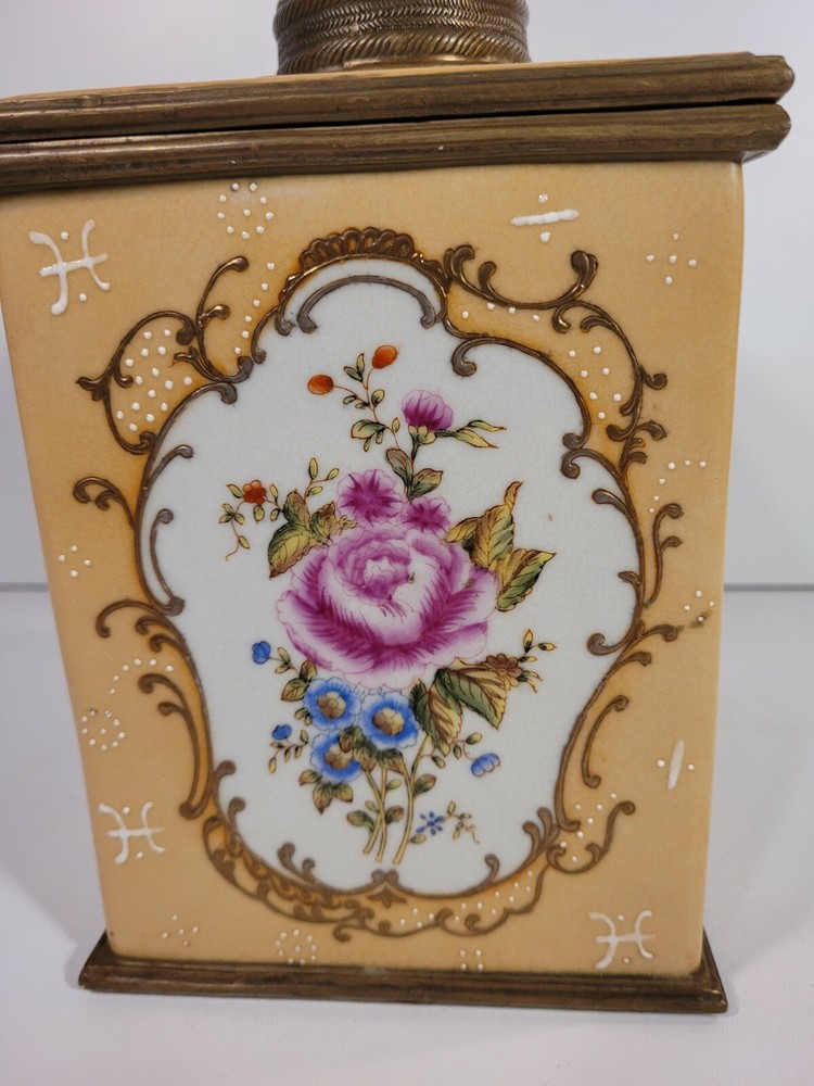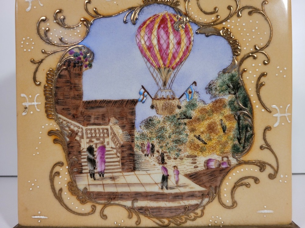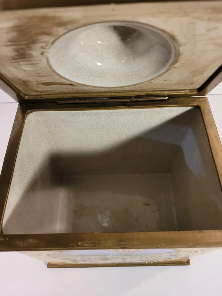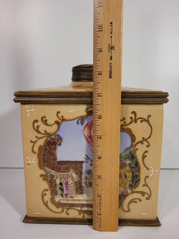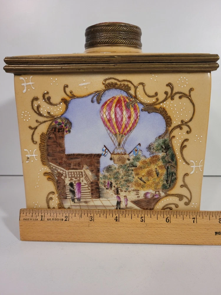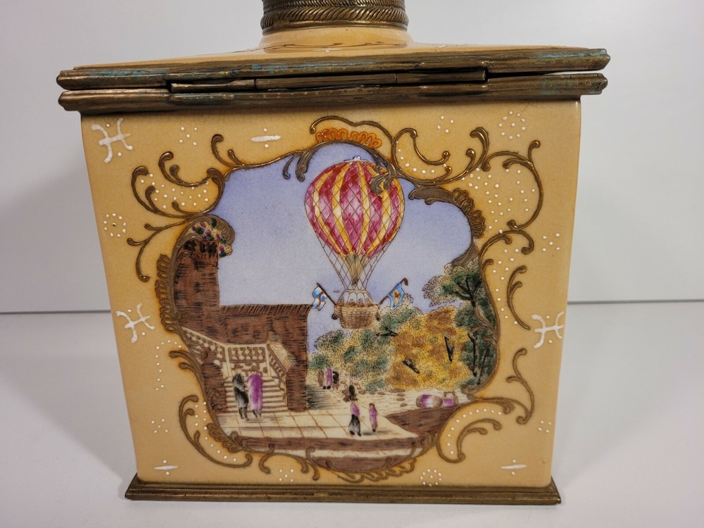Vintage Castilian Imports Porcelain Tea Caddy Hinged Box Montgolfiere Design Hand Painted 8 3/4" Tall 7 1/2" Wide Brass Fittings Original Labels VGC No Chips Cracks...