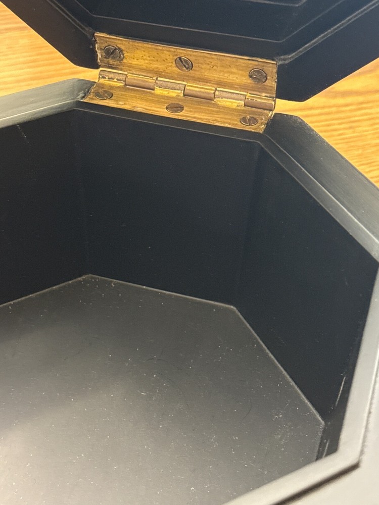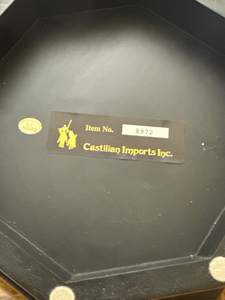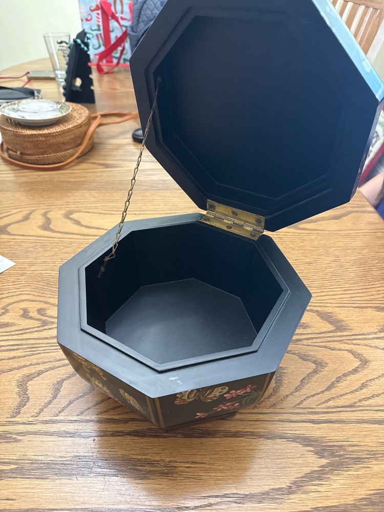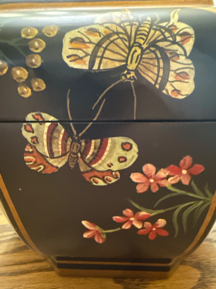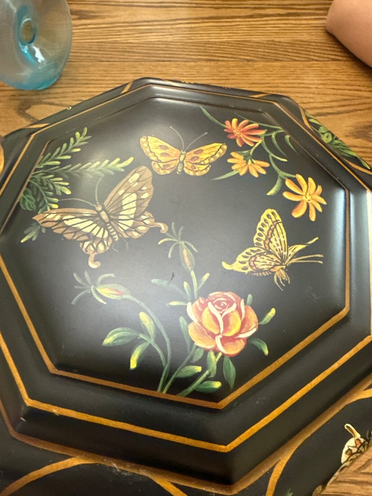 The Castilian Imports Wooden box with a butterfly design and octagonal shape is a beautifully crafted decorative collectible. Made of wood with a painted finish, this unique item features an intricate butterfly design on the lid, adding a touch of elegance to any room. The octagonal shape and boxed feature make it a versatile piece that can be used for storing small treasures or as a stand-alone decor item. Perfect for collectors or those looking to add a pop of nature-inspired design to their space. Size is approximately 7 inches tall and 9.5 inches diameter.