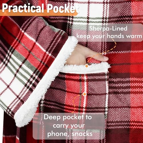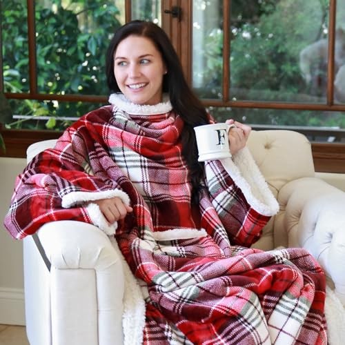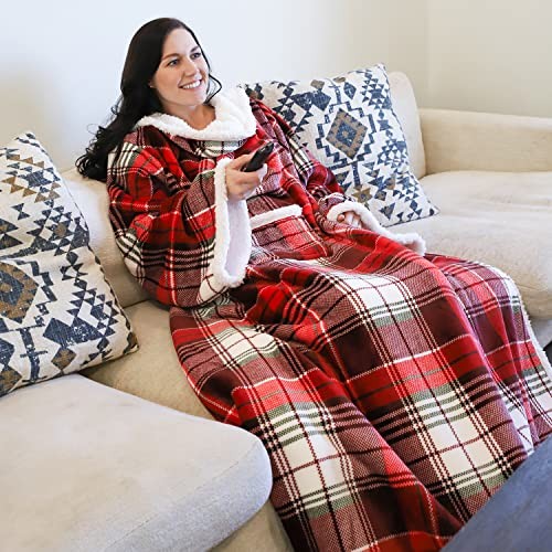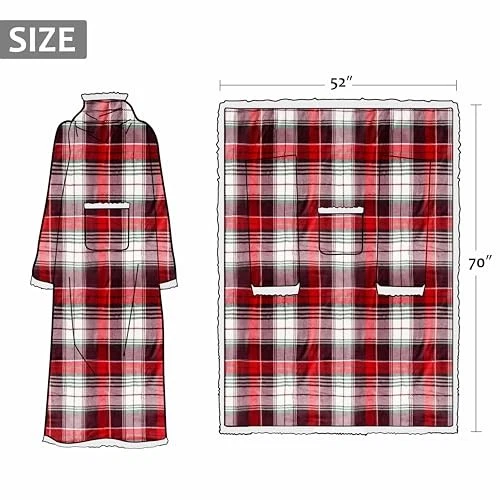 Product Page Catalonia Sherpa Wearable Blanket with Sleeves Arms, Comfy Sleeved TV Apparel Description: Features: Catalonia Deluxe Micro Fleece Sherpa Blanket with Sleeves: to be worn with an opening in the back, covers shoulders and arms while allowing full range of motion Hands-Free Robe Blanket: This wearable blanket helps you stay warm from head to toe while reading, studying, watching TV, lounging in bed, or watching movies on the couch. Features a front pouch to carry your phone or remote. Ultra Soft and Luxurious: Super soft micro plush fleece-like fabric on the outside, plush sherpa material on the reverse One size fits most adults. Size: 72 inches long x 55 inches wide, sleeve width: 11", sleeve circumference: 23". Machine washable, gentle. Makes for great gifting: perfect as a holiday gift, Mother’s Day/Father’s Day gift, Birthday present, or Christmas gift.