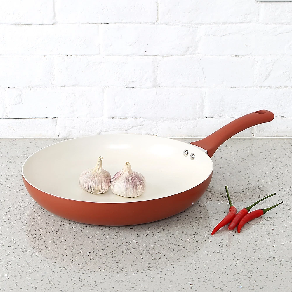 Headline : Elevate Your Culinary Game with a Ceramic Aluminum Frypan Performance Highlights : Rapid & Even Heating : The aluminum construction ensures heat spreads quickly and evenly, enhancing your cooking efficiency. Healthy & Nonstick : The advanced ceramic coating not only simplifies cleaning but also guarantees a healthier cooking experience. Secure Handling : The securely riveted handle ensures a comfortable and stable grip, even during vigorous cooking sessions. Compatibility & Style : Universal Compatibility : Compatible with all stove types except induction, offering flexibility in your cooking routines. Stylish Red Canyon Design : The eye-catching red exterior adds a touch of elegance to your kitchen decor.