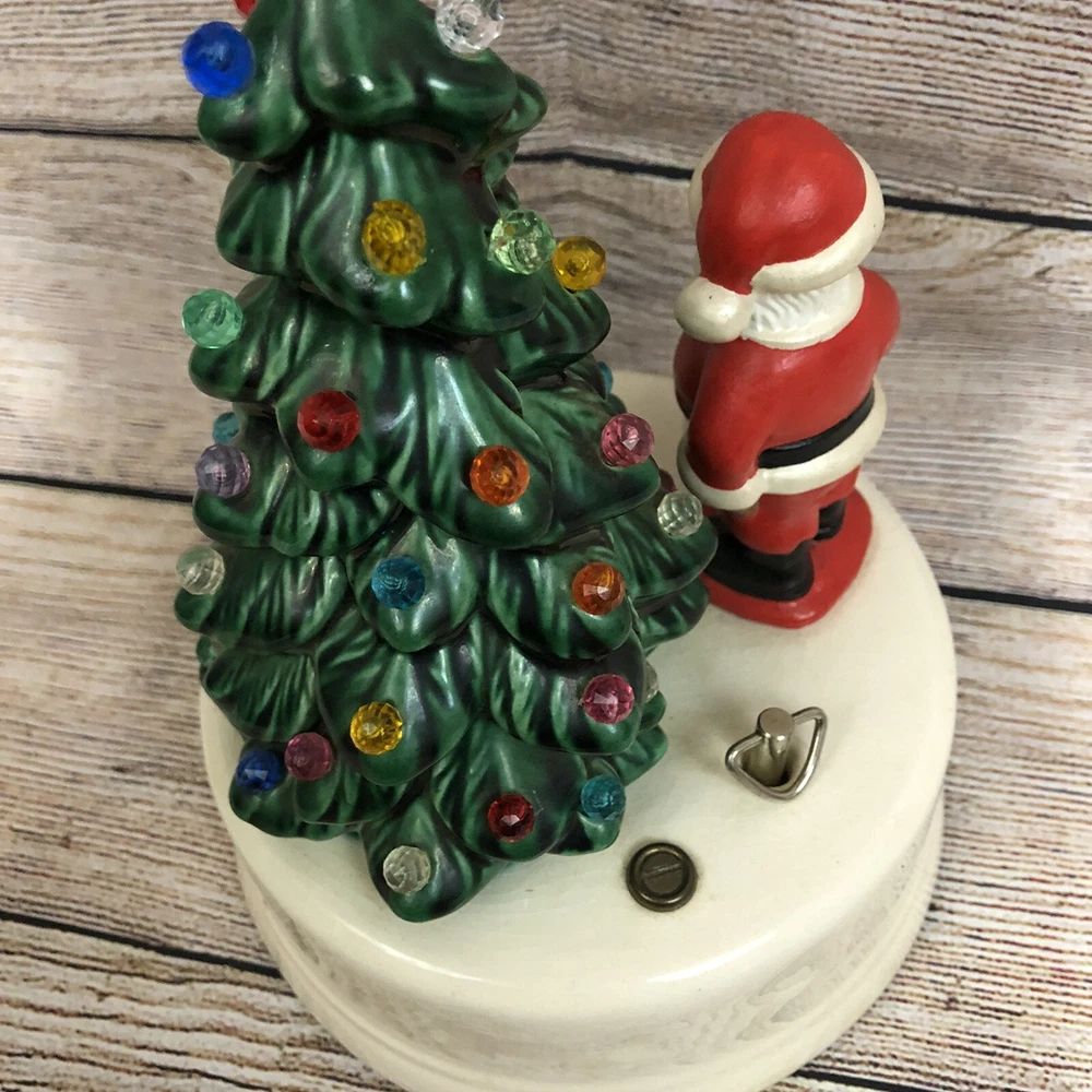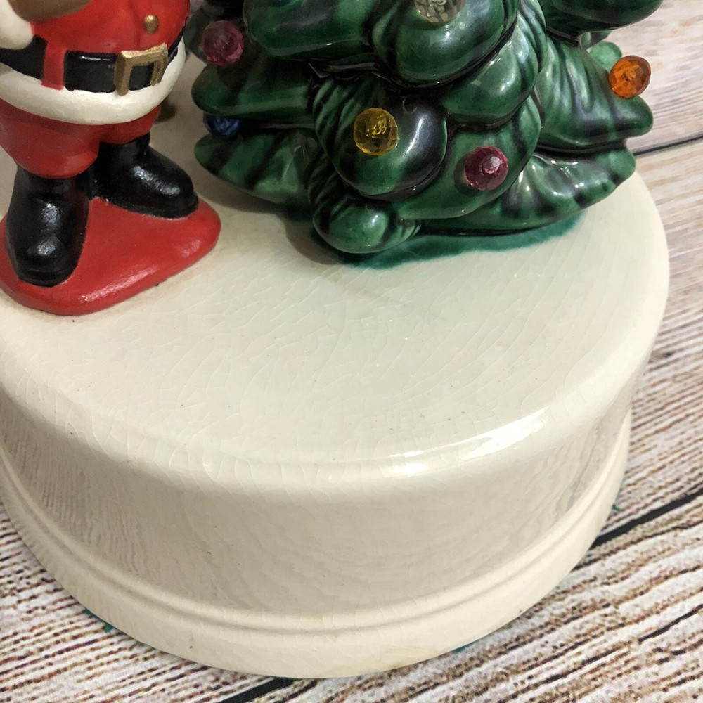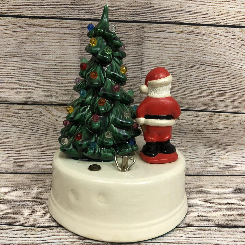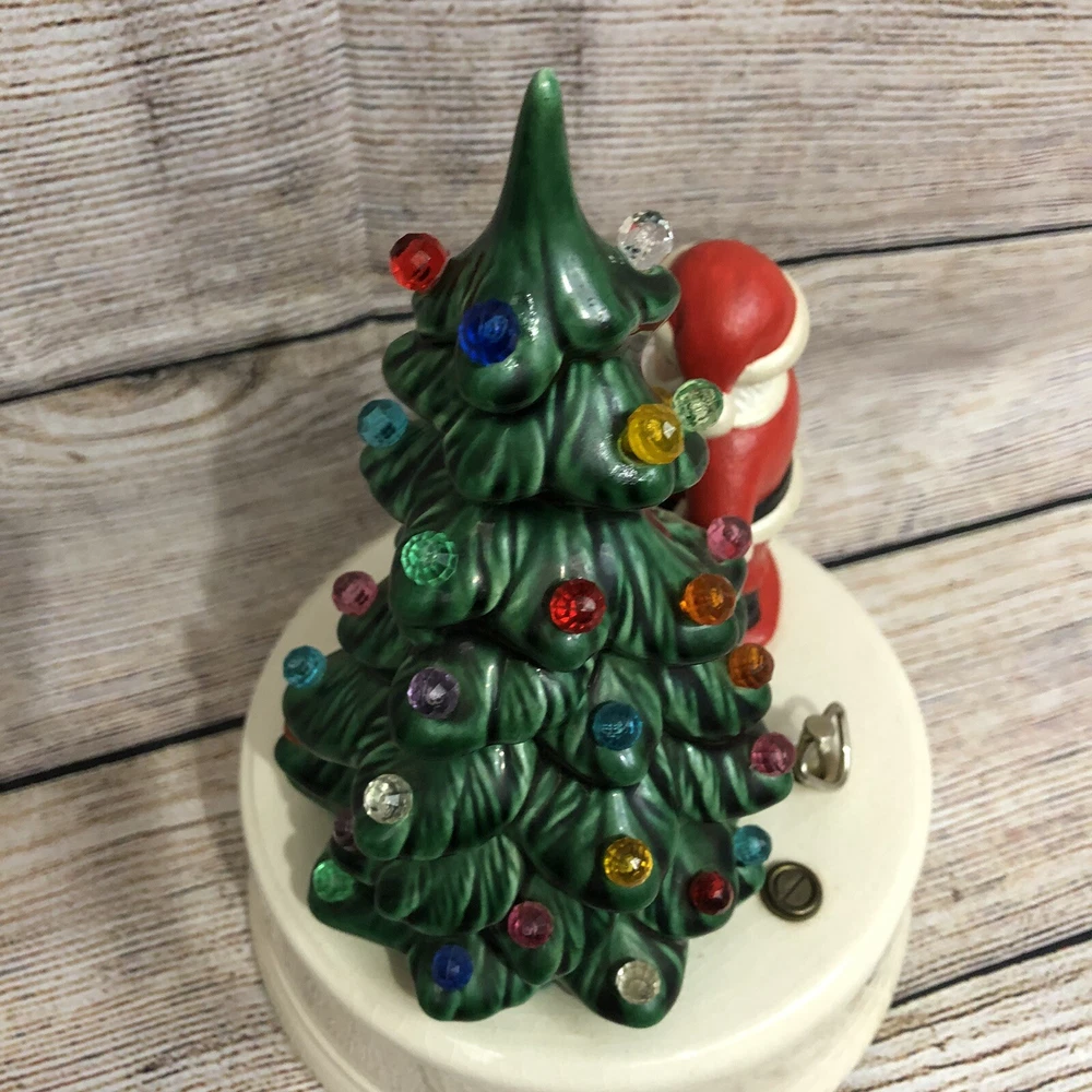 Vintage Ceramic Christmas Tree w/ Santa Claus Wind Up Stationary Music Box Hand Painted Glazed Video will open in a new window Using the mobile app? Copy this link into your browser: Vintage Ceramic Christmas Tree w/ Santa Claus Wind Up Stationary Music Box Hand Painted Glazed Vintage, pre-owned, and in good working condition Wind-up mechanism turns smoothly See short video clip for song reference Base has a crackle glazed finish and all light pegs are present and glued in place Picture #11 shows a tiny repaired paint chip at very tip of tree- no other flaws to note Please also refer to photos