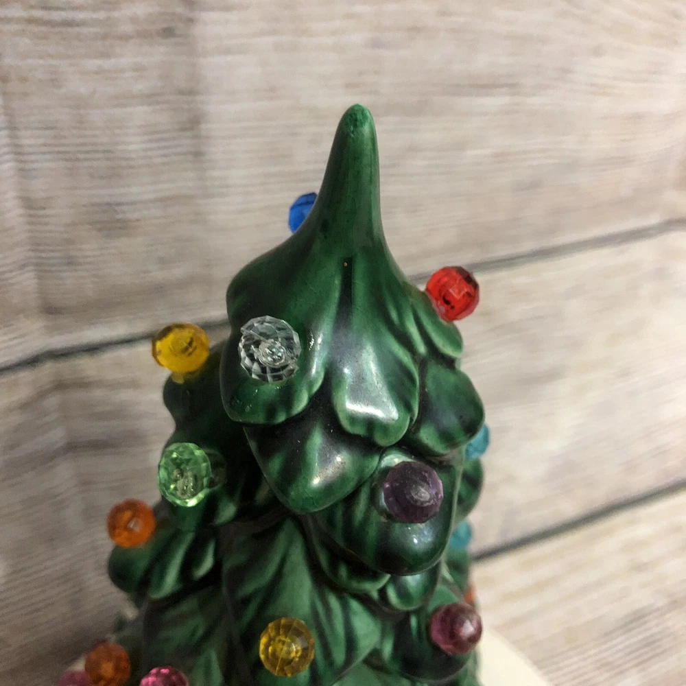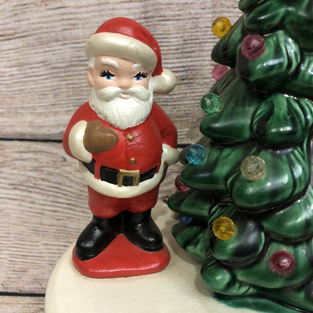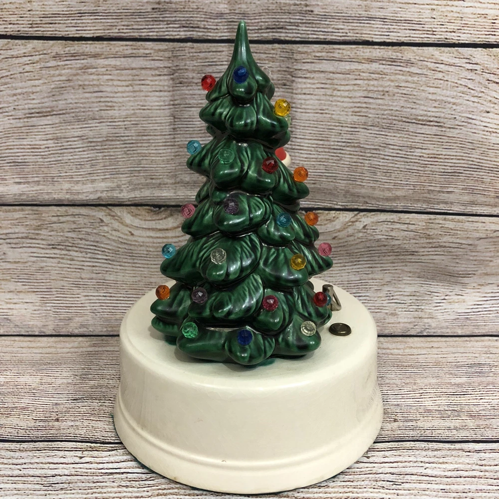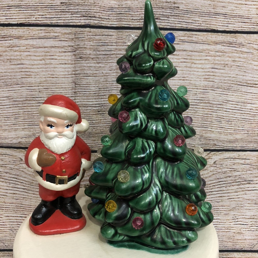 Vintage Ceramic Christmas Tree w/ Santa Claus Wind Up Stationary Music Box Hand Painted Glazed Video will open in a new window Using the mobile app? Copy this link into your browser: Vintage Ceramic Christmas Tree w/ Santa Claus Wind Up Stationary Music Box Hand Painted Glazed Vintage, pre-owned, and in good working condition Wind-up mechanism turns smoothly See short video clip for song reference Base has a crackle glazed finish and all light pegs are present and glued in place Picture #11 shows a tiny repaired paint chip at very tip of tree- no other flaws to note Please also refer to photos