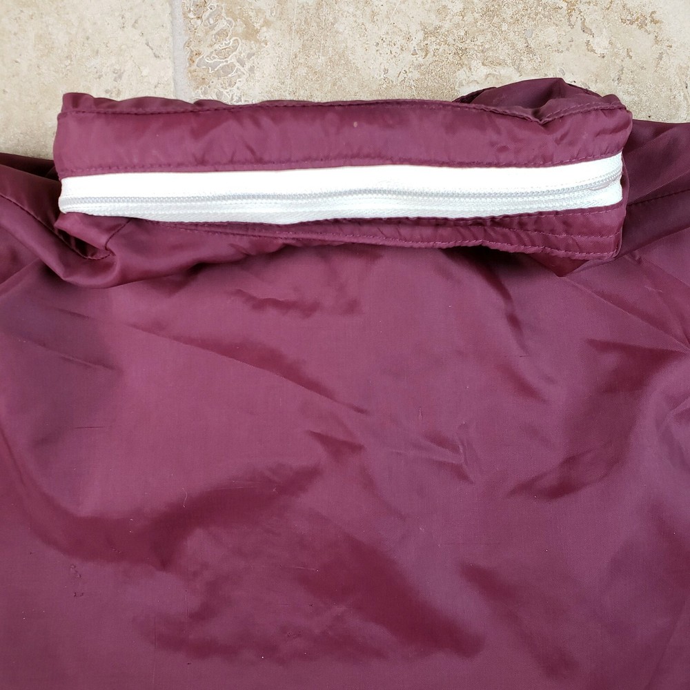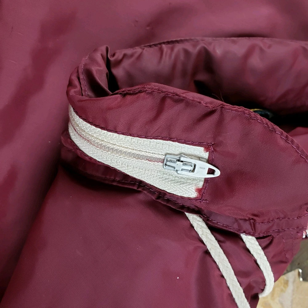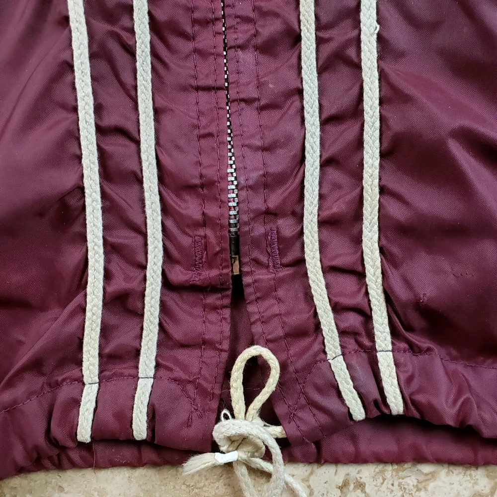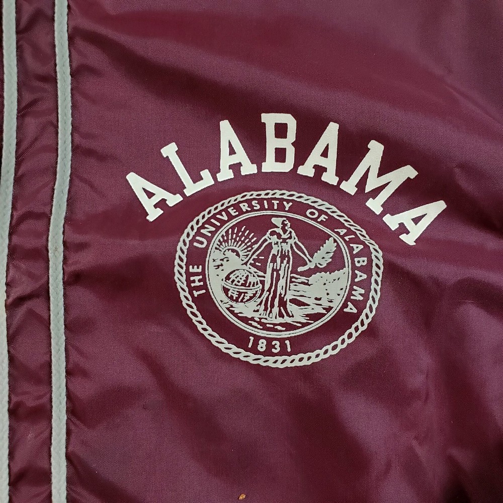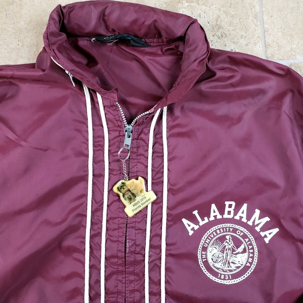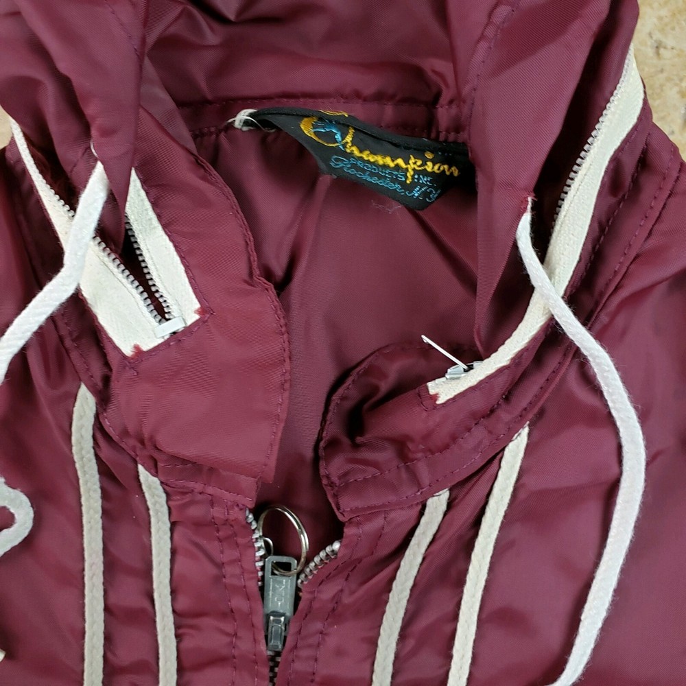 Vintage 1960s Ultra rare "Running Man" Logo. University Of Alabama windbreaker by Champion sportswear. This is rare because it was made in Rochester. Hooded with a zipper to hide the hood. Burgundy red . Missing tag size but measures as a small or medium. Chest is 42 inches, waist is 40 inches, length is 25 inches, and sleeve is 25 inches. One zippered front pocket. Condition is previously worn condition. Sale is for jacket only. Fast shipping.