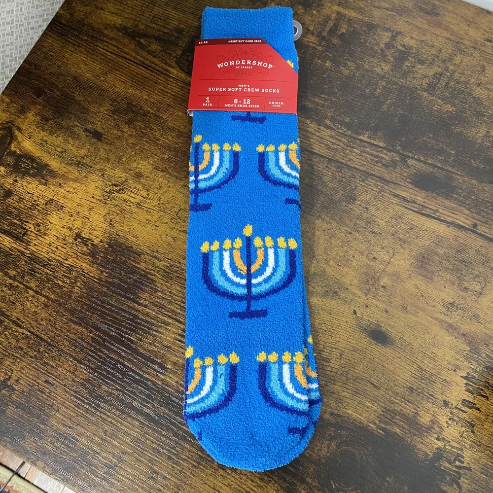 Get ready to celebrate the holidays with these cozy slipper socks featuring a fun Chanukah Menorah design. Made from a soft and durable polyester blend, these crew socks are perfect for everyday wear and come in one size that fits most. They are machine washable for easy care and maintenance. The colorful and novelty socks are ideal for winter and fall seasons, and they are a great addition to your sock collection. The Wondershop brand socks are made in China and come as a single pair in the pack. With a festive theme, these socks are perfect for parties, casual wear, or as a comfortable accessory to wear around the house.