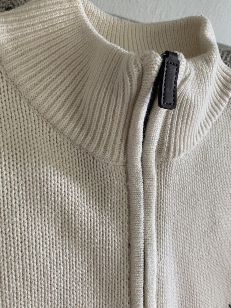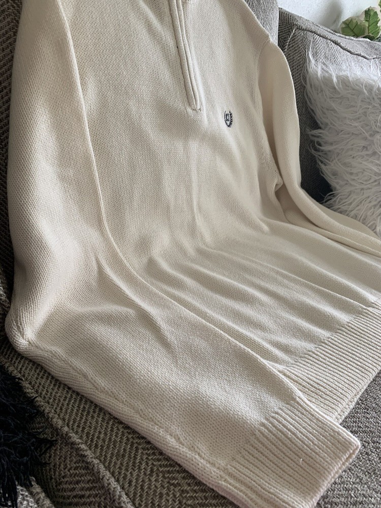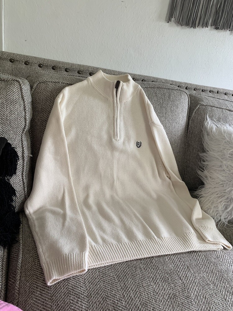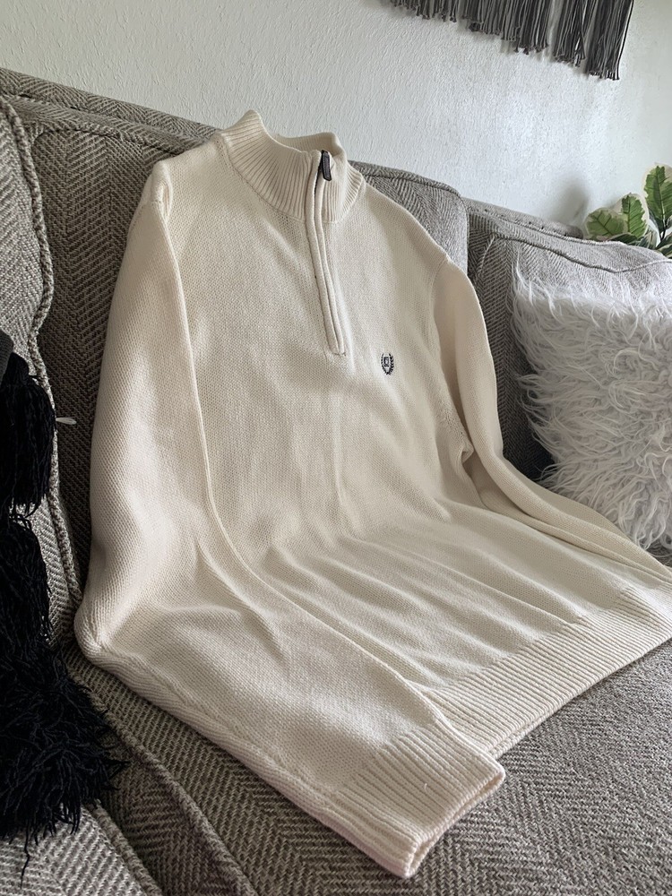 Chaps Men's Sweater in Cream color is a comfortable and cozy pullover made of cotton with a tight knit style. It features a high neck with long sleeves and a button accent. This sweater is suitable for various occasions such as travel, wedding, party, casual, formal, and business. It is available in size L and can be machine washed. The colorful theme and solid pattern make it a perfect fit for winter, fall, and spring.