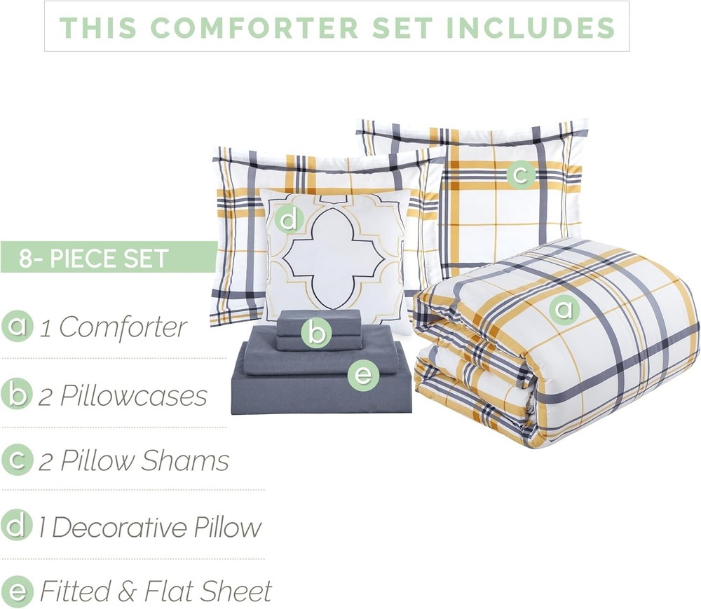 Charming Lodge Style 8-Piece Gold Plaid Comforter Set with Cozy Storage Features < class="slides"> ‹ › ‹ › ‹ › ‹ › ‹ › ‹ › ‹ › ‹ › ‹ › Charming Lodge Style 8-Piece Gold Plaid Comforter Set Indulge in elegance with our luxurious 8-piece comforter set designed to transform your bedroom into a cozy retreat. Dimensions: 1 Comforter: 68" X 90" 2 Pillow Shams: 20" X 26" 1 Flat Sheet: 66" X 96" 1 Fitted Sheet: 39" X 80" (Deep-pocket up to 16 inches) 2 Pillowcases: 20" X 30" 1 Decorative Pillow Craftsmanship: Crafted with firm stitching that prevents filling from shifting and bunching, providing an even layer of warmth. Quality Materials: Made from stain, shrink, and wrinkle resistant microfiber for a soft, cozy feel. OEKO-TEX 100 CERTIFIED: Tested for harmful substances ensuring safety and environmental friendliness. Convenient Storage: Includes bed sheets with double-sided storage pockets on the fitted sheet for easy access to personal belongings. Benefits: Stay organized with handy side pockets for glasses, remote controls, and more. Experience a fabulous night's rest with the cozy warmth of 100% down fiber filling. Machine-washable convenience for effortless care. Elegant patch and plaid design complements any decor, perfect for gifts on any occasion. Tumble dry for a quick refresher or air dry to maintain its luxurious quality. Why Choose Our Gold Plaid Comforter Set? This exquisite comforter set not only provides warmth and comfort but also elevates your bedroom aesthetics. Designed for all-season use, it guarantees a cozy ambiance -round. With double-needle sewn construction, you can rest assured of its lasting beauty and functionality. Make every night a luxurious experience—order your Charming Lodge Style 8-Piece Comforter Set today and embrace the cozy elegance it brings to your home! Shipping Free & Fast Shipping - We offer free shipping to most of the USA with a normal delivery time of 3-7 days. However, due to the current situation, additional delivery time (up to 3 weeks) may be required for some items. Alternative Carriers - We may use alternative carriers (e.g. USPS, FedEx, UPS, etc.) to ensure your package arrives safely and on time. Due to the use of multiple carriers, we are unable to provide a tracking number automatically. Handling Time - Orders are processed and shipped within 1-2 business days of receiving cleared payment. Shipping Restrictions - Shipping to Alaska, Hawaii, Puerto Rico, Guam, and other US territories may incur shipping charges or delivery restrictions. Please contact us before ordering, or your order can be refunded/cancelled. State Restrictions - There may be restrictions based on your state of purchase. For example, certain items may not be shipped to California due to state regulations. Contact for Tracking Updates - If you require tracking updates or have any concerns about the delivery of your order, please feel free to contact us, and we will be happy to assist you. Return 30-Day Hassle-Free Returns - We want you to be completely satisfied with your purchase. If you are not, you can return the item within 30 days of receiving it for a full refund or exchange. Easy Return Process - To start a return, simply contact us and we will provide you with a prepaid return shipping label and detailed instructions. Restocking Fee - There are no restocking fees for returns. However, the buyer is responsible for return shipping costs if the return is not due to a seller's error. Refund Processing Time - Refunds will be processed within 5 business days of receiving the returned item in its condition. Payment We accept all major credit cards, PayPal, and Apple Pay for your convenience. Your payment information is secure and encrypted to ensure a safe and seamless transaction. Please complete your payment within 3 days of purchase to avoid any delays in shipping. Feedback Your feedback is extremely important to us. We strive to provide the best products and customer service possible. If you are satisfied with your purchase, please take a moment to leave us a positive review. If you have any concerns or issues with your order, please contact us before leaving negative feedback. We are committed to resolving any problems and ensuring your satisfaction. Contact Us If you have any questions or concerns, please feel free to out to our customer support team. You can contact us through the eBay messaging system. We are available Monday to Friday, 9:00 am to 5:00 pm EST, and we will do our best to respond to your inquiry within 24 hours. Buy it now and enjoy a pleasant shopping experience! Set Includes: Bed Skirt,Comforter,Decorative Pillow,Fitted Sheet,Flat Sheet,Pillowcase,Pillow Sham,Comforter Set Material: Microfiber Features: Hypoallergenic,Lightweight,Reversible,Stain Resistant,Water Resistant Care Instructions: Do Not Bleach,Machine Wash,Machine Wash Cold,Tumble Dry Low Department: Unisex Baby & Toddler,Kids,Teens,Adults Room: Bedroom Size: Twin Type: Comforter Set Color: Gold Fill Material: Down Pattern: Plaid Number of Items in Set: 8 Style: Lodge Character Family: Charmed Insulation: All Seasons Season: All Closure Type: No Closure Thread Count: 150 GSM (Grams per Square Meter): Below 150