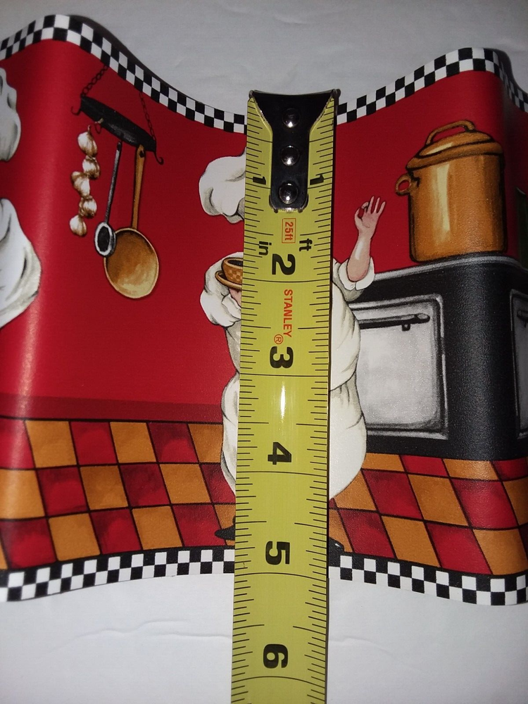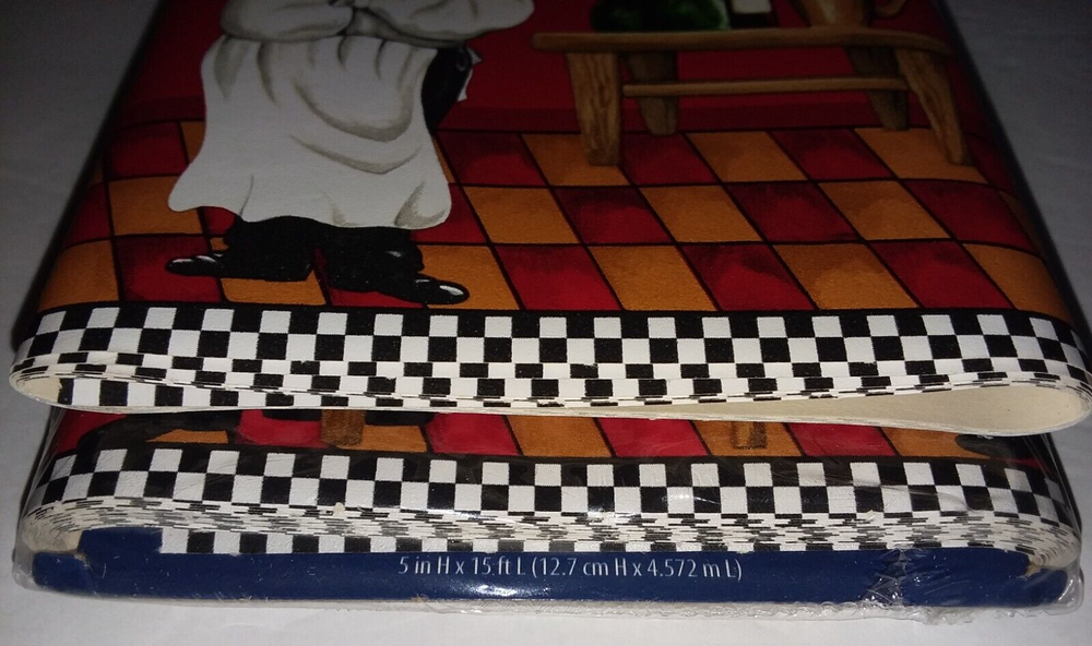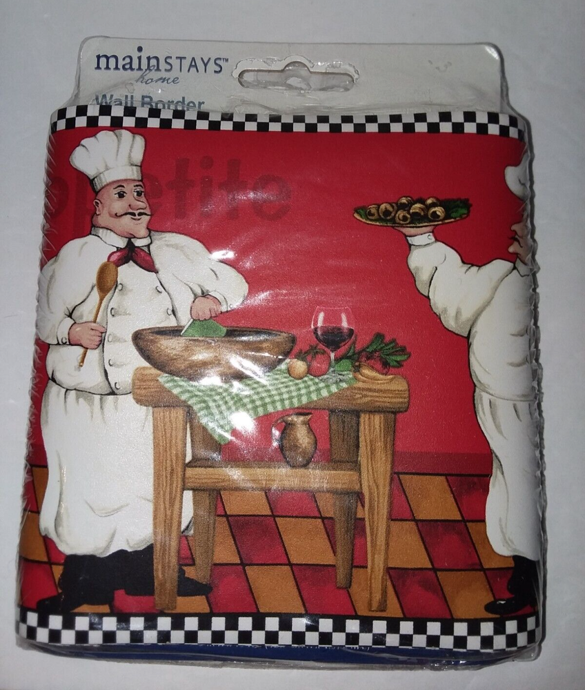 Mainstays Home Chef Wall Border / Wallpaper / Wall Decor. Says "Bon Appetite." Main colors are: Red and White, with browns, black, and green. The sealed one measures 15 feet long and 5 inches high. The opened one measures 66 inches long. The condition is pre-owned. 1 unopened package. 1 opened package. The items may have signs of cosmetic wear, but they should function as intended. Please see the photos as they are part of the description. All photos represent the exact item you will receive. Payment is expected within 3 days after the end of the auction or from the date an invoice is issued. All orders are shipped within 48 hours of payment clearance. Extra insurance will be added at no extra cost to the buyer, if necessary. We will combine shipping on multiple purchases. Please wait for an invoice with the adjusted price before paying. Please note that we use reclaimed boxes and packaging materials to do our part for the environment. Thank you for supporting small businesses!