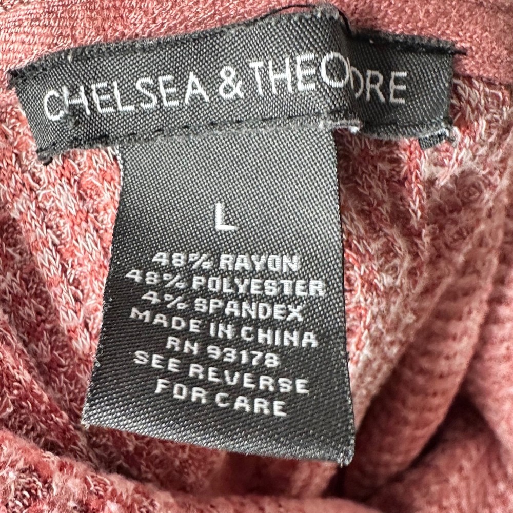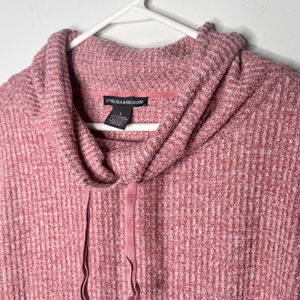 Say hello to your new favorite sweater! This Chelsea & Theodore pink cowl neck sweater is ready to keep you cozy while you binge-watch your favorite shows. Top is in EUC • Cowl neck design • Soft and stretchy fabric • Long sleeves • Ribbed texture • Easy care instructions Top to bottom = 24 inches #classiccore #classic #preppy #cozy #fall #autumn #winter #basic #everyday #neutral #minimalist #lounge #loungewear Chelsea & Theodore women's pink waffle knit cowlneck light weight sweater top - Color: Dusty rose pink - Material: Rayon blend - Long sleeve - Cowl neck neckline with adjustable drawstrings - Waffle knit - Loose, oversize fit - Lightweight material Features: • waffle pullover cowl lightweight sweater Size: Womens L Item is in EUC.