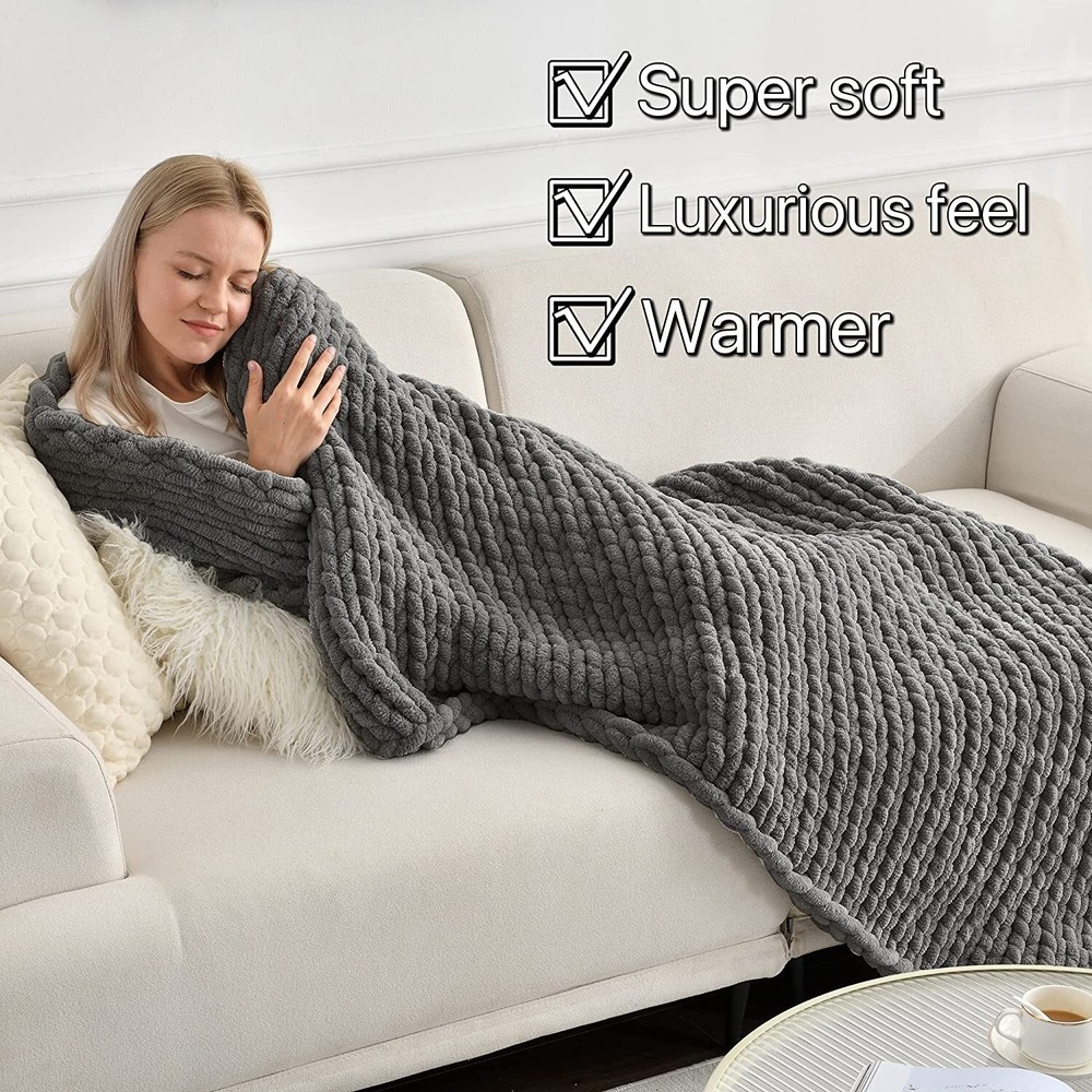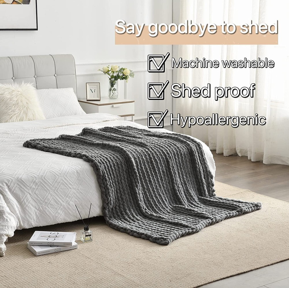 Chenille Chunky Knit Blanket Throw 40×50In Handmade Warm & Cozy Blanket Grey US Product Description -Newly Upgraded Encrypted Version :Maetoow has upgraded its Chenille Blanket knitting processes. While maintaining the loose style of the blanket, Maetoow has increased its density, reduced its looseness, made it difficult for fingers to slide in between the stitches, enhanced its security and functionality to use, and made it warmer. -Non-shedding & strong material - made of the newly upgraded high-quality chenille yarn. The blankets will neither shed nor break over time. Perfect experience guaranteed! Money well spent! -As soft as a cloud - The newly upgraded chenille yarn has a touch as soft as a cloud, and a slight sheen that brings out a luxurious feel. Our blankets made of chenille yarn carry the same perfect amount of weight as those made of Merino wool do, and give you the sense of security that you need. -A tasteful decoration - One feature of our blankets is that they are hand knitted with big needles. They are home décor that follows the hottest trend on Instagram. No matter where you put it, the space will become more lively because of it, as if it were designed to be so. This is absolutely a purchase that will indicate your good taste. -A special and thoughtful gift - Who would turn down such a fantastic and special handmade gift? Most likely no one. You can get one for your lover, parents, families, friends, or pets. You can give it to them on Christmas Day, Thanksgiving Day, Mother's Day, Valentine's Day, or other special occasions. This will be your perfect gift! Even your pets might show you how much they love this soft and warm gift when they receive it! -Handle with care - In order to make sure that you can use this blanket for as long as you like, and to prevent abrasion, please always wash it separately with cold to warm water and neutral detergent. Do not soak or dry for long, and lay flat to dry. What's in the Package 1 x Chunky Knit Blanket ( 40×50 Inch) Dark Grey Thank you for shopping at our store.