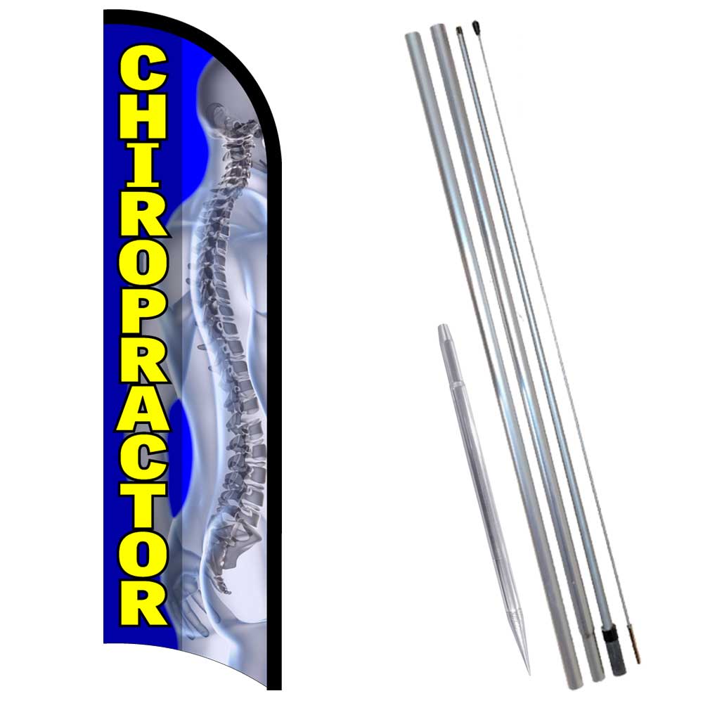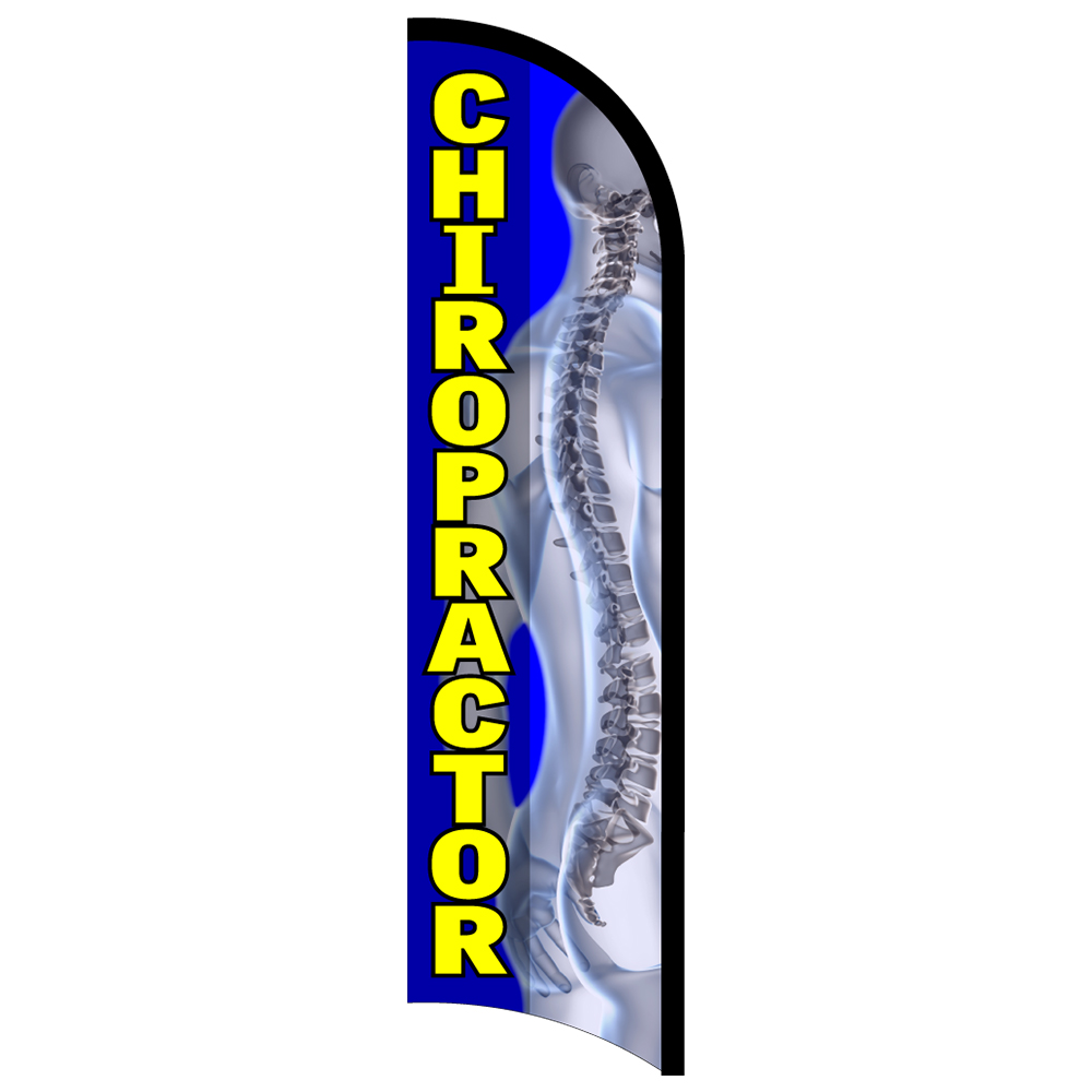 Chiropractor Premium Windless Feather Flag Bundle (Complete Kit) OR Optional Replacement Flag Only Our Chiropractor Premium Windless Flag is digitally printed using UV fade-resistant inks on high quality flag material, so our Premium flags last 2 to 3 times longer than our standard stock flags. This flag is 11.5 feet tall and when placed on our 15 foot long hybrid banner flagpole (available as an option) stands at a stately 14 feet tall. This very attractive 11.5 foot tall by 3 foot wide flag brilliantly announces your message and really attracts attention. You SAVE 20% off Retail when you buy our Chiropractor Premium Windless Premium Windless Flag as a bundle. To save on the bundle select the Kit option from the boxes above and get all you need to set up and fly this beautiful flag. The Flag Kit Bundle features this 11.5 foot tall flag, a 15 foot long hybrid banner flagpole, and a ground mount stake (for use in grass or turf). You also receive a complimentary flag clip, which is used to reduce wear at the top end of the flag. Options You can purchase our Chiropractor Premium Windless Premium Windless Flag alone as a replacement flag, or as a bundled kit with all you need to set up and fly this flag on grass or turf. You can select the Bundled Kit by using the box that says Kit. For the replacement flag click on the box that says Flag Only. Our flag kit is very easy to assemble , so you can have your flag up in minutes, and with the estimated daily cost of this form of outdoor advertising at 30 cents a day, you will be enjoying one of the best advertising values available. SKUs: Flag Only , Kit UPCs: Flag Only , Kit Information This is a huge flag . When placed on our 15 foot long hybrid banner flagpole (available as an optional bundle) it stands at a stately 14 feet tall (as tall as two NBA players, with one standing on the others shoulders). This very attractive 11.5 foot tall by 3 foot wide windless-style flag brilliantly announces your message and really attracts attention. Not only is our Chiropractor Premium Windless Premium Windless flag easy to set up and use, this windless-style feather flag is also one of the most economical advertising techniques available, especially for advertising outdoors. We calculate the per day cost to you by figuring that if you purchase a complete kit and one additional flag at one time you will spend about $109.98, plus shipping. Conservatively, these two will last a year, and usually a lot longer (depending on your specific conditions). Changing out your advertising flags more often than is necessary keeps them looking their best, keeps a fresh, bright presence and gives your location a highly professional impression, while attracting attention to your flag signage. So the total cost of this awesome form of outdoor advertising, a Vista Flags feather banner flag with pole and mount, is only about 30 cents per day! That is a great value for any kind of outdoor advertising! Windless Flags Windless flags have the top part of the pole sleeve go all the way to the end of the flag. That allows the message to always be available even in no-wind conditions. Flutter flags (aka Swooper flags) have the sleeve stop 8-12" short of the end so they can flutter in the wind. Attracting attention, but the text is only partially readable. You are purchasing a WINDLESS-Style flag . Windless Feather Advertising Flags are generally preferred by most people because, unlike regular flags or our Flutter-style flags, Windless Feather Flags don't require wind to present your message. Our windless flag is at its best an any kind of weather and is perfect for using indoors. Feather Flags Feather advertising flags are called feather because of their shape. Feather advertising flags, whether you prefer windless or flutter style, are a great advertising product for outside and even for inside, at a great price. We get a lot of questions about the name of the flags. We call our feather advertising flags either windless or flutter, depending on the way the sleeve is attached to the flag. Other people use different names like Blade flags, Tall flags, Flying Banners, Bowhead Banners, Windfeather Flags, Bow Flag, Wind Sail Sign, Windblade Flag and Flying Blade flags. Some refer to them as Swooper flags. Swooper Flags are equivalent to our Flutter-style flags as are Super flags. Most of our feather flags are 3 feet wide, where other vendors often limit the width to 2.5 feet or even 2 feet in some cases. The 3 foot wide feather flags, especially at 11-12 feet tall look so much better, and you are getting more square footage of advertising area. We have never been fans of teardrop-style flags and while they are technically feather flags they don't provide enough advertising area to justify their existence. Teardrop flags are cute though. Feather advertising flags are called feather because of their shape. Feather advertising flags, whether you prefer windless or flutter style, are a great advertising product for outside and even for inside, at a great price. Printing Most of our premium flags are printed on two sides using a heat press so there is as much ink on the front as the back. This makes for a beautiful, long-lasting image. Many of our flags are digitally printed or screen printed and the ink "bleeds through" the fabric so the image is visible on the back side. These printing types (digital or screen) gets varying amounts of ink through. Screen printed flags tend to be very bright on the back side of the flag while digitally printed flags will vary on the amount of penetration by color. While exact penetration percentages are really just guesses, we calculate we generally get 95% bleed through on screen printed (most of our stock flags) and 85-95% on our digitally printed flags, which would include some of our custom flags, our premium flags and a few of our stock designs. With all of our print techniques, except double-sided flags, the back side image is reversed. This is generall