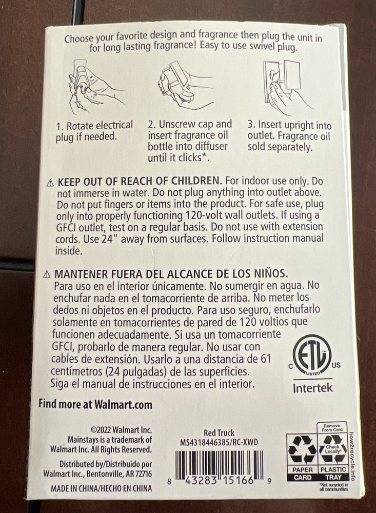 Description: New in original packaging. Mainstays Red Truck oil diffuser. Easy to use swivel plug. Oil sold separately - see box front for compatibility. Please message us with any questions you may have. All items are well packed and shipped promptly. We only ship to the contiguous United States. Thank you for supporting our small business!