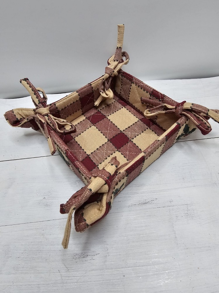 A new 5" square, 2" high, tie basket with holly embroidery on the side. Well made and ready for your holiday decor....