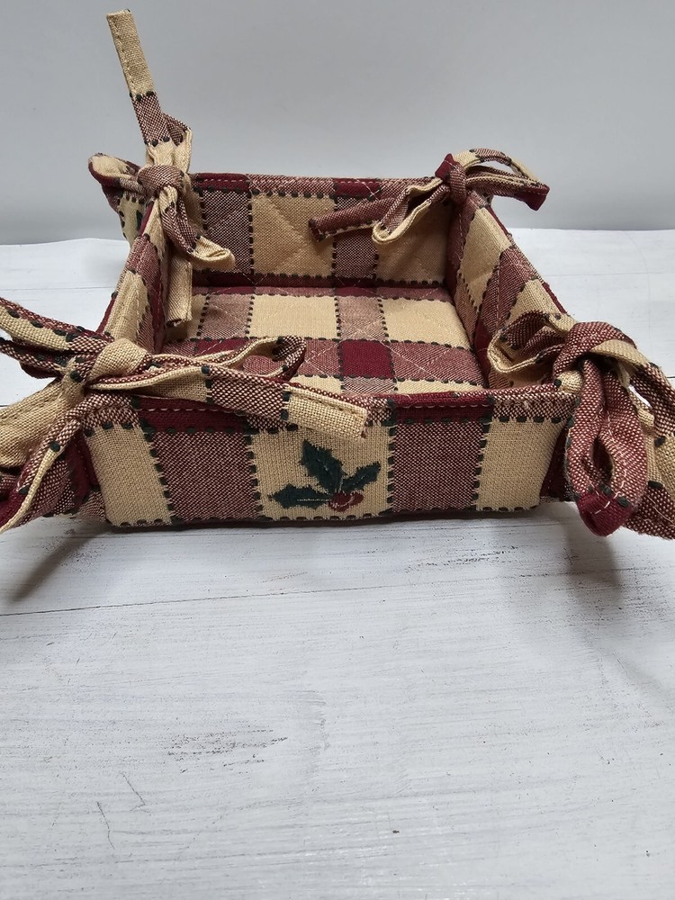 A new 5" square, 2" high, tie basket with holly embroidery on the side. Well made and ready for your holiday decor.