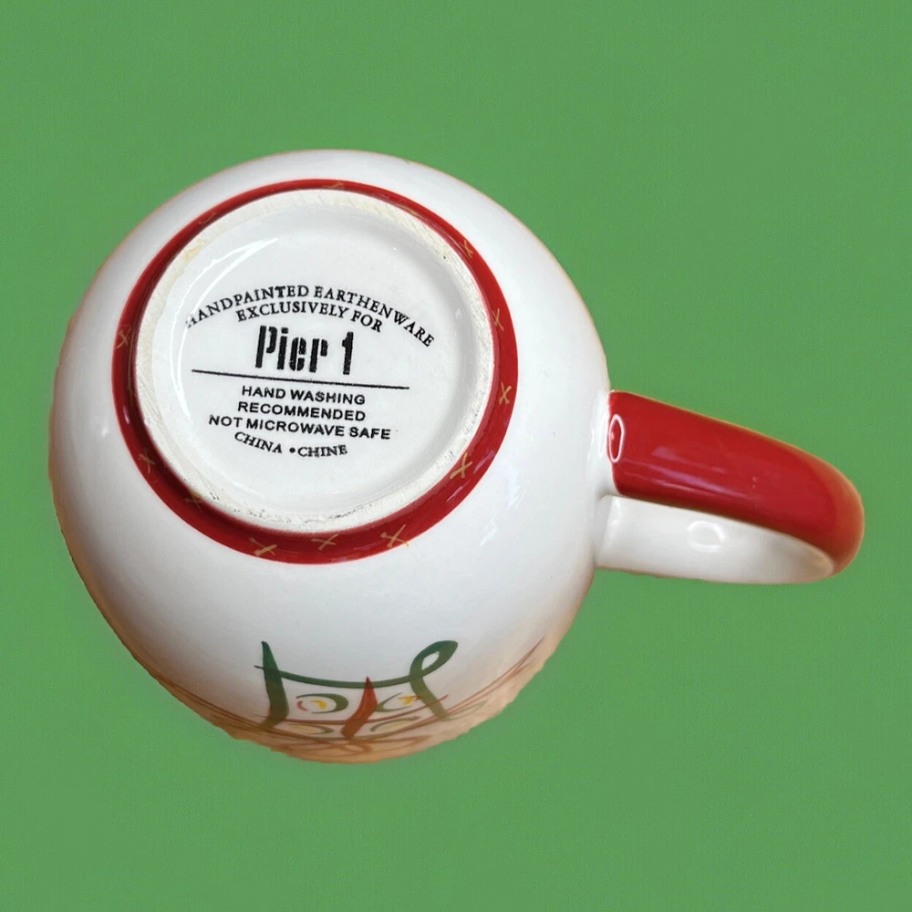 Pier 1 Christmas Mug Hand Painted Earthenware Red Green Gift Wrap Design Holiday Cup Detailed Description: Add a festive touch to your holiday season with this beautiful Pier 1 Christmas mug, featuring a charming hand-painted gift wrap design in red, green, and white. Crafted exclusively for Pier 1 Imports, this unique earthenware mug is perfect for sipping your favorite warm drinks while embracing the holiday spirit. The intricate hand-painted details make it a lovely piece for display as well as everyday use. This collectible Christmas mug is made of high-quality earthenware, ensuring durability and a beautiful, rustic finish. Please note that hand washing is recommended to preserve its delicate artwork, and it is not microwave safe. Key Features: • Exclusive Design: Made for Pier 1 Imports with a festive gift wrap motif • Hand-Painted Earthenware: Beautifully crafted with attention to detail • Holiday Colors: Features classic red, green, and white for seasonal charm • Care Instructions: Hand wash recommended; not microwave safe • Perfect for Collectors: A great addition to any holiday-themed collection Condition: Excellent pre-owned condition, carefully used or displayed with no visible flaws. We will take great care in shipping to ensure safe delivery. Feel free to message us with any questions or concerns! *I try to be absolutely truthful in my descriptions & disclose any flaws. Every effort is made to describe them accurately with photos provided as part of their description. Many of our items are vintage condition or pre-owned, reflecting their journey through time. If not we try to sell new in the box. We do have a smoke free home. Please see photos for all natural wear. If you have any questions, don’t hesitate to contact me. Please note that color may look slightly different on different monitors. All items are packaged & shipped with love & care within 1-3 days of your purchase. Please be aware that once shipped, it is out of our control on time delay. There will be a shipping discount for multiple orders. Thank you for stopping by my store & I hope you will make me a favorite. Happy shopping from the beautiful Emerald Coast, Coastal Haven Treasures M