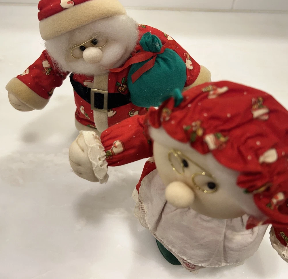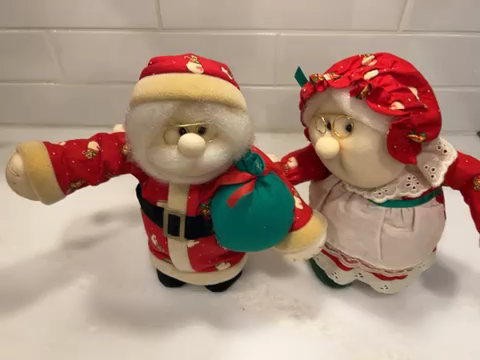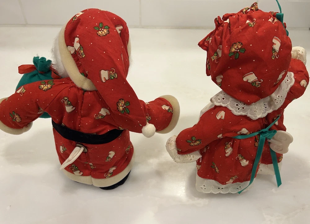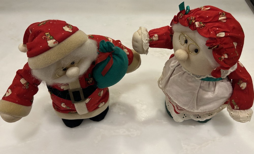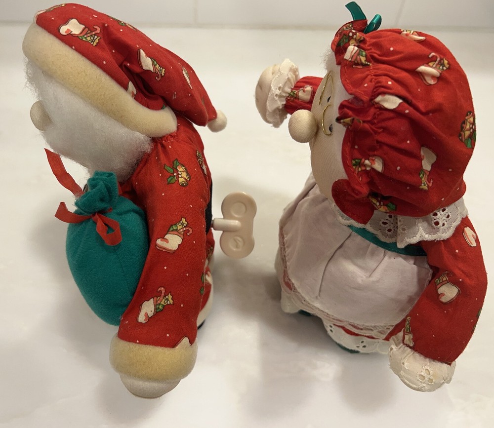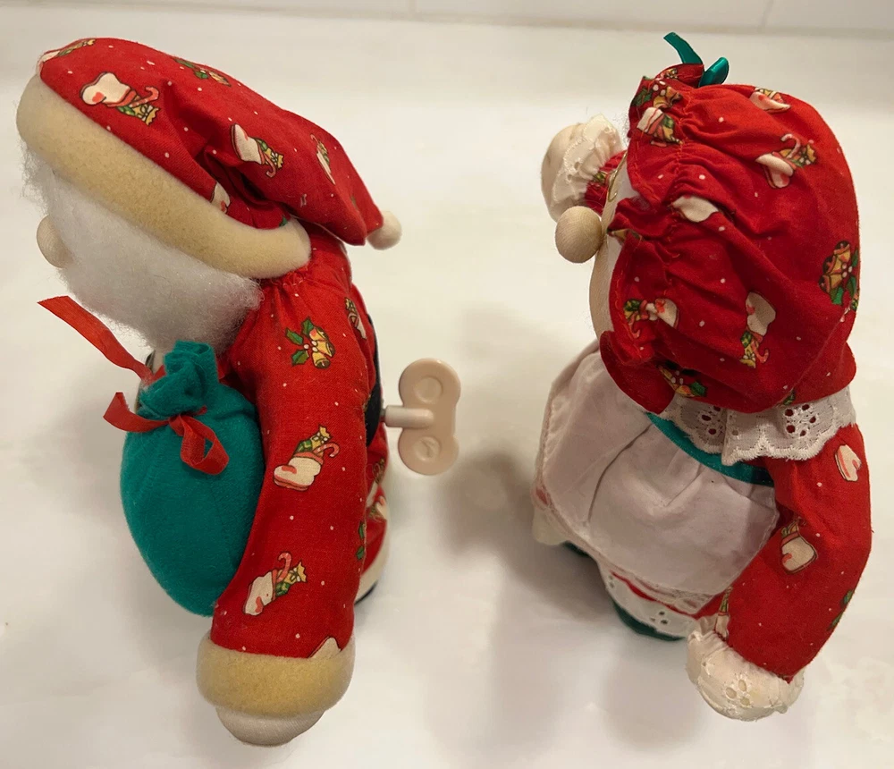 Vintage Santa and Mrs. Claus Animated 10” Wind Up No Batteries Made In Taiwan. These Are A Fantastic Wind Up Claus Couple. They Played Christmas music and their heads and arms move together. These Are Vintage; Please Inspect the Pictures As These Are The Actual Items Being Shipped. Dance with Santa and Mrs Claus Be Ready to get In The Christmas Spirit when That Time of Year Rolls Around.
