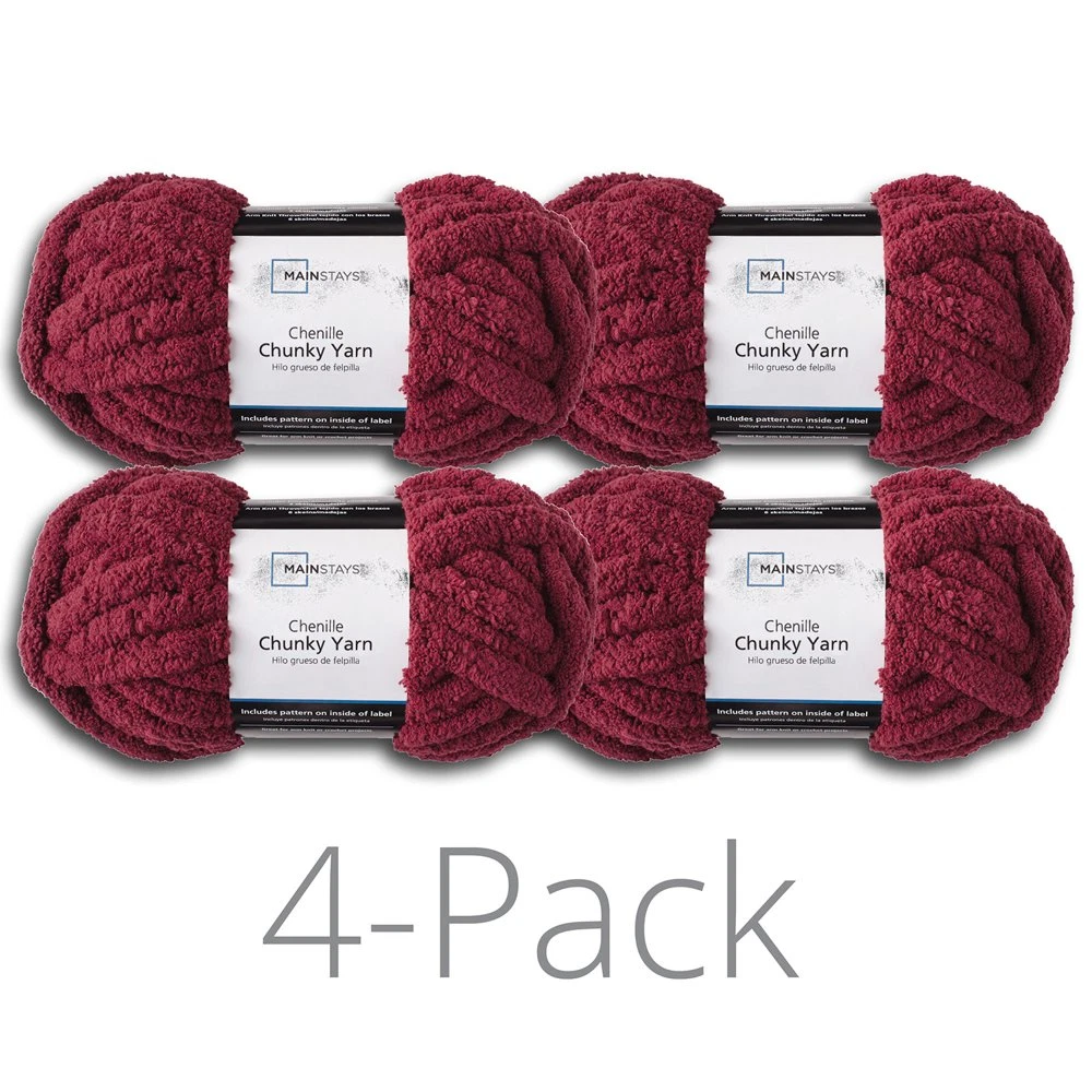 Store New Arrivals Add to Favorite View Feedback Contact Chunky Chenille Yarn Burgundy 100% Polyester Super Bulky 31.7 Yd Pack of 4 Description Features Easy care, machine washable and dryable Brand Mainstays Fabric Content 100% Polyester Condition New Manufacturer Part Number TTR16105-DS-BG Color Red Perfect for all knitting levels from experts to beginners looking to learn how to knit, Mainstays Chunky Chenille Super Bulky Yarn 4 Pack is thickly spun to be easy to use and includes three patterns inside the label. Easier to work with than lighter weight yarns, chunky yarn is ideal for use with 17 US/11mm needles as well as arm knitting. Creating warm blankets, scarves, sweaters, hats, and more is easy with the 31.7 yards of Mainstays Chunky Chenille Yarn in each of the 4 balls (for a total of 126.8 yards). Made of durable 100% polyester. Super bulky knitting yarn is easy to work with Chunky chenille yarn is perfect for many types of knitting Ideal for beginning knitters and experts alike Includes a pattern on the inside label Makes completing large projects easy Great for creating warm blankets, scarves, hats, sweaters, and more Includes 31.7 yards of chunky chenille yarn Available in Vanilla Dream, Soft Silver, Corsair, Light Pink, Charcoal, Metropolis Burgundy, Aqua, and Black Durable 100% polyester construction Easy to care for: Machine wash cold. Dry flat in shade. Do not bleach. Do not iron. Do not tumble dry. Do not dry clean. ABOUT US We offer the best prices around on high quality products. Our E-store includes media such as books, movies, music and games while offering electronics, toys, sporting apparel, clothing, tools, general home, garden items and more. SHIPPING We are always working hard to ensure your package arrives as soon as possible. Please understand that some factors like weather, high postal traffic, and the performance of shipping companies are outside of our control. We offer free shipping to the lower 48 states and ship within 3 business days of payment, usually sooner. We do not accept P.O. Boxes. Please provide a physical address. RETURNS We offer a 30-Day Return Policy on items which you are not completely satisfied with. You have the option for a full-refund or an exchange of the item. No returns are available on items shipped outside of the USA. PAYMENT We accept PayPal. CONTACT US This page content is yet to come Please ad us to your favorite seller and visit again later Thank You CUSTOMER SATISFACTION We try our very best to make sure every customer is completely satisfied. If there's a problem, message us! We're happy to help.