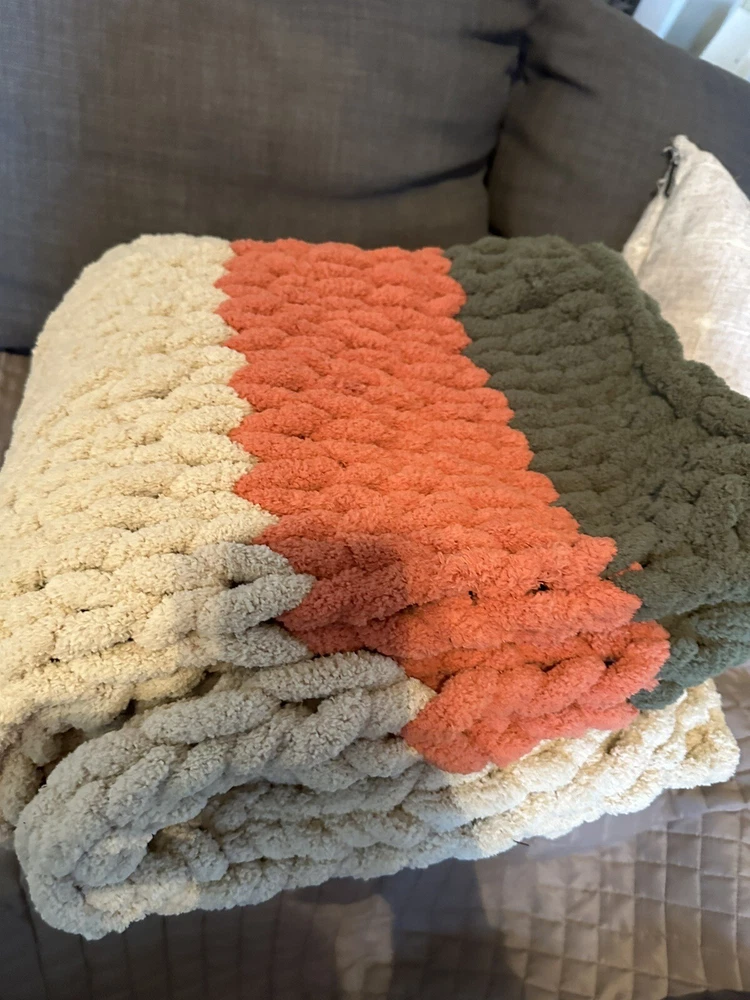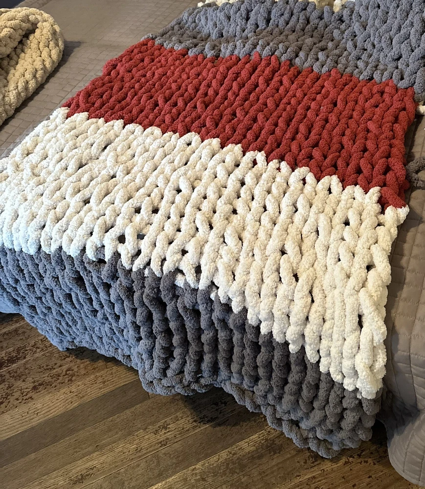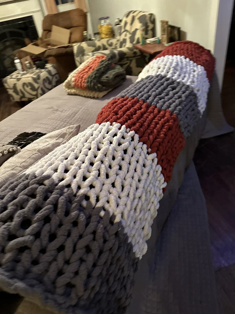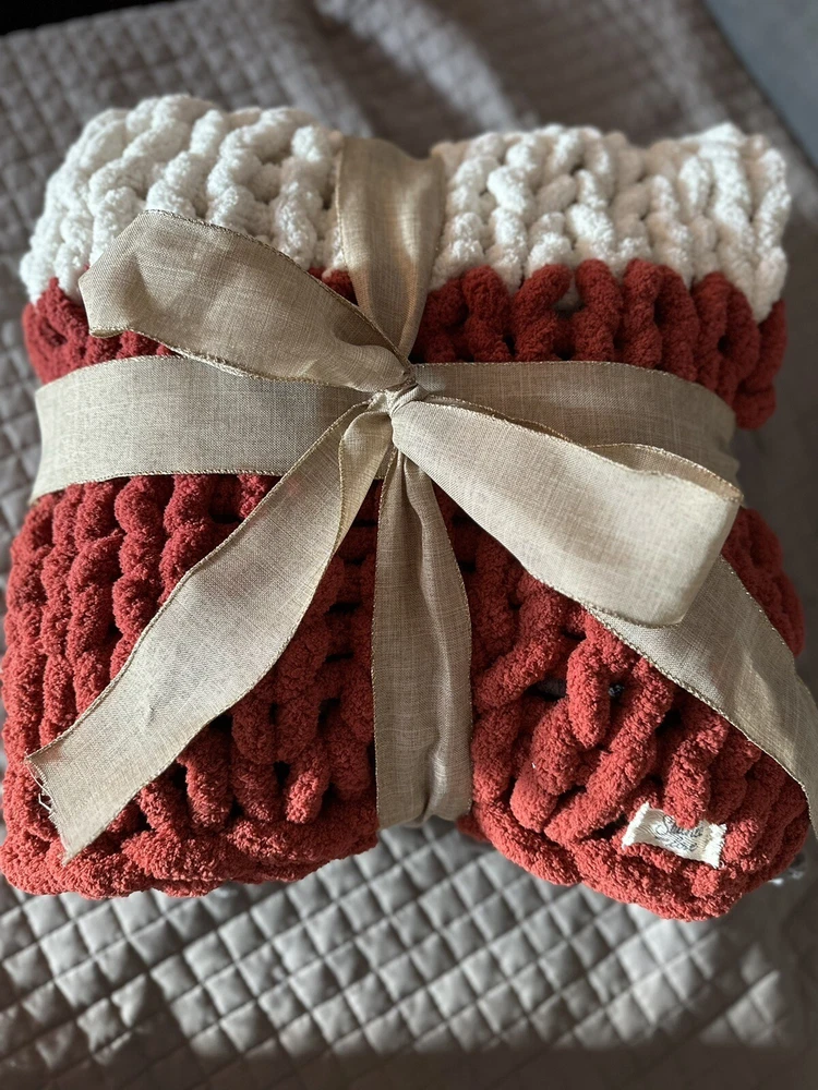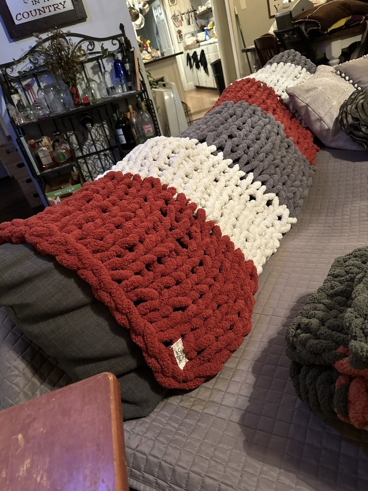 Add a touch of coziness to your bedroom with this Chunky Knit Handcrafted Throw. Measuring 40x60 inches, this blanket is perfect for snuggling up on chilly nights. The solid color design and any color options complement any decor theme. Made of soft polyester material, this blanket features a chunky knit texture that adds a cozy feel. Use it to add a pop of color and warmth to your bed or couch. Care - gentle cycle or hand wash. Line dry, do not dry clean! Don’t forget to message me with the colors you would like after you pay! I get my yarn from Hobby LOBBY it’s Yarn Bee Eternal Bliss and am happy to offer whatever colors they have in stock. I also can do different sizes if you need one bigger just message and I can add a listing!