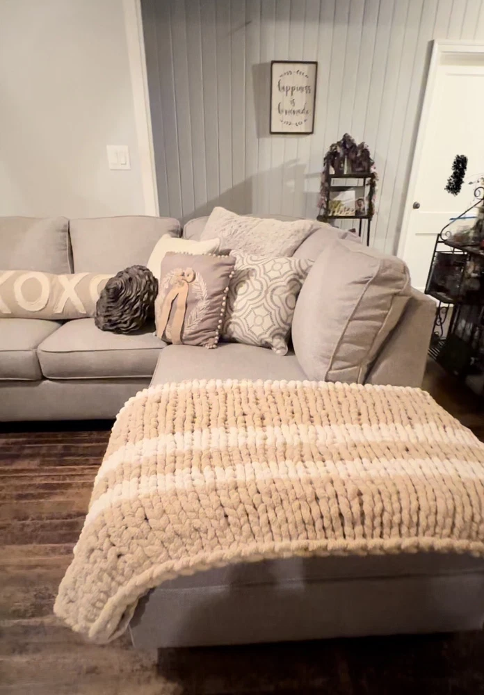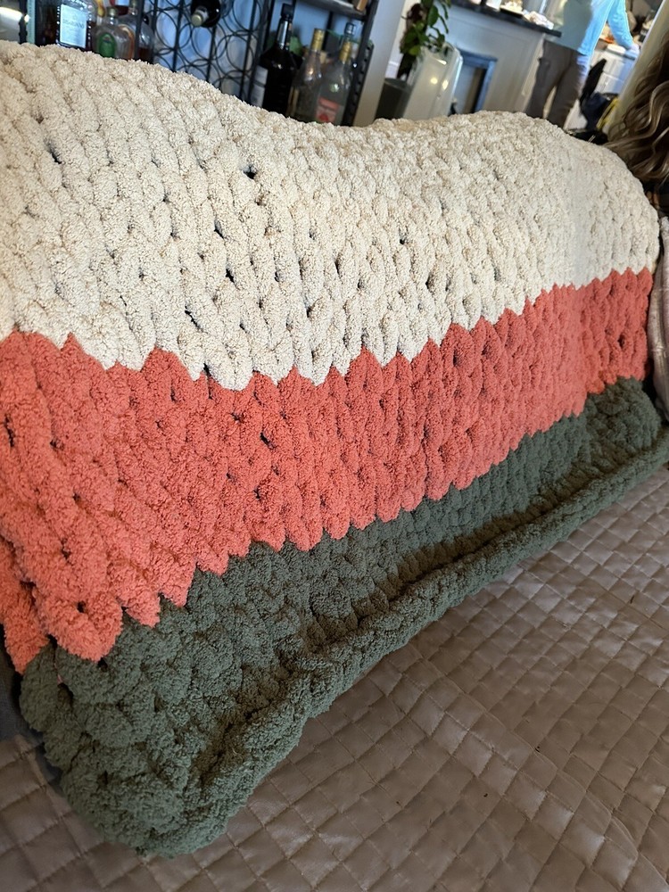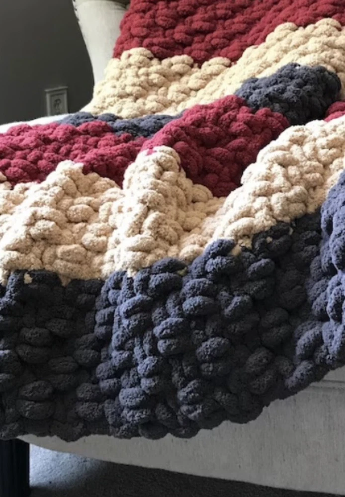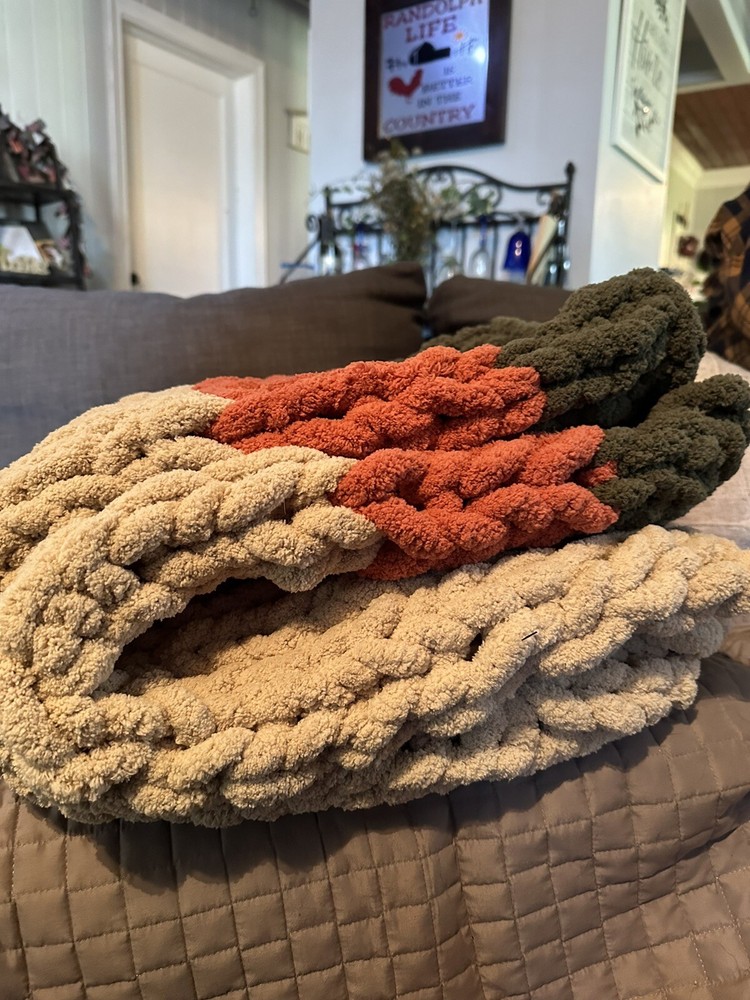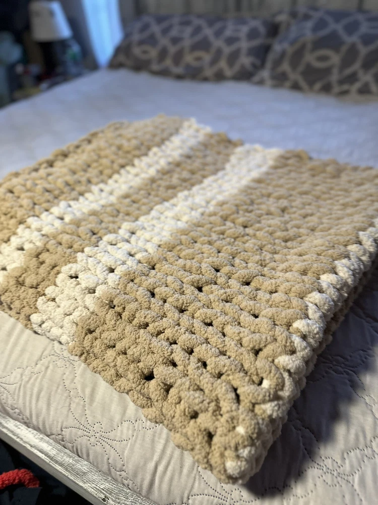 Add a touch of coziness to your bedroom with this Chunky Knit Handcrafted Throw. Measuring 40x60 inches, this blanket is perfect for snuggling up on chilly nights. The solid color design and any color options complement any decor theme. Made of soft polyester material, this blanket features a chunky knit texture that adds a cozy feel. Use it to add a pop of color and warmth to your bed or couch. Care - gentle cycle or hand wash. Line dry, do not dry clean! Don’t forget to message me with the colors you would like after you pay! I get my yarn from Hobby LOBBY it’s Yarn Bee Eternal Bliss and am happy to offer whatever colors they have in stock. I also can do different sizes if you need one bigger just message and I can add a listing!