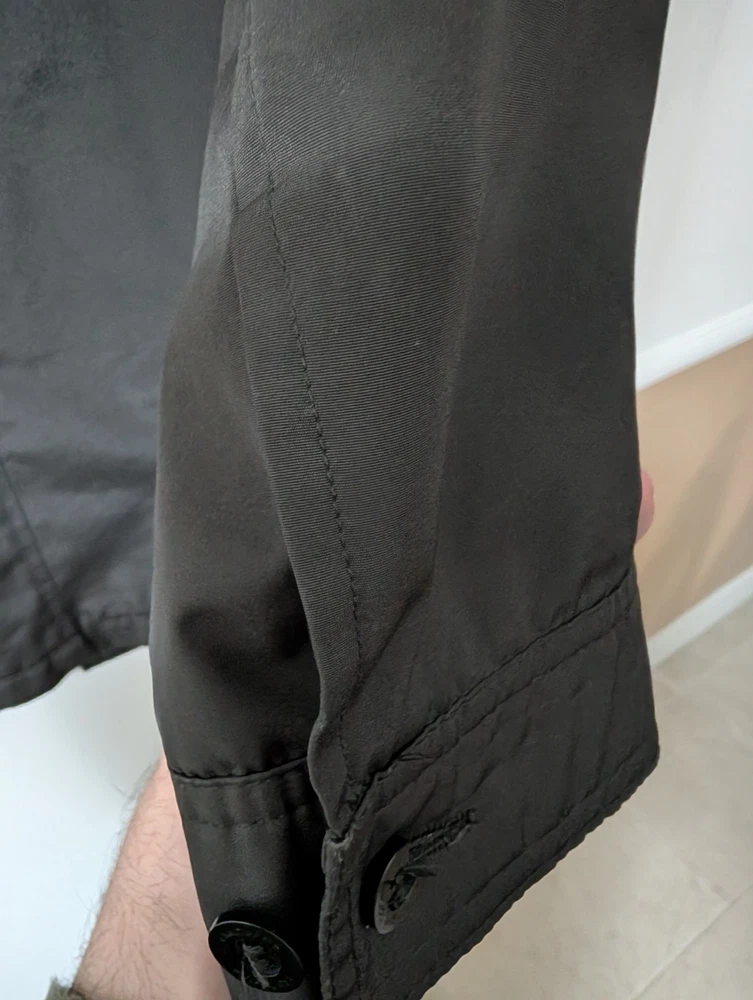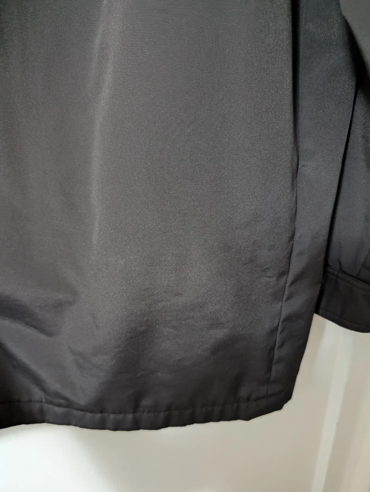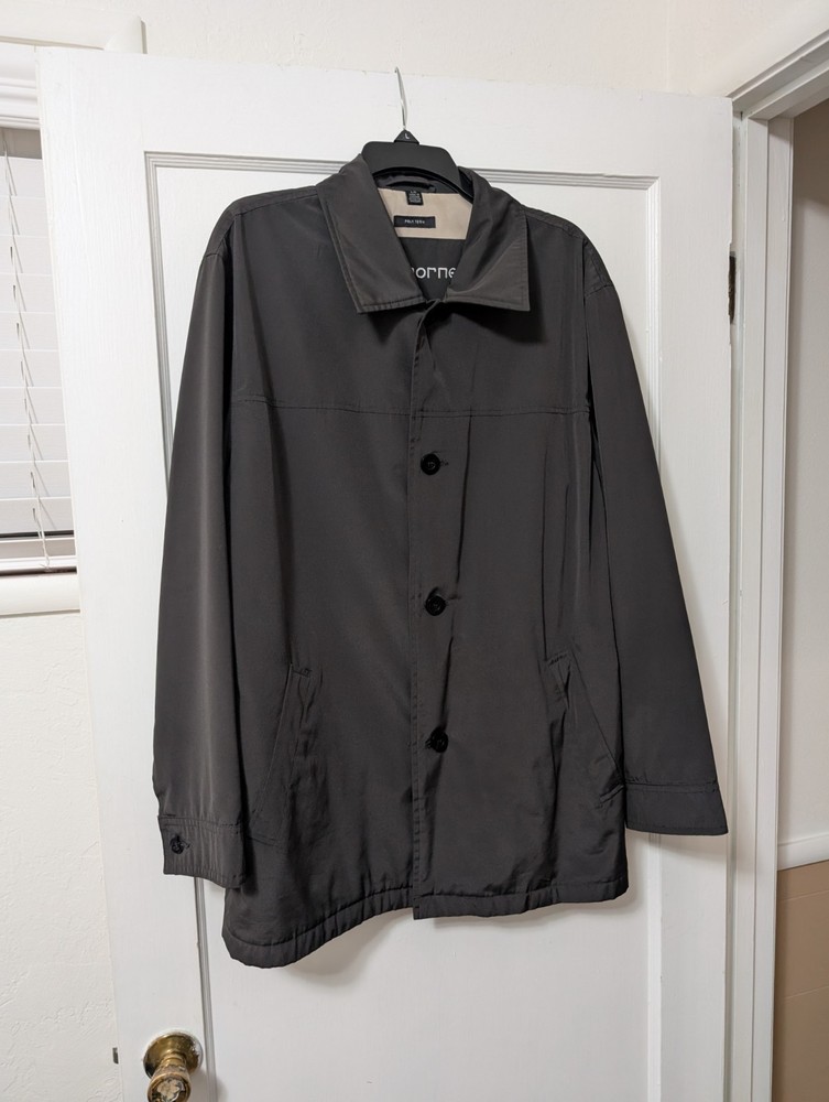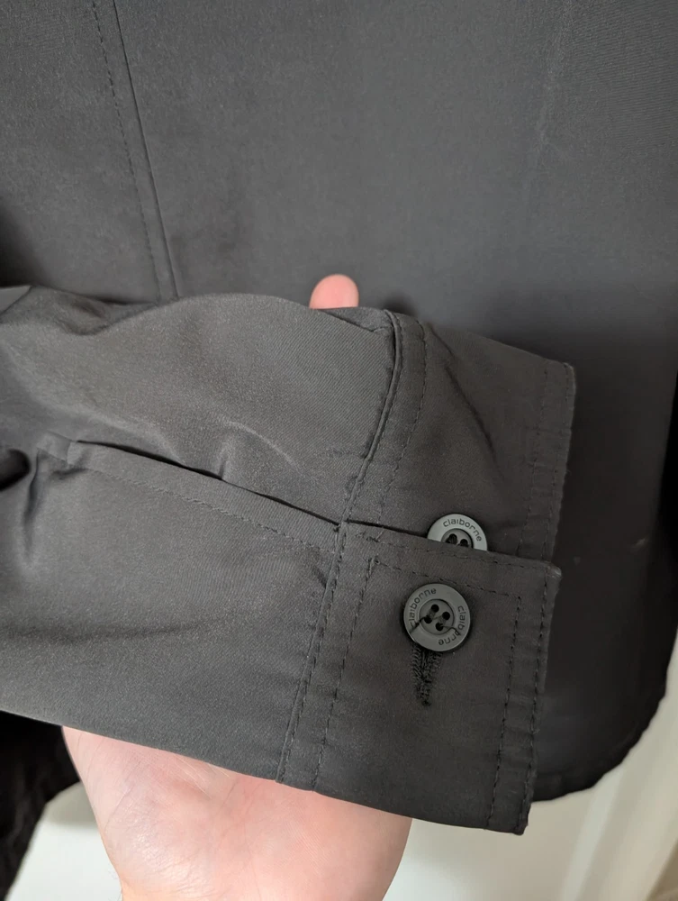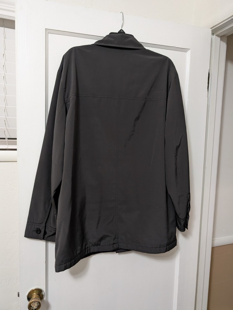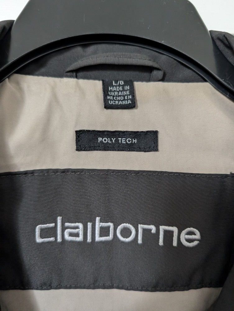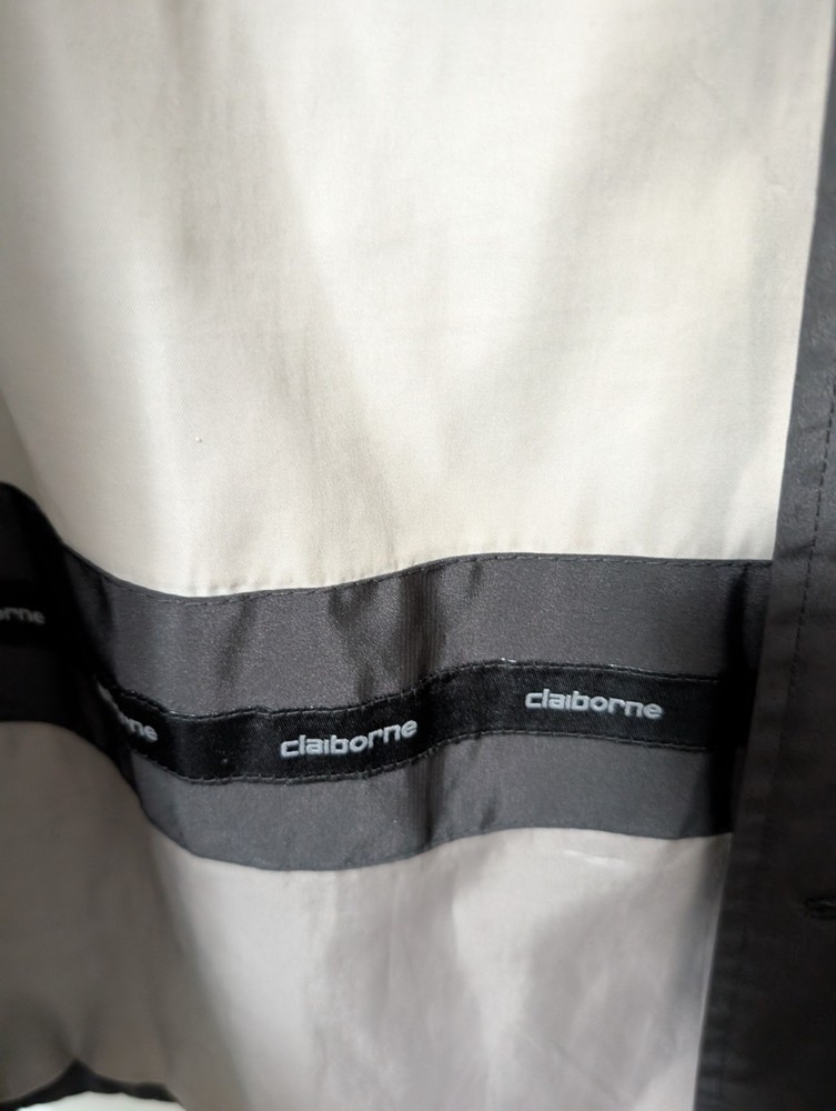 The Claiborne Vintage Men's Size L Black Poly Tech All Weather Jacket is a stylish and functional outerwear piece perfect for travel, casual outings, and business meetings. Made from polyester with a polyester and nylon lining, this jacket is machine washable and features a button closure, solid black color, and a relaxed fit. this all-weather jacket is lightweight, packable, waterproof, and wind-resistant, making it ideal for all seasons. Additionally, it includes a point collar, overcoat style, and various pockets for added convenience.