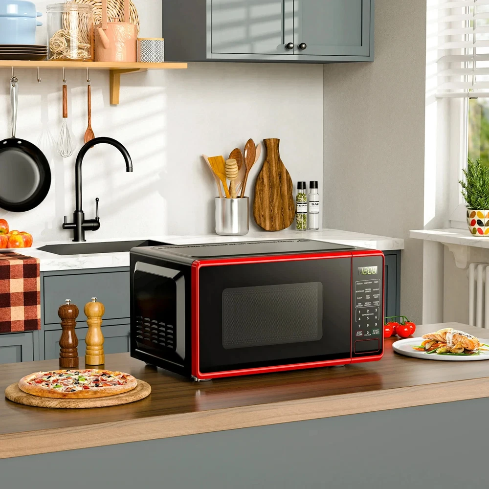 Mainstays 0.7 Cu ft 700-Watt Compact Countertop Microwave Oven. Features include LED display, kitchen timer & clock, 10 different power levels for cooking a variety of foods, weight & time defrost, 6 convenient quick-set menu buttons, 30 second one-touch option, child safety lockout and a push-button door. The Mainstays 0.7 Cu ft 700-Watt Compact Countertop Microwave Oven is the perfect addition to any home. Capacity 0.7 Cu ft LED display Kitchen timer & clock Weight & time defrost Child-safe lockout 700-Watt Power Push-button door opening 30 Second one-touch option Condition: New 10 Power levels 6 Quick-set menu buttons
