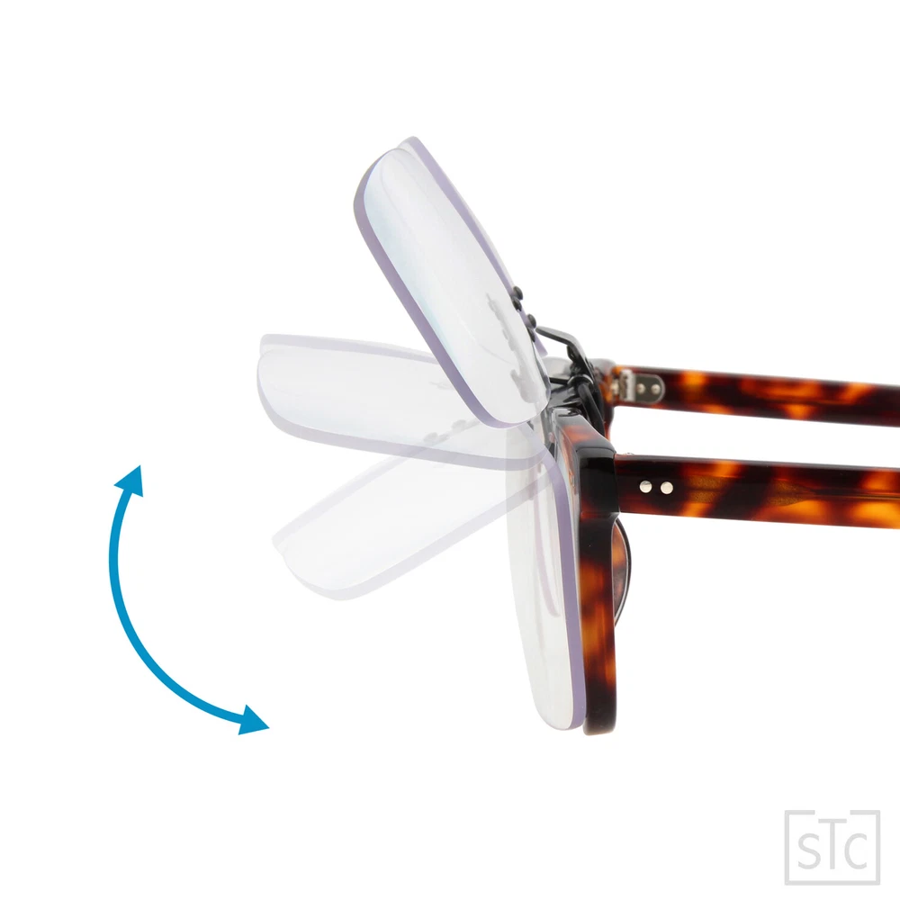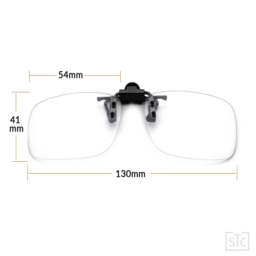 Clip-On Flip-Up Magnifying Readers STC clip-on flip-up magnifying readers are made to fit most glasses. Magnifying readers are great if you do occasional close-up work. Their main use is with periodic close-up examination, reading, and writing. Easy attachment and removal, superior protection and durability, and customized prescriptions mean convenience, easy pocket storage, and safe, healthy eyes. Lens size - 54mm x 41mm x 130mm Overall Width. Rimless Frame Lens width: 58x41 mm Wide Compatibility -Clip-On Sunglasses width 130mm, Lens width 54mm, Lens Height 41mm, Bridge width 14mm Suitable for most Prescription Glasses And Reading Glasses Super light and it doesn't add any significant weight to your glasses SMIZE55 ©