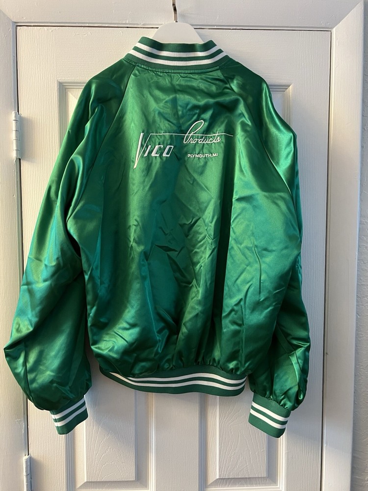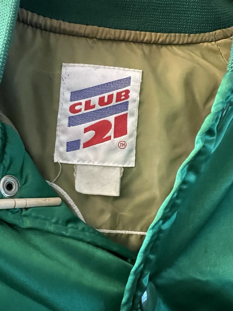 This Club 21 Vintage Jacket is a Large Green Nylon Bomber with a button-up closure, featuring a Western-inspired theme from the 80s and 90s. The jacket has a Stand-Up collar, elastic waist, and soft satin fabric lining for comfort. It is suitable for all seasons with its breathable and wind-resistant design, making it ideal for travel, parties, or casual wear. The jacket also includes pockets, a logo accent. Ben/a10