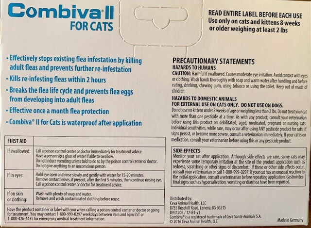 Combiva II for Cats over 9 lbs, 3 vials, same active ingredients as Advantage II Compare this to Advantage Purple over 9lb cat Once-A-Month Topical Flea Prevention and Treatment for cats For Use ONLY on Cats 8 Weeks and Older READ THE ENTIRE LABEL BEFORE EACH USE. For the Prevention and Treatment of Flea Infestations on Cats • Kills all flea life stages • Controls existing flea infestations on your cat and prevents further infestations • Kills fleas within 12 hours of application • Convenient, easy to apply topical solution • Fragrance-free • Waterproof 1. Be sure tube is at bottom of pouch. 2. Using scissors, cut the pouch across the top and remove tube. HOW TO APPLY 1. Remove one applicator tube from the package. See “HOW TO OPEN” section 2. Hold applicator tube in an upright position facing away from you and your pet’s face and eyes. 3. Turn the cap around and place other end of cap back on tube. 4. Twist cap to break seal, then remove cap from tube. 5. Part the hair on the neck at the base of the skull until the skin is visible. Place the tip of the tube on the skin and squeeze the tube to expel the entire contents directly on the skin. Do not get this product in your cat’s eyes, or allow your cat to ingest this product. The product is bitter tasting and salivation may occur for a short time if the cat licks the product immediately after treatment. Treatment at the base of the skull will minimize the opportunity for the cat to lick the product. Do not allow the product to run off. 6. Discard empty tube as described in Storage and Disposal. 7. Under normal conditions this product is effective for a month. However, in cases of severe flea infestation, retreatment may be necessary earlier than four (4) weeks. Do not retreat more often than once every fourteen (14) days for kittens or once every seven (7) days for small and large cats. After flea control is attained, return to a monthly retreatment schedule. PRODUCT INFORMATION Combiva II for cats kills the existing fleas on cats within 12 hours. Reinfesting fleas are killed within 2 hours with protection against further flea infestation lasting for up to four (4) weeks. Preexisting pupae in the environment may continue to emerge for six (6) weeks or longer depending upon the climatic conditions. Fleas, eggs and larvae in the cat’s surroundings are killed following contact with an Combiva II for cats treated cat. Combiva II for cats provides multi-stage flea control effectively breaking all flea life-cycle stages for lasting control of flea populations. Combiva II for cats kills adult fleas quickly, within 12 hours, inhibits the development of immature flea life stages and prevents them from reaching the biting adult stage. Combiva II for cats is waterproof and remains effective following a shampoo treatment or after exposure to rain or sunlight. Apply monthly treatments for optimal control and prevention of fleas.