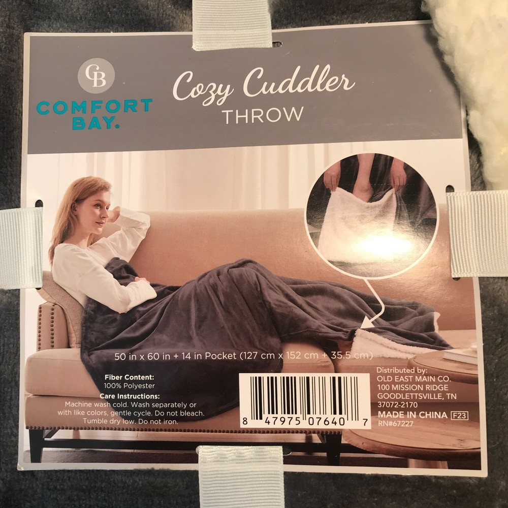 Snuggle up with the Comfort Bay Cozy Cuddler 50 in x 60 in throw, perfect for any room in your home. Made from soft polyester material in a solid gray color, this rectangular shaped throw features a 14 in pocket for added convenience. Ideal for all seasons, this throw blanket is machine washable and tumble dryable for easy care and maintenance. Whether you're reading a book or watching TV, this Comfort Bay Cozy Cuddler is sure to keep you warm and cozy.