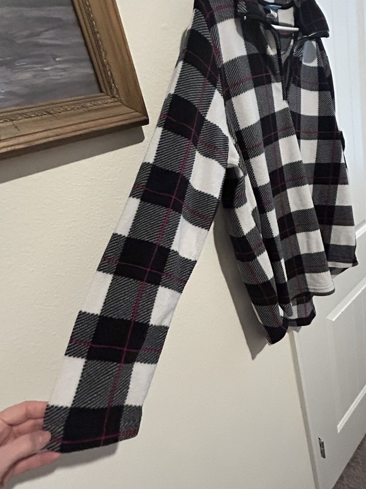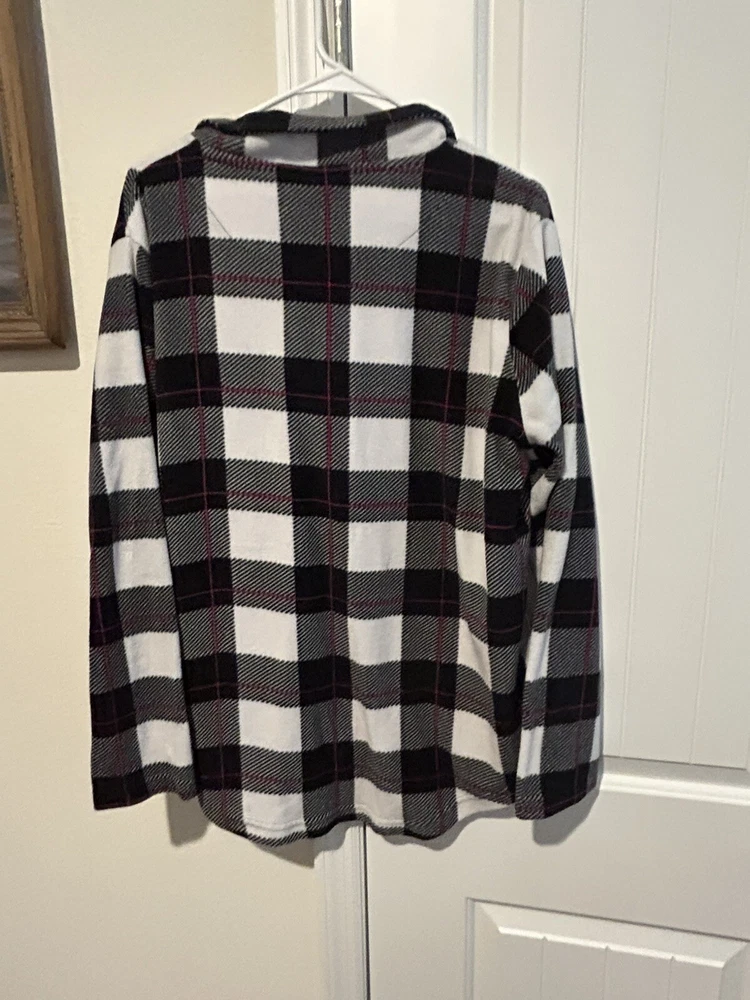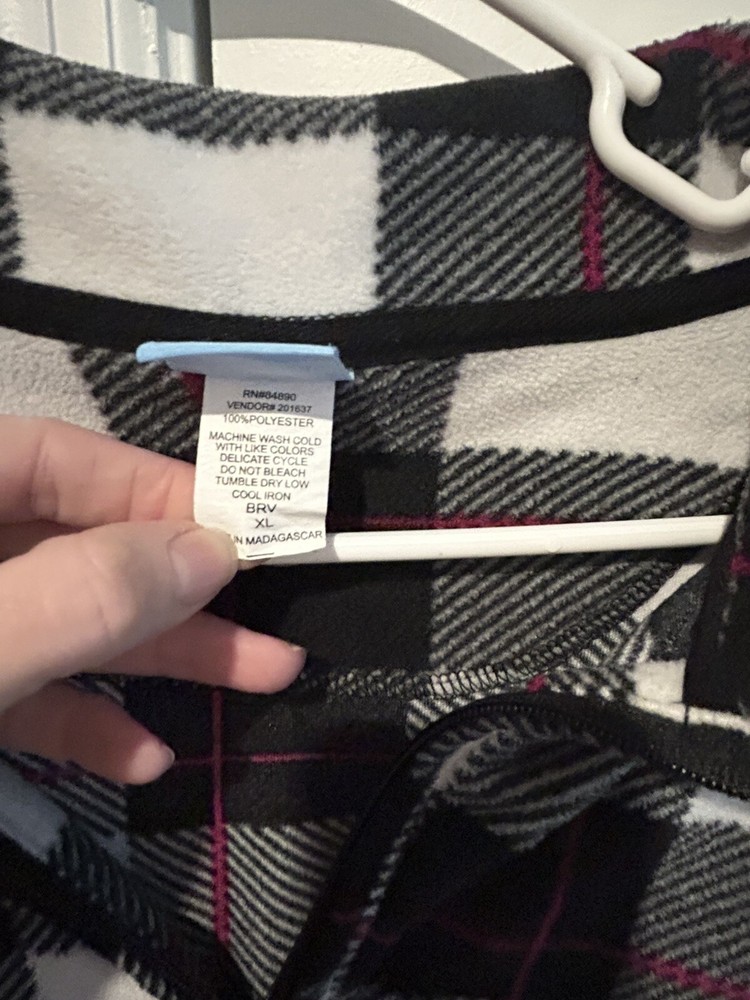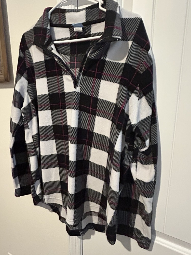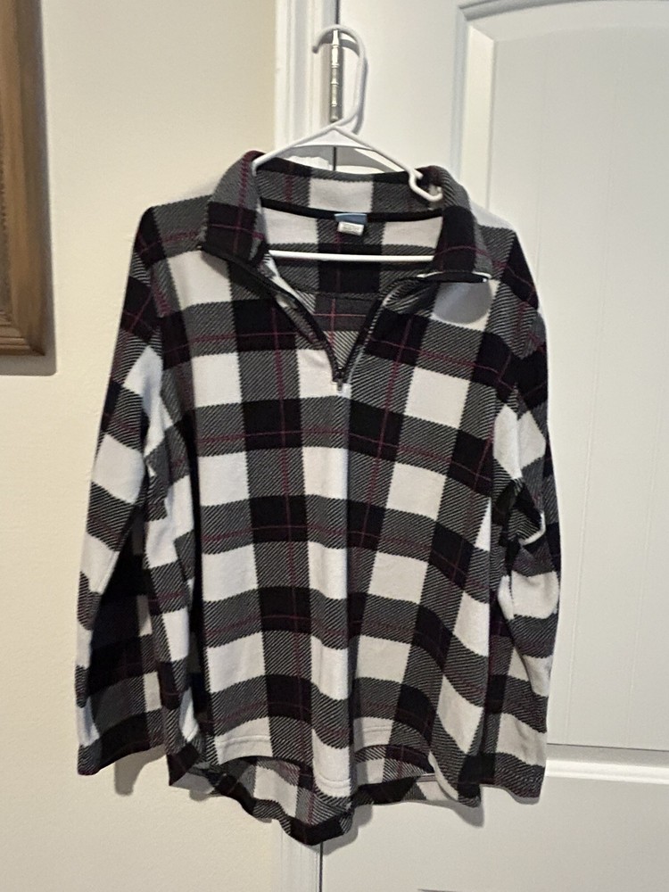 This Black & White brand sweatshirt in size XL features a cozy fleece fabric in a black, red, and white plaid pattern. The pullover style has a 1/4 zip closure and long sleeves, making it a comfortable and lightweight option for activewear. The colorful design adds a touch of vibrancy to the piece, perfect for adding some personality to your casual outfit rotation.