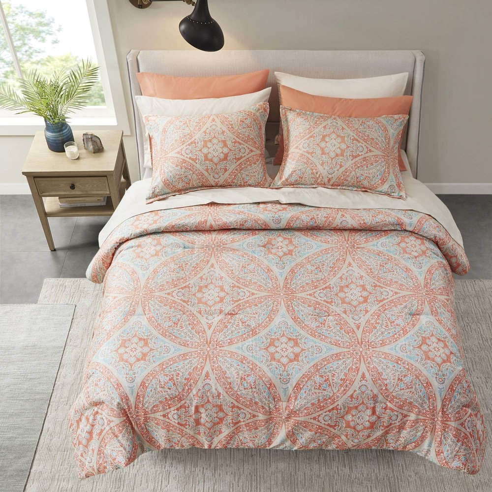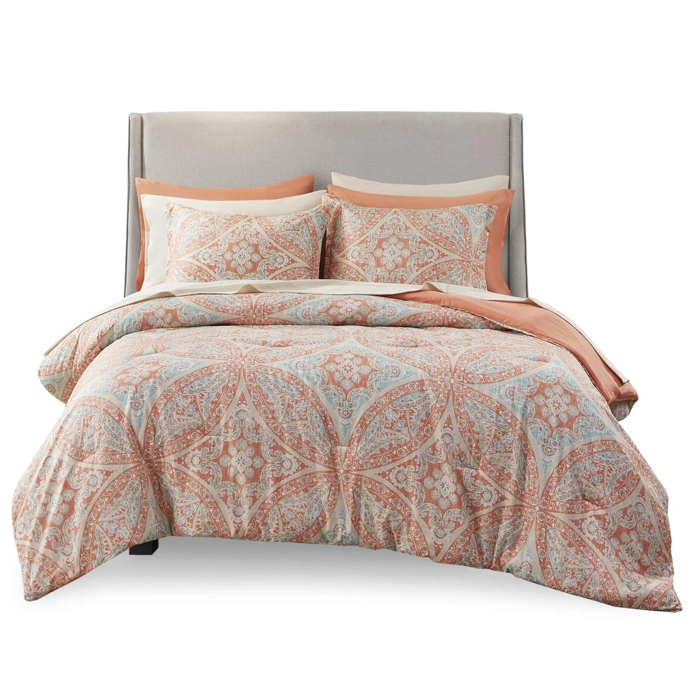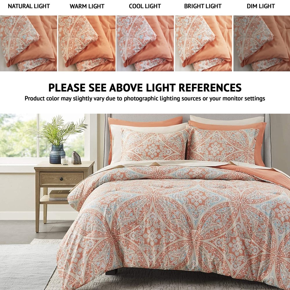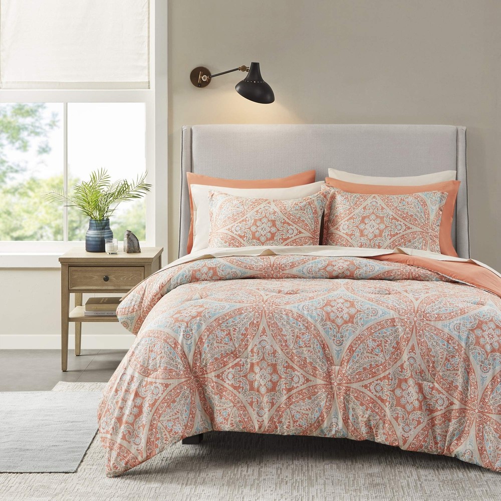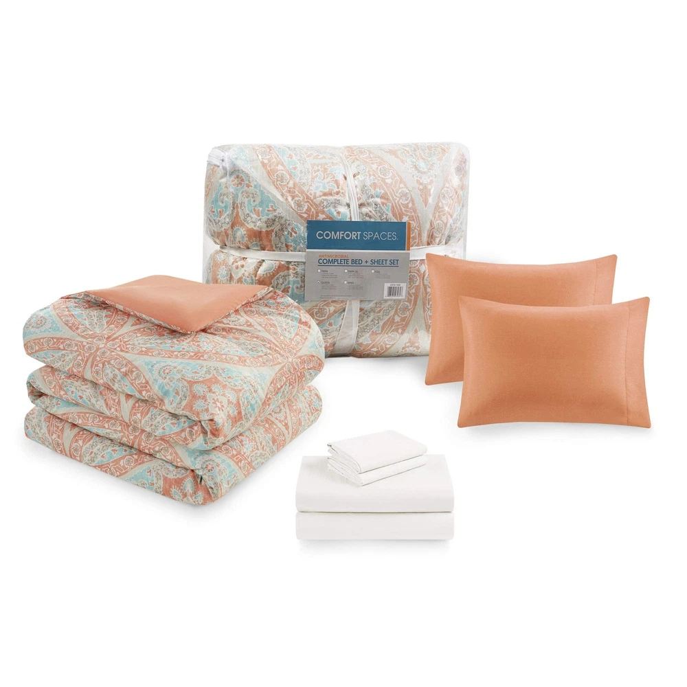 Comfort Spaces Bed in A Bag - Trendy Casual Design Cozy Comforter with Complete Sheet Set with Side Pocket, All Season Cover, Matching Shams, Full(80"x90"), Gloria, Damask Coral 9 Piece Product Details Color: Damask Coral Size: Full(80"x90") Brand: Comfort Spaces MPN: CS10-1308 UPC: 086569439680 EAN: 0086569439680 Size: Full(80"x90") Included Components: 1 Comforter, 2 Standard Shams, 1 Flat Sheet, 1 Fitted Sheet, 4 Standard Pillowcases Color: Damask Coral Style: Modern Brand: Comfort Spaces Size: Full(80"x90") Included Components: 1 Comforter, 2 Standard Shams, 1 Flat Sheet, 1 Fitted Sheet, 4 Standard Pillowcases Color: Damask Coral Style: Modern Brand: Comfort Spaces Theme: Modern,Damask Pattern: Solid Material: Microfiber Fabric Type: 100% Microfiber Number of Pieces: 9 Seasons: All Product Care Instructions: Machine Wash Manufacturer: E&E Co. Ltd DBA JLA Home UPC: 086569439680 Item dimensions L x W x H: 90 x 80 x 1.5 inches Product Dimensions: 90 x 80 x 1.5 inches Item Weight: 7.63 pounds Department: unisex-adult Country of Origin: China Item model number: CS10-1308 Assembly required: No Batteries required: No 100% Microfiber The Comfort Spaces Gloria Complete Bed in a Bag Set offers an eye-catching and modern update to match your bedroom decor. For your convenience the fitted sheet comes with a side pocket on each side for extra bedside storage that's perfect for your small electronic devices. Set includes: 1 Comforter: 80"W x 90"L, 2 Standard Shams: 20"W x 26"L, 1 Flat Sheet: 81"W x 96"L, 1 Fitted Sheet: 54"W x 75"L plus 15"D, 4 Standard Pillowcases: 20"W x 30"L Care instructions: Machine wash cold on gentle cycle, tumble dry on low heat, wash alone USING LARGE CAPACITY COMMERCIAL WASHER/DRYER, do not bleach. The Comfort Spaces Gloria Complete Bed in a Bag Set offers an eye-catching, modern update to match your bedroom décor. An intricate medallion pattern that repeats across the top of bed and a solid coral reverse creates two distinct looks for your bed. The ultra-soft medallion print sham and solid coral pillowcase coordinate with this comfortable bedding set to complete the modern style look of your bedroom. Also included is a complete sheet set in solid ivory that features a fitted sheet with a side pocket on each side for extra bedside storage. SERVICE - If you don't absolutely love this product, return it within 30 days for a full refund. We'll work with you to resolve any issue and ensure that you're satisfied with your experience.