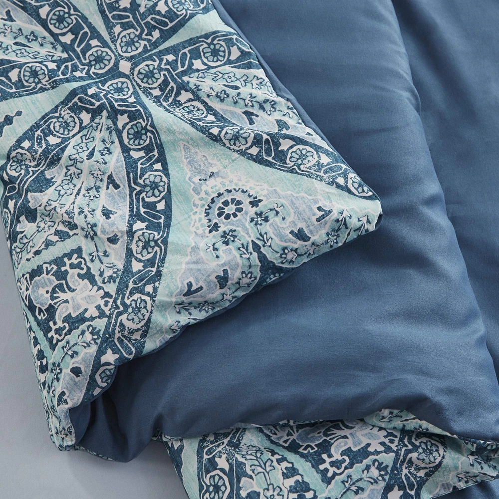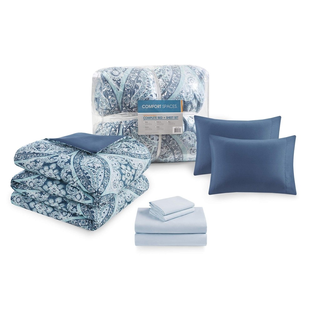 Comfort Spaces Bed in A Bag - Trendy Casual Design Cozy Comforter with Complete Sheet Set with Side Pocket, All Season Cover, Matching Shams, Full(80"x90"), Gloria, Damask Blue 9 Piece Product Details Size: Full Color: Damask Blue Brand: Comfort Spaces MPN: CS10-1300 UPC: 086569439635 EAN: 0086569439635 Size: Full Included Components: 1 Comforter, 2 Standard Shams, 1 Flat Sheet, 1 Fitted Sheet, 4 Standard Pillowcases Color: Damask Blue Style: Modern Brand: Comfort Spaces Size: Full Included Components: 1 Comforter, 2 Standard Shams, 1 Flat Sheet, 1 Fitted Sheet, 4 Standard Pillowcases Color: Damask Blue Style: Modern Brand: Comfort Spaces Theme: Modern,Damask Pattern: print Material: Microfiber Fabric Type: 100% Microfiber Number of Pieces: 9 Seasons: All Product Care Instructions: Machine Wash Manufacturer: E&E Co. Ltd DBA JLA Home UPC: 086569439635 Item dimensions L x W x H: 90 x 80 x 1.5 inches Product Dimensions: 90 x 80 x 1.5 inches Item Weight: 7.96 pounds Department: unisex-adult Country of Origin: China Item model number: CS10-1300 Assembly required: No Batteries required: No 100% Microfiber The Comfort Spaces Gloria Complete Bed in a Bag Set offers an eye-catching and modern update to match your bedroom decor. For your convenience the fitted sheet comes with a side pocket on each side for extra bedside storage that's perfect for your small electronic devices. Set includes: 1 Comforter: 80"W x 90"L, 2 Standard Shams: 20"W x 26"L, 1 Flat Sheet: 81"W x 96"L, 1 Fitted Sheet: 54"W x 75"L plus 15"D, 4 Standard Pillowcases: 20"W x 30"L Care instructions: Machine wash cold on gentle cycle, tumble dry on low heat, wash alone USING LARGE CAPACITY COMMERCIAL WASHER DRYER, do not bleach. The Comfort Spaces Gloria Complete Bed in a Bag Set offers an eye-catching and modern update to match your bedroom décor. An intricate medallion pattern that repeats across the top of bed and a solid blue reverse creates two distinct looks for your bed. The ultra-soft medallion print sham and solid blue pillowcase coordinate with this comfortable bedding set to complete the modern style look of your bedroom. Also included is a complete sheet set in solid blue that features a fitted sheet with a side pocket on each side for extra bedside storage. SERVICE - If you don't absolutely love this product, return it within 30 days for a full refund. We'll work with you to resolve any issue and ensure that you're satisfied with your experience.
