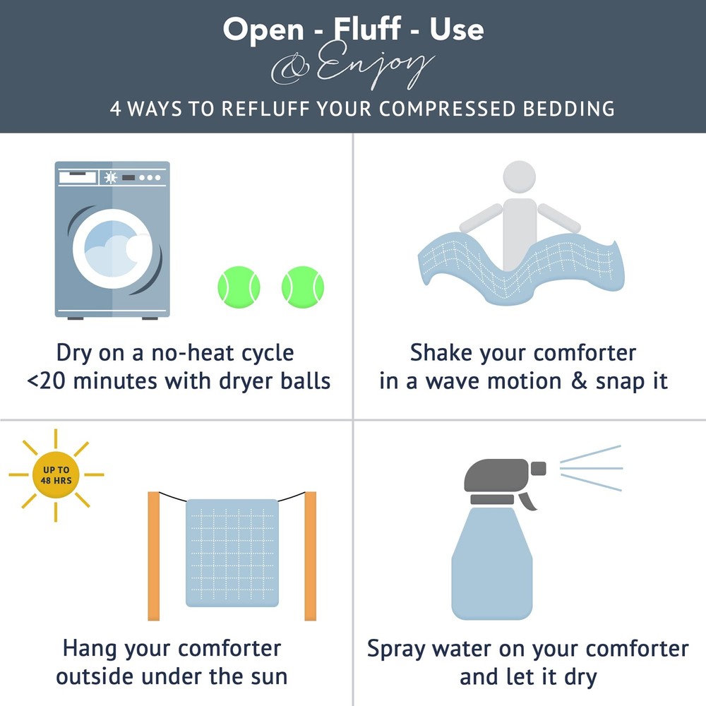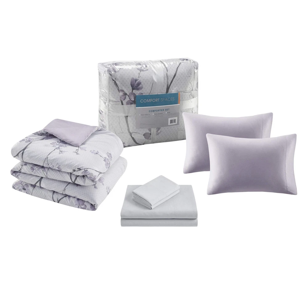 The Comfort Spaces Kate Complete Bed in a Bag Set offers a refreshing feminine and modern floral update to your beddrom décor Kate comforter set offers feminine allure of floral in soft purple hue bedding set paired with brushed soft microfiber and lightweight cover for all season comfort For your convenience the fitted sheet comes with a side pocket on each side for extra bedside storage that's perfect for your small electronic devices. Set includes: 1 Comforter: 90"W x 90"L, 2 Standard Shams: 20"W x 26"L, 1 Flat Sheet: 90"W x 102"L, 1 Fitted Sheet: 60"W x 80"L + 15"D, 4 Pillowcases: 20"W x 30"L Care instructions: Machine Wash